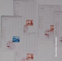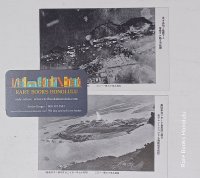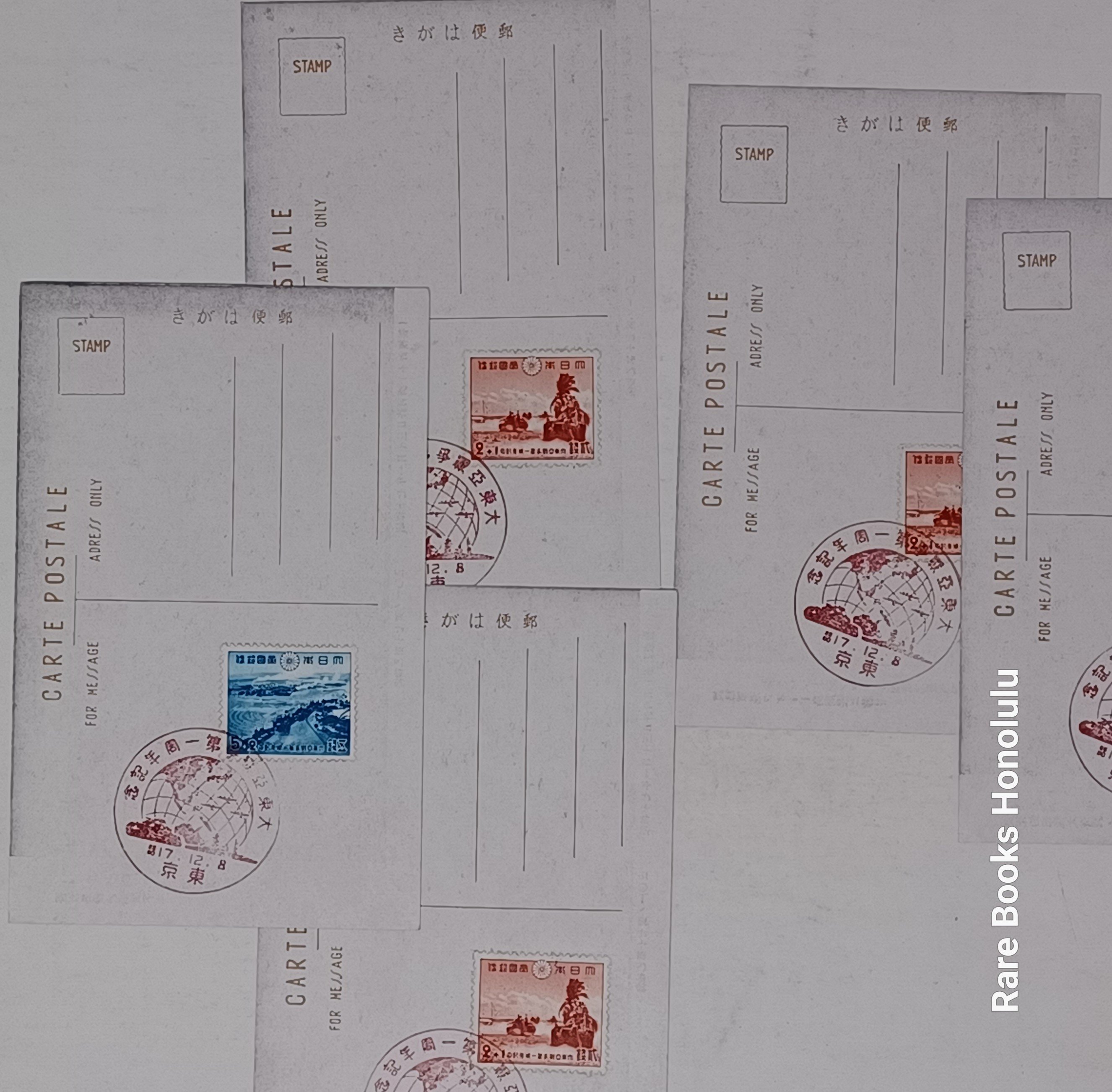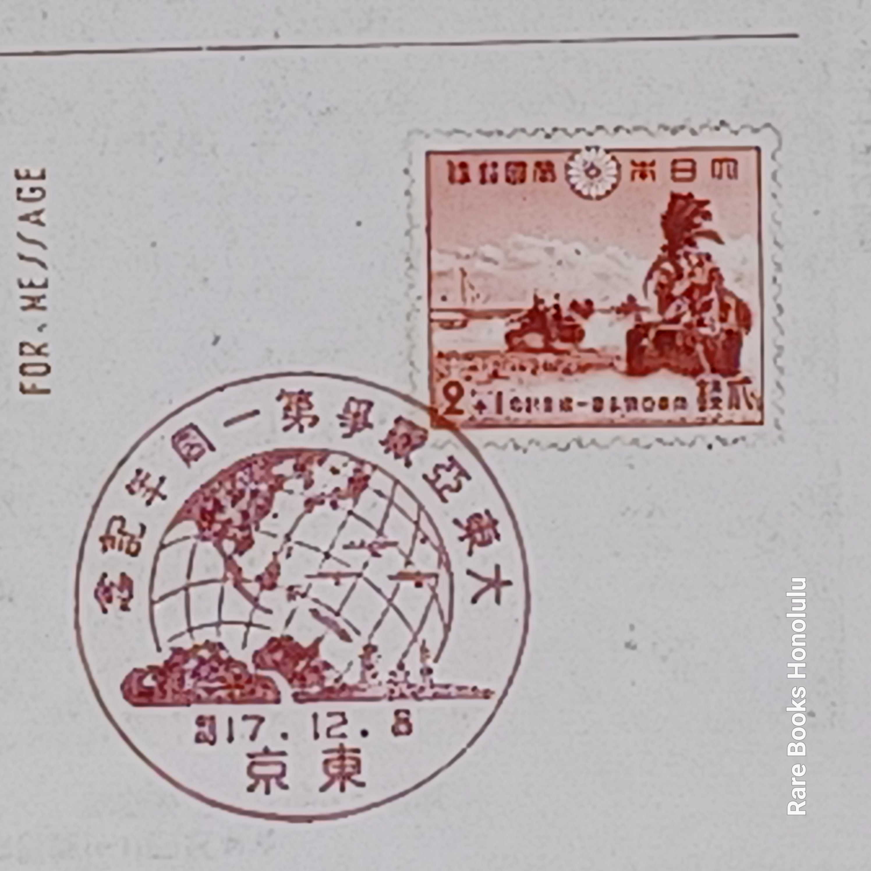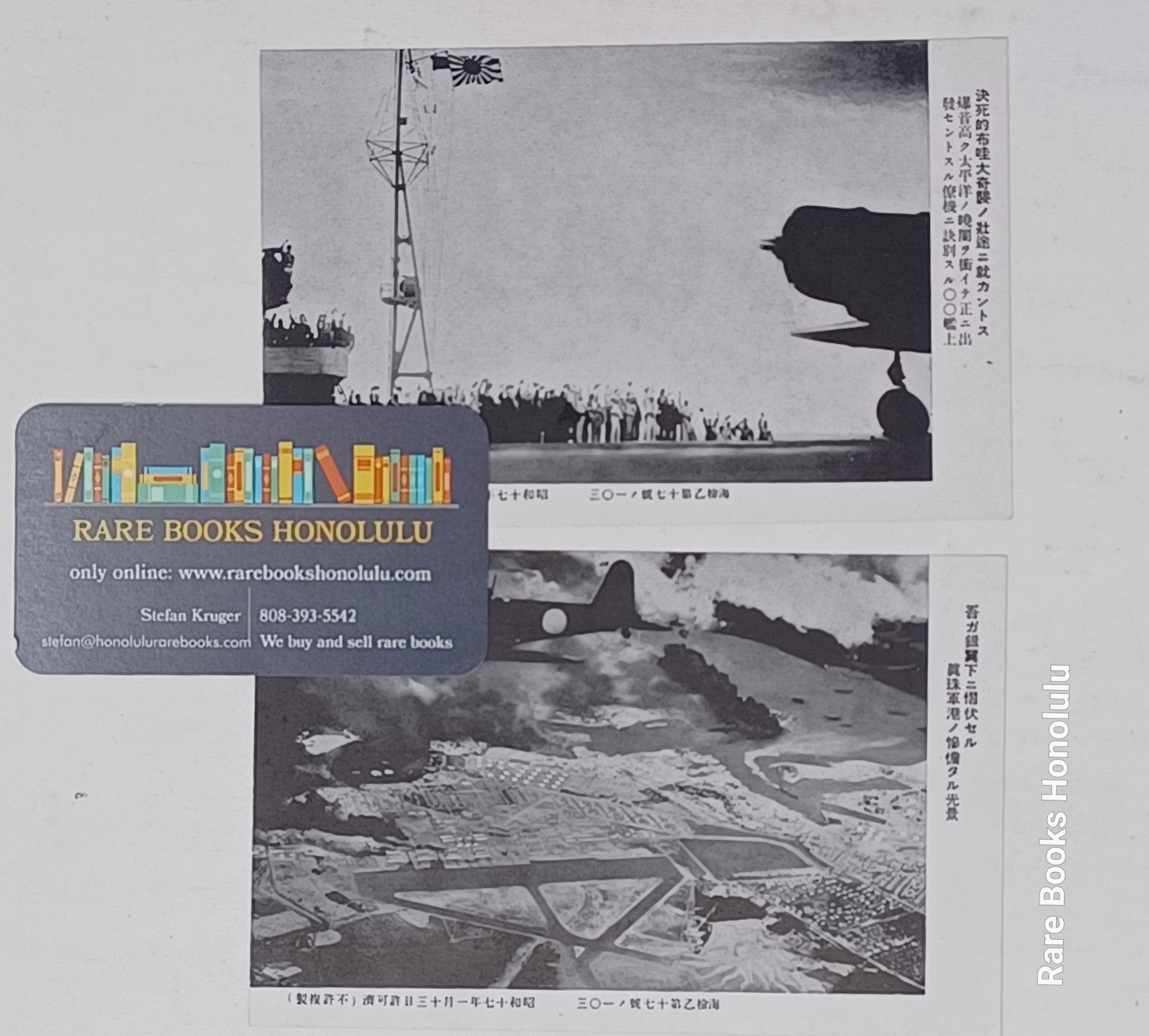 5 black and white photographic illustration post cards with commemorative stamps and postmarks, 9 x 14 cm each, in original color pictorial envelope (18.5 x 10cm). Very good. A collection of five postcards depicting the Pearl Harbor attack with four black and white photographic illustrations of the bombing from the air and a fifth showing a scene aboard ship being waved off as it takes off. The envelope, with its striking colorful front cover, features an illustration of a Japanese plane dropping bombs on Hawaii. These postcards were likely published to commemorate the first anniversary of the successful attack. Each postcard bears commemorative stamps with postmarks dated December 8, 1942.