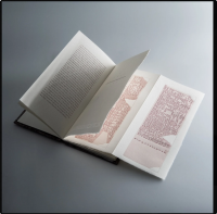 The book is printed letterpress on dampened Hahnemühle Biblio using a manually-operated Vandercook Universal proofing press. Multi-color printing appears on nearly every page. The binding is done entirely by hand, using papers painted specially for the edition. (No Reply Press)