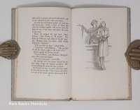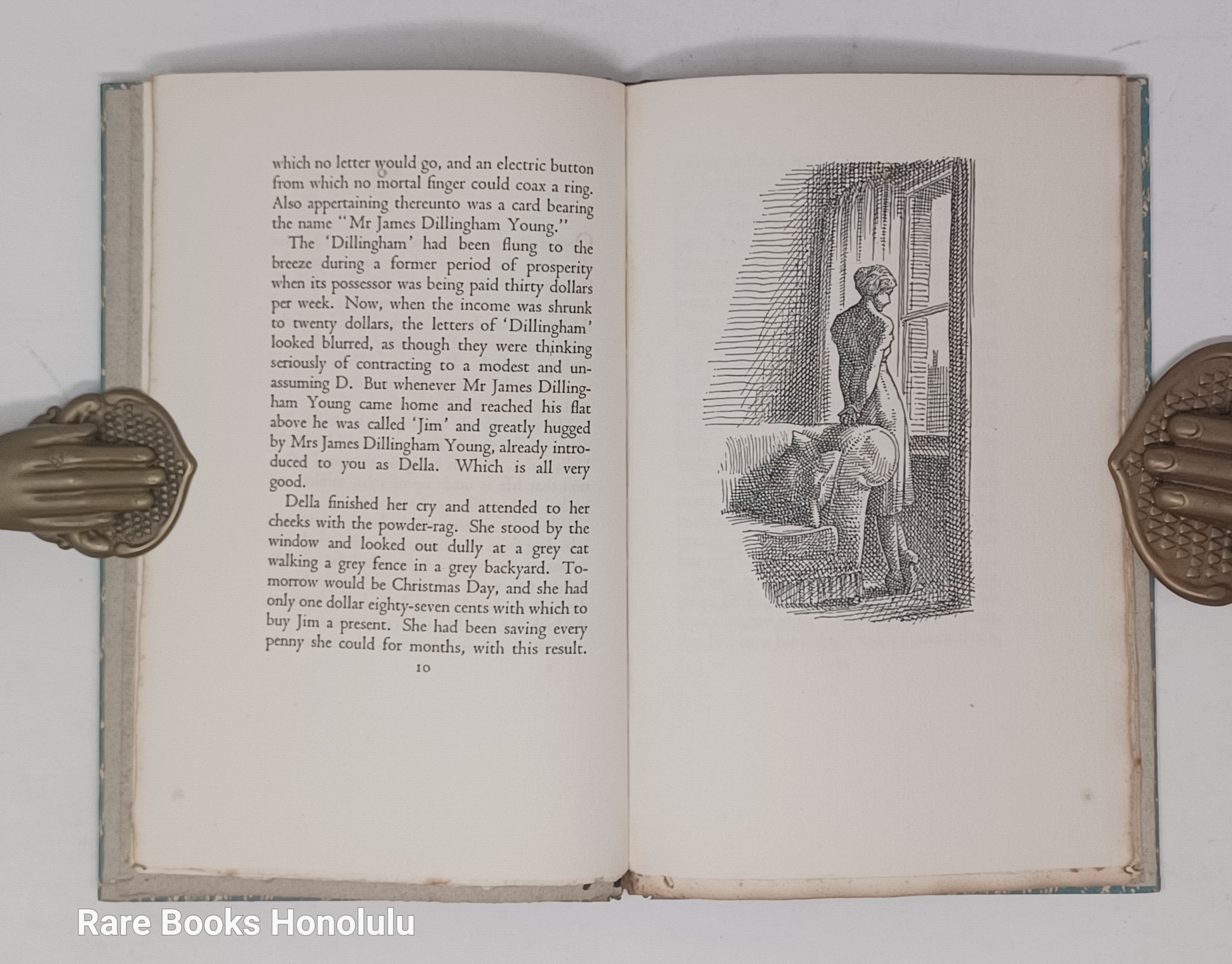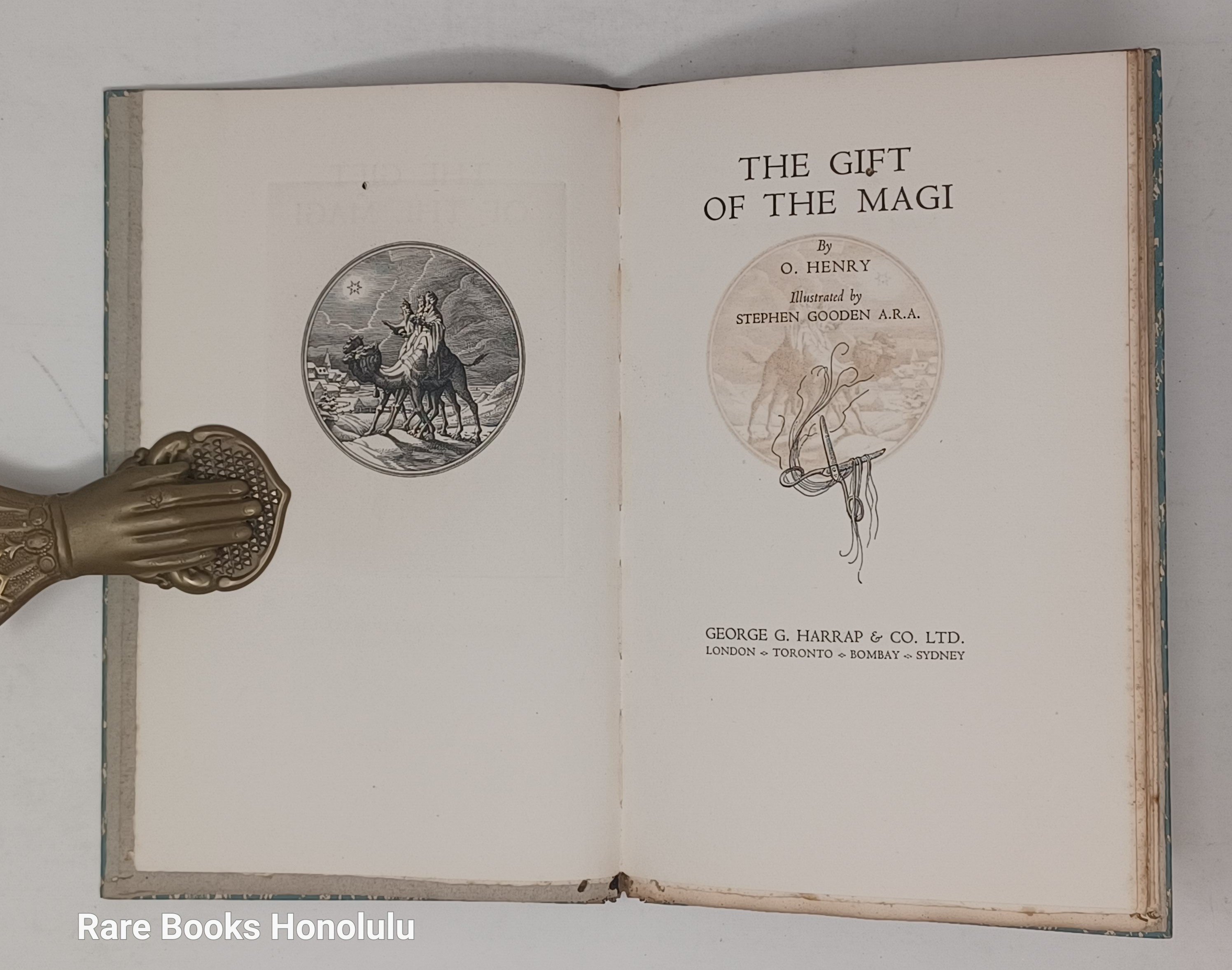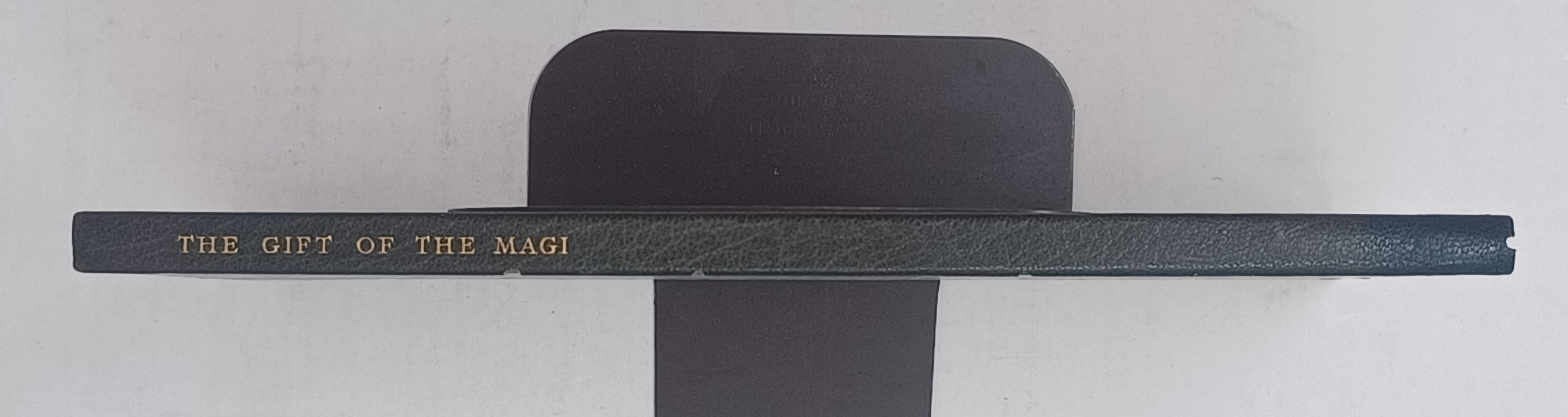 (PORTER, William Sidney). 'O. Henry'. The Gift of the Magi. London, Toronto etc.: George G. Harrap & Co., Ltd., 1939. Limited edition, this being number 79 of 105 copies signed by the illustrator Stephen Gooden, 9.5" x 6" (23.3x14.6cm.) Copper-engraved frontispiece, illustrations. .Original morocco-backed paper-covered boards. Some traces of bug damage: light scratches to the front board, a precise small hole that goes from the back board all the way through the book, just stopping before the front board. Occasionally affecting individual letters. Also some bug traces to the spine. Otherwise very good. Please see photos.