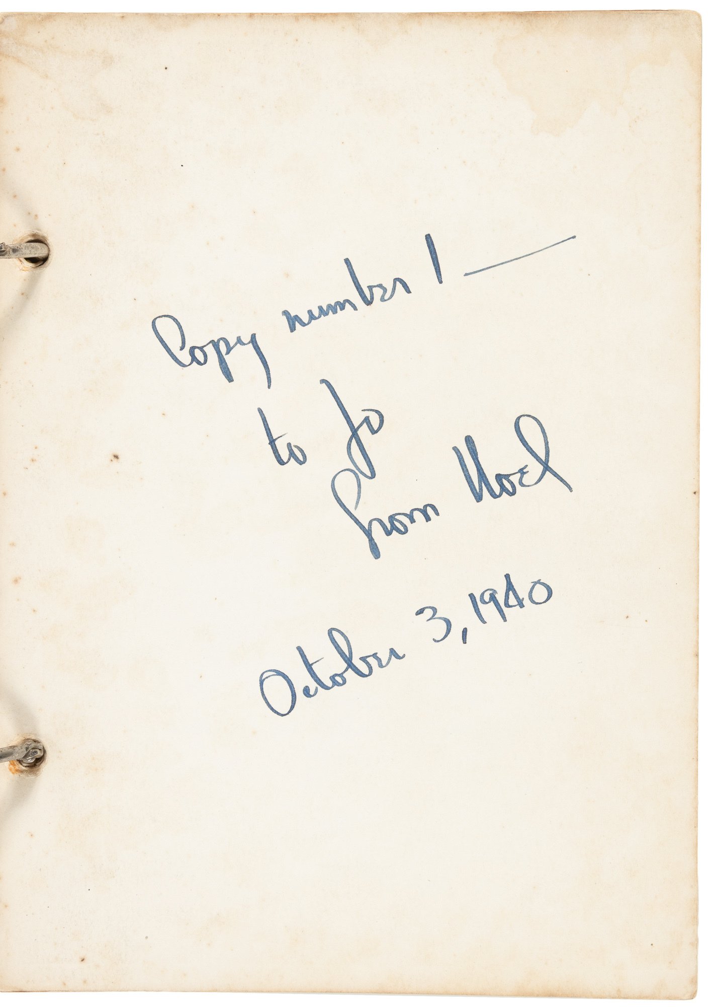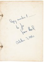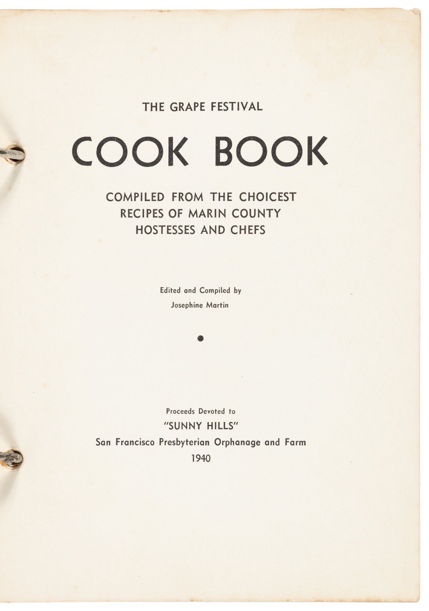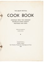 Presentation copy, being the first copy of the book, inscribed to the editor from the printer on the first page: "Copy number 1 - to Joel from Noel / October 3, 1940." The Grape Festival, held in Marin, began in 1899 to raise funds for "Sunny Hills," a Presbyterian orphanage in the hills of San Anselmo. At one time, the festival was Marin's premier charity event. Apparently, 1940 is the only year the festival issued a cookbook. Quite scarce.