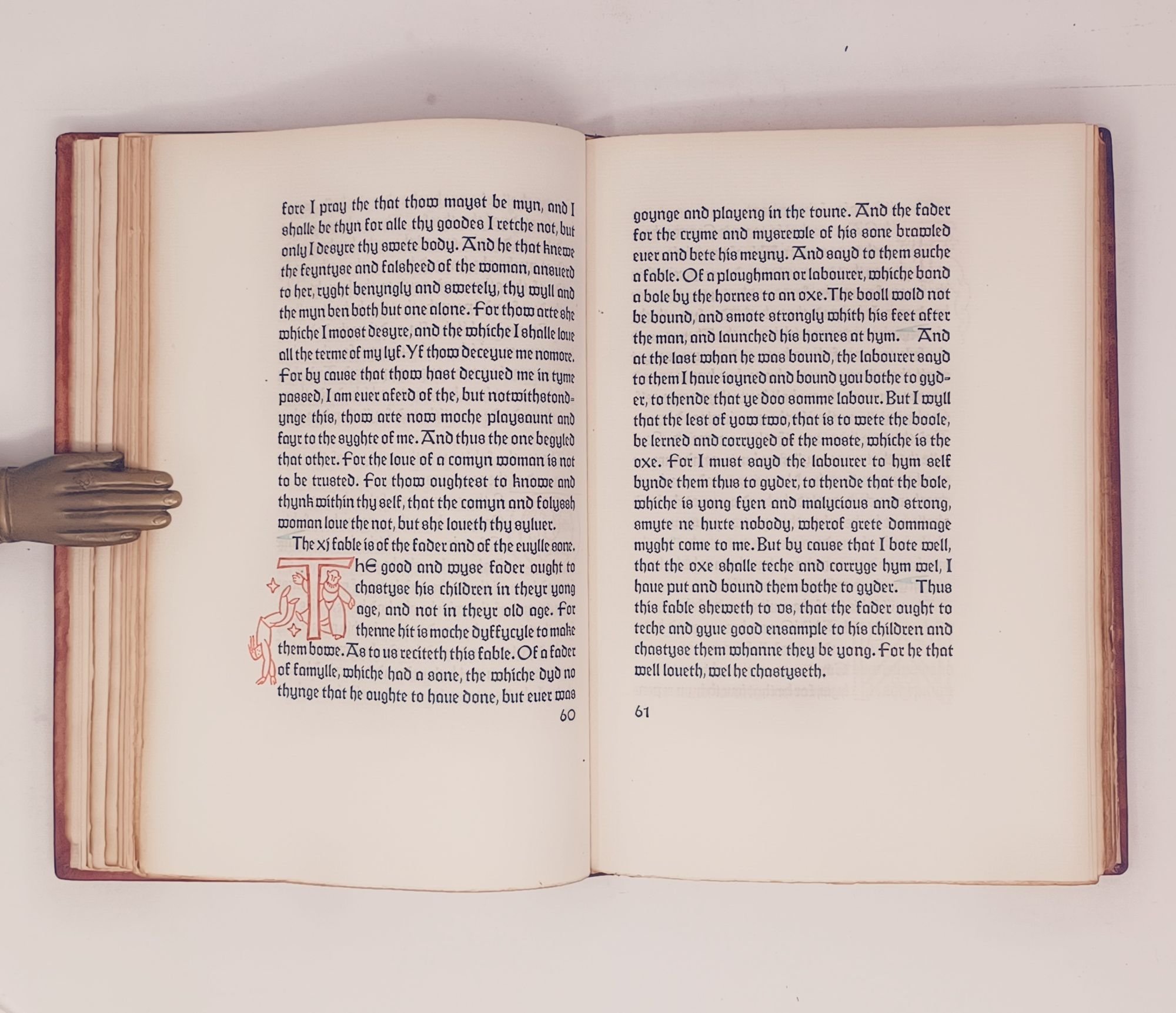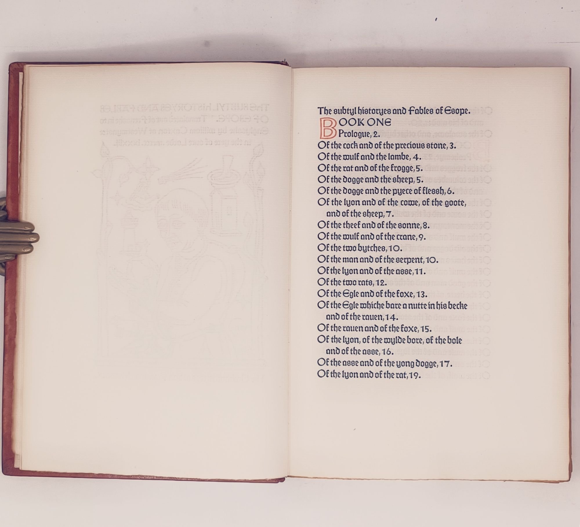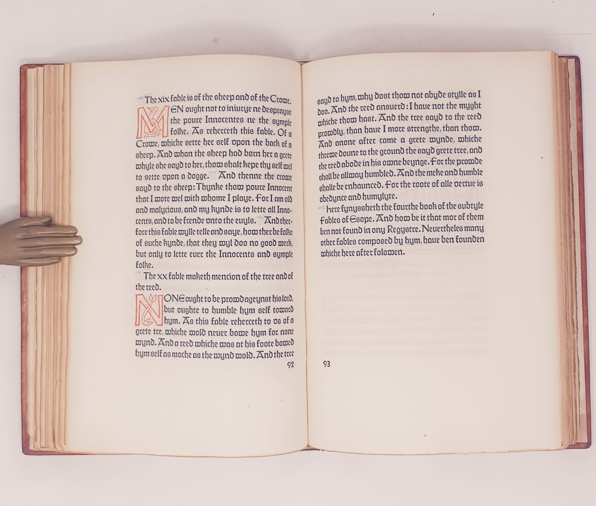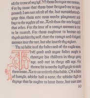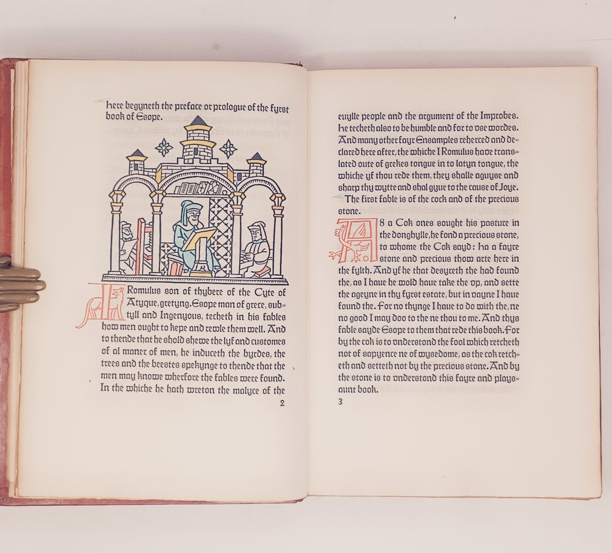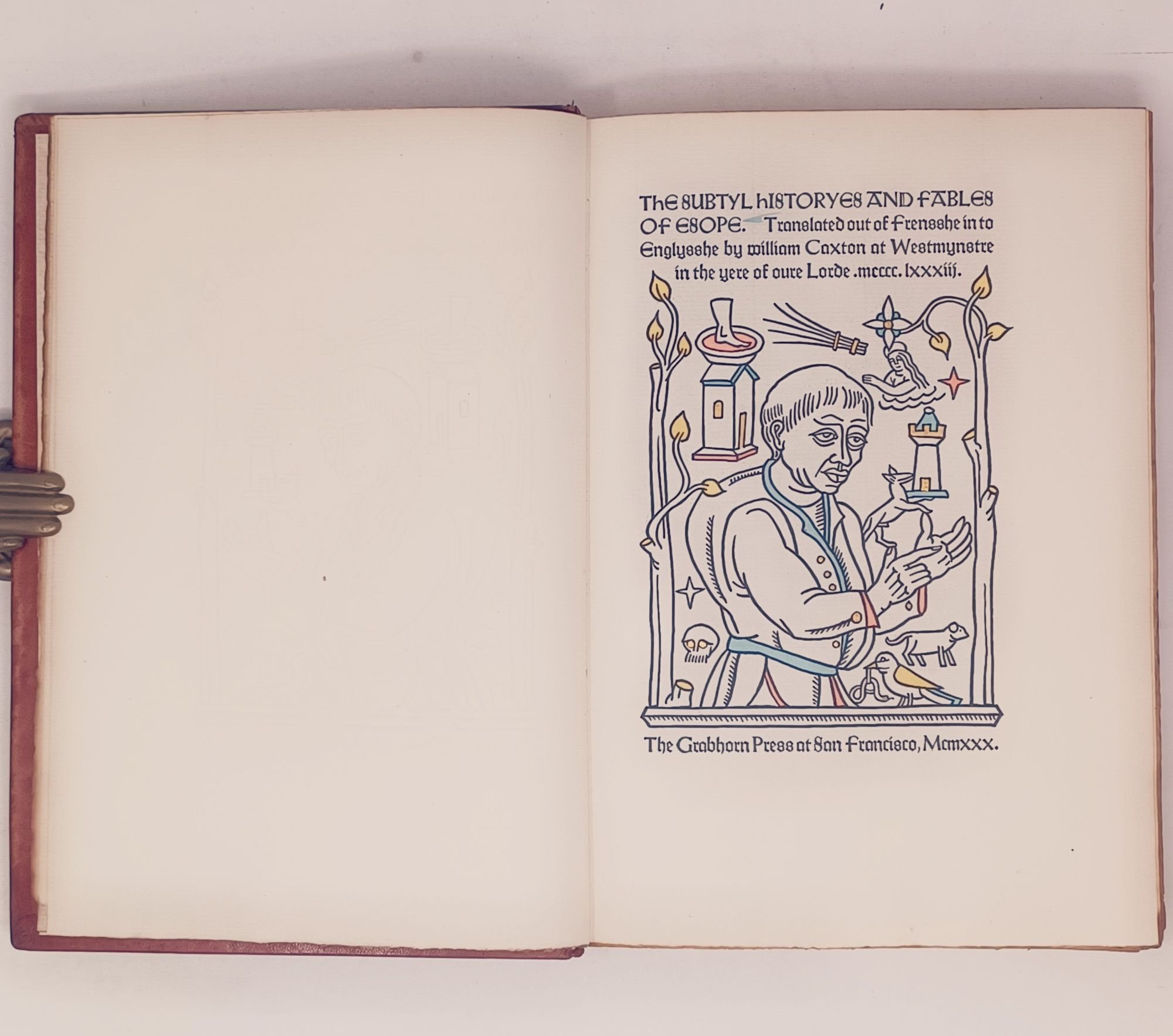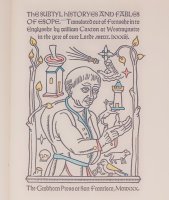 San Francisco: Grabhorn Press, (printed and bound by), 1930. 23 x 16cm. "Translated out of Frensshe in to Englysshe by William Caxton at Westmynstre in the yere of oure Lorde .mcccc.Ixxxiii." No. 149 of only 200 hand-numbered copies. [8], 167pp. Bound in full red morocco, with gilt title and five raised bands on spine and 1930 on the bottom of the spine. Woodcut initials and illustrations by Valenti Angelo, hand-colored by the artist. Printed in two colors, text (black) and the initials designed by Angelo printed in red.
