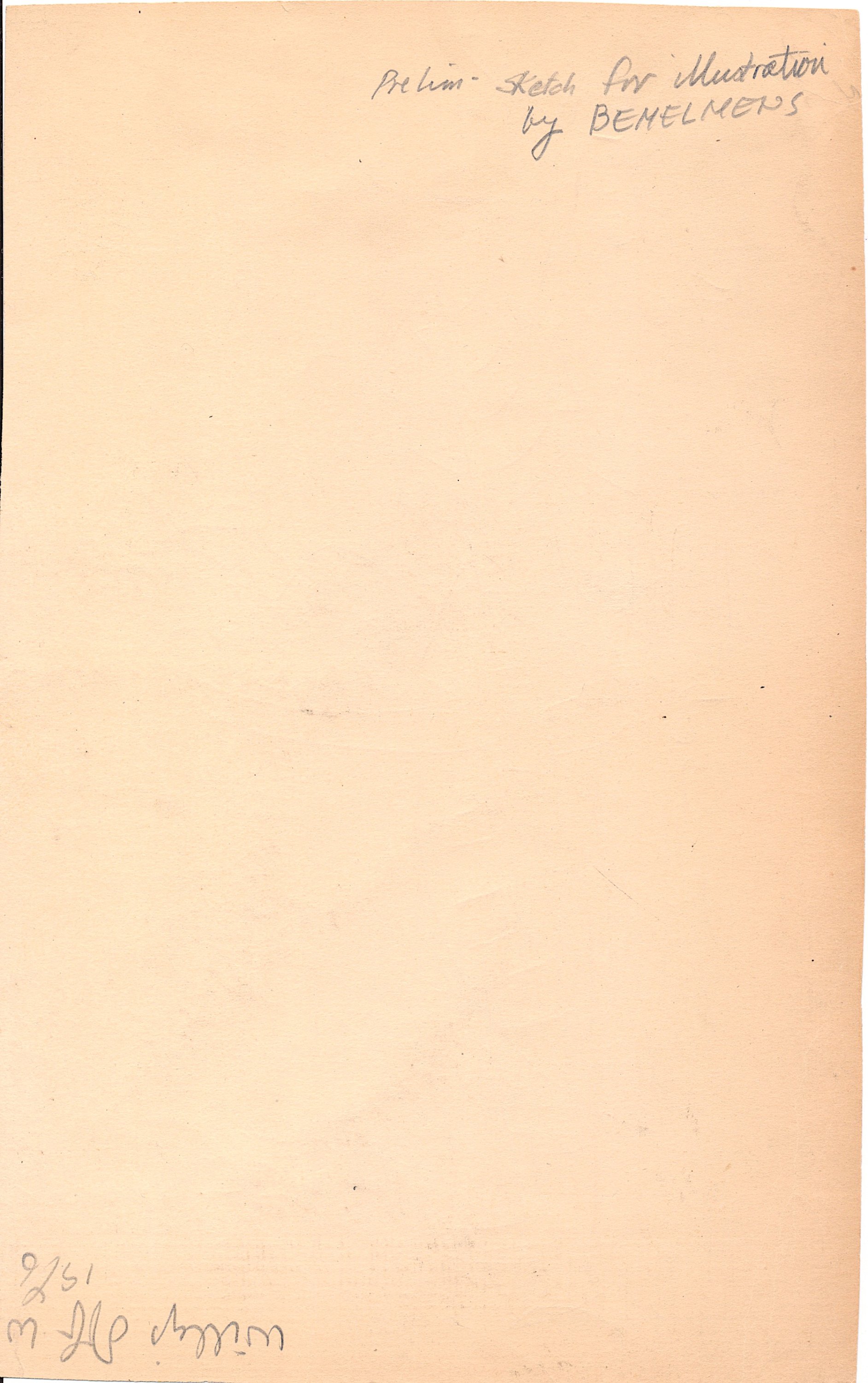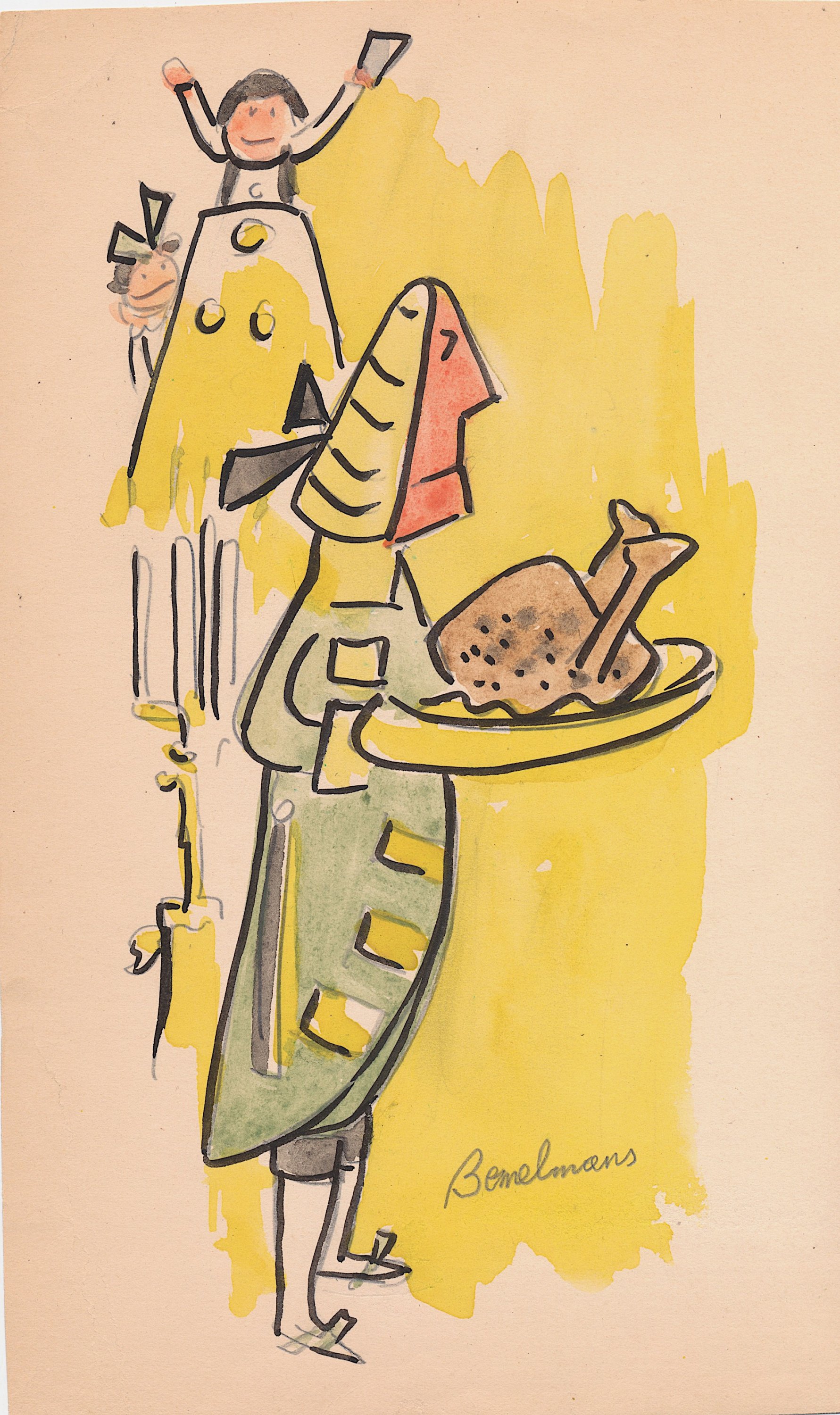 Bemelmans has drawn a sketch of an 18th century styled waiter holding a roasted fowl. Two smiling girls appear in the background. The drawing on unevenly cut sketch paper measures approximately 5 x 8 1/4/ and is rendered in gouache and ink, which Bemelmans typically used. He has signed in pencil near the waiter's feet. Docketed in pencil on verso, "Prelim sketch for illustration by Bemelmans" and another pencil notation in the opposite corner upside down, "Willys off..." Purchase directly from Schulsonautographs.com Item ID: 5084