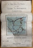 Faast, who hoped to transform the "cutover lands" (land that has been thoroughly logged without replanting or repurposing) of northern Wisconsin into a region of prosperous yeoman farmers. The company's promotional literature was designed to appeal to "urban workers, recent immigrants, and renting farmers. Faast portrayed farming in the Cutover region as a route to economic security and happiness.... To make his dream a reality, Faast believed that land dealers had to provide much more than the land itself" (Vogeler, Wisconsin, A Geography, 1986). He offered not only liberal payment terms, but "made to order" farm plans that showed where homes and outbuildings could be placed and what lands were suitable for pasture, hay, and crops. Erika Janik writes in the Wisconsin Magazine of History (Vol. 90, No. 4, 2007) that the company's ready-made farms were "one of the most ambitious of the era's rural reform ideals, intended to strengthen farm businesses, stabilize rural society, and revitalize land decimated by logging and mineral extraction." This prospectus, which is undated but likely from around 1920, includes details on 18 farms currently being offering in southern Sawyer counter. Each offering includes a written description and two small, hand-colored maps one showing the different soils on the property and the other showing the locations of fields, barns, houses, orchards, gardens, timber, etc. A hand-colored map on the cover shows the location of each farm relative to roads, railroad lines, and towns. Additional text includes description of eight soil types (connected to a key for interpreting the soil maps) and a one-page "General Report," which describes conditions in the region generally and points out the value added by the Wisconsin Colonization Company -- including "the construction of roads, the erecting of the first buildings, long term easy payments, the organization of community centers and clubs, and the services of a practical agricultural expert." (Walkabout Books)