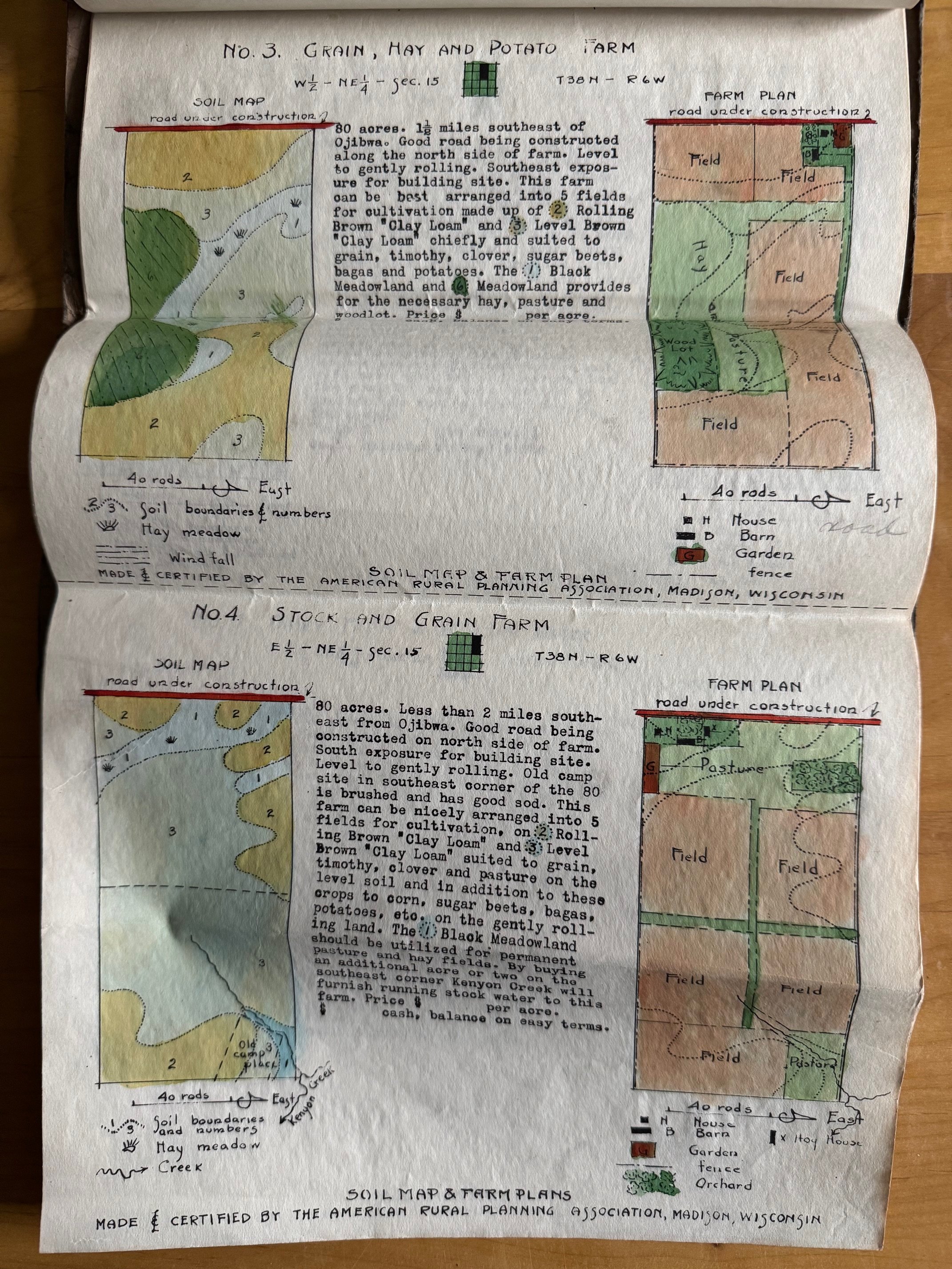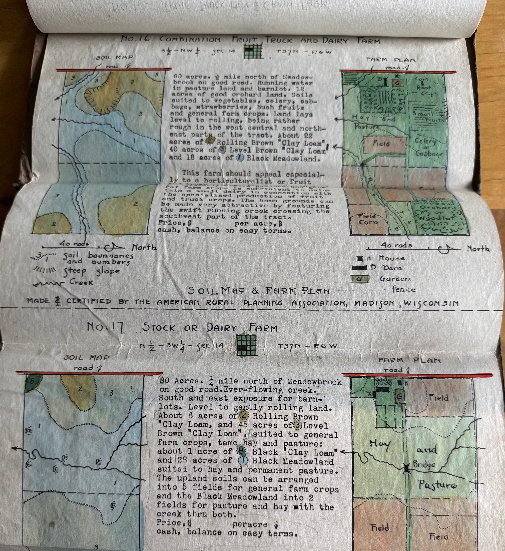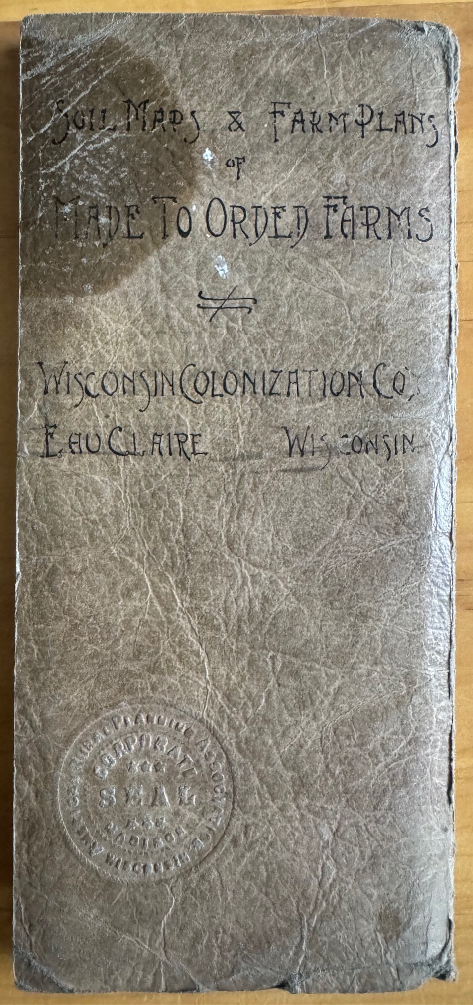 11 sheets of legal-sized (8.5 x 14 inches) paper secured by grommets at the top and folded into 8.75 x 4 inch paper covers with "Soil Maps & Farm Plans of Made to Order Farms, Wisconsin Colonization Co. Eau Claire, Wisconsin" written on the front. Covers worn and stained including 2 1/4 x 2 inch darkened area over portion of title but still legible. Blind embossed seal "American Rural Planning Association" on front. Contents are very good with light toning to edges and a dog-eared page and light edge wear.