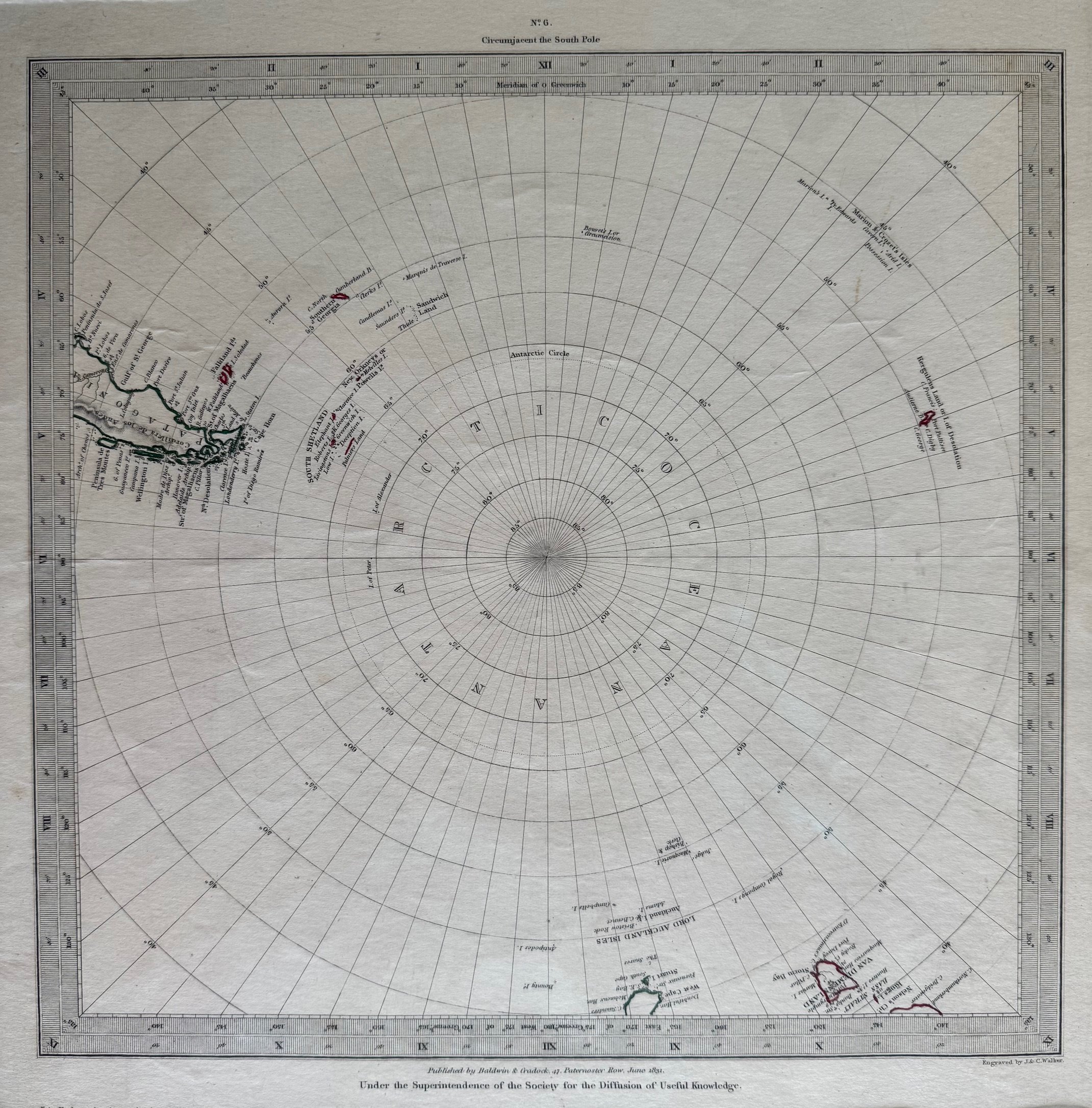 Circumjacent the South Pole Map No. 6, Published by Baldwin & Gradock, [London] under the Superintendence of the Society for the Diffusion of Useful Knowledge, June 1831. Engraved by J. & C. Walker. 16 x 13 inches. One sheet.