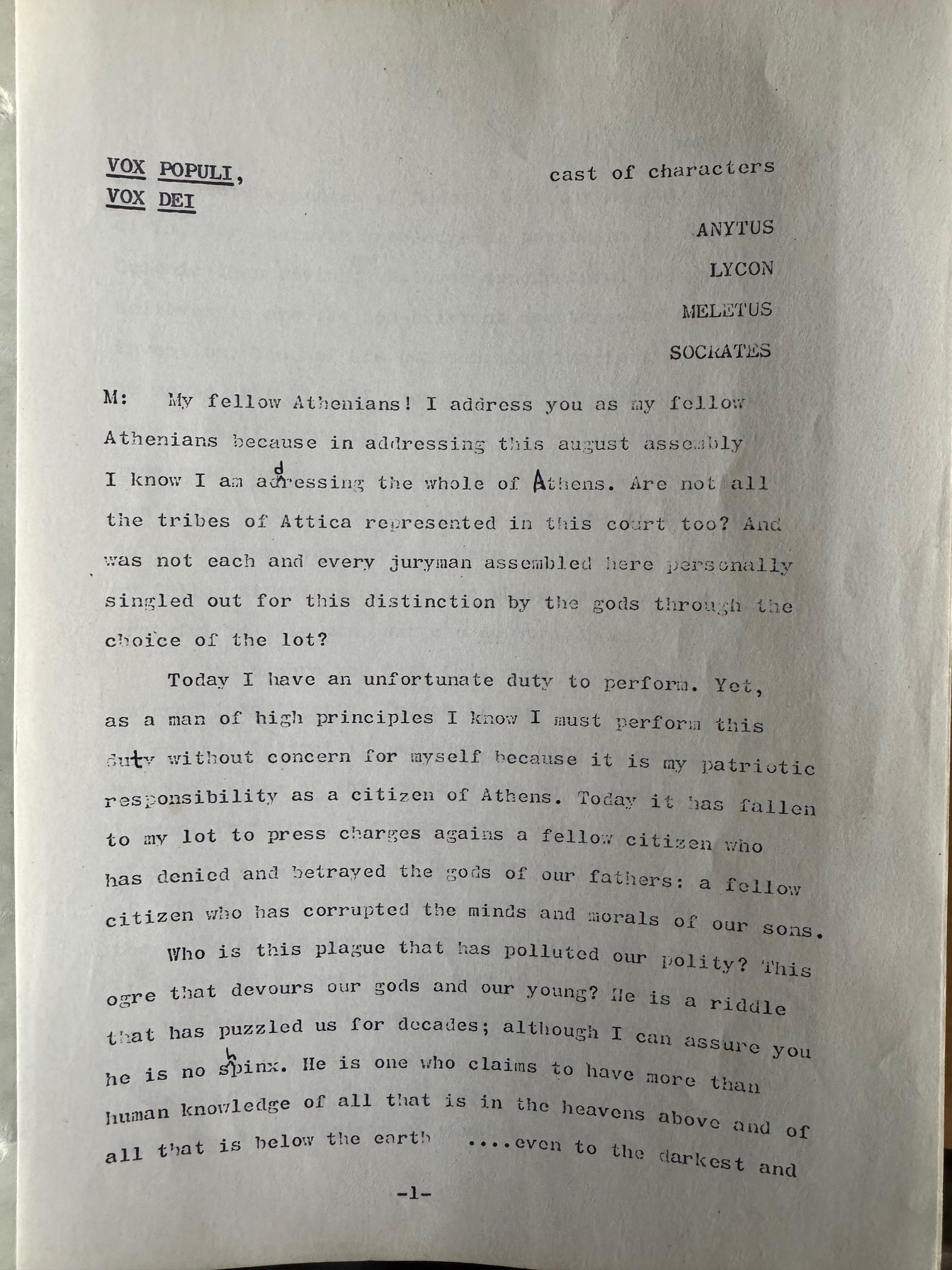 13. Vox Populi-Vox Dei, 52-page draft play, "acco"bound, whose characters are Angtus, Lycon, Meletus & Socrates, together with "Fideli Ad Urnam", a 62-page draft play featuring Plato & Socrates, "In Aqua Scribus in Arena Aedifucus, a 42-page draft play and "Consummation Est" also featuring Plato & Socrates