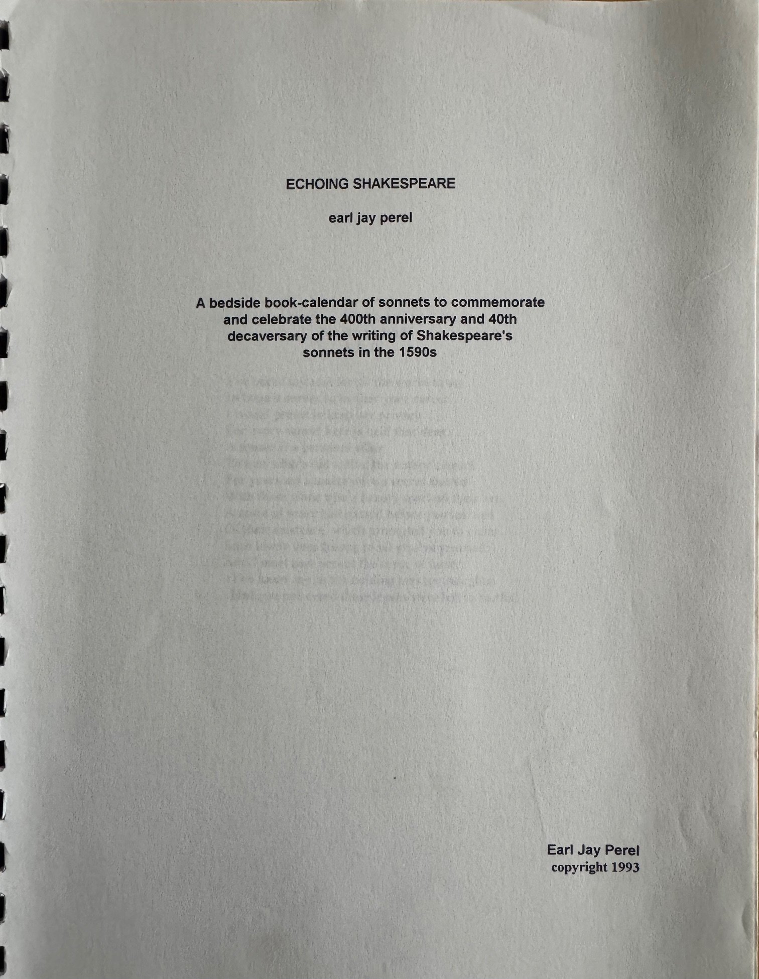 5. Echoing Shakespeare, 132-page spiral bound manuscript, copyright 1993 (2 copies). One copy has red and green marks in ink at the beginning of each entry. The half title reads "A bedside book-calendar of sonnets to commemorate and celebrate the 400th anniversary and the 40th decaversary of the writing of Shakespeare's sonnets in the 1590's."