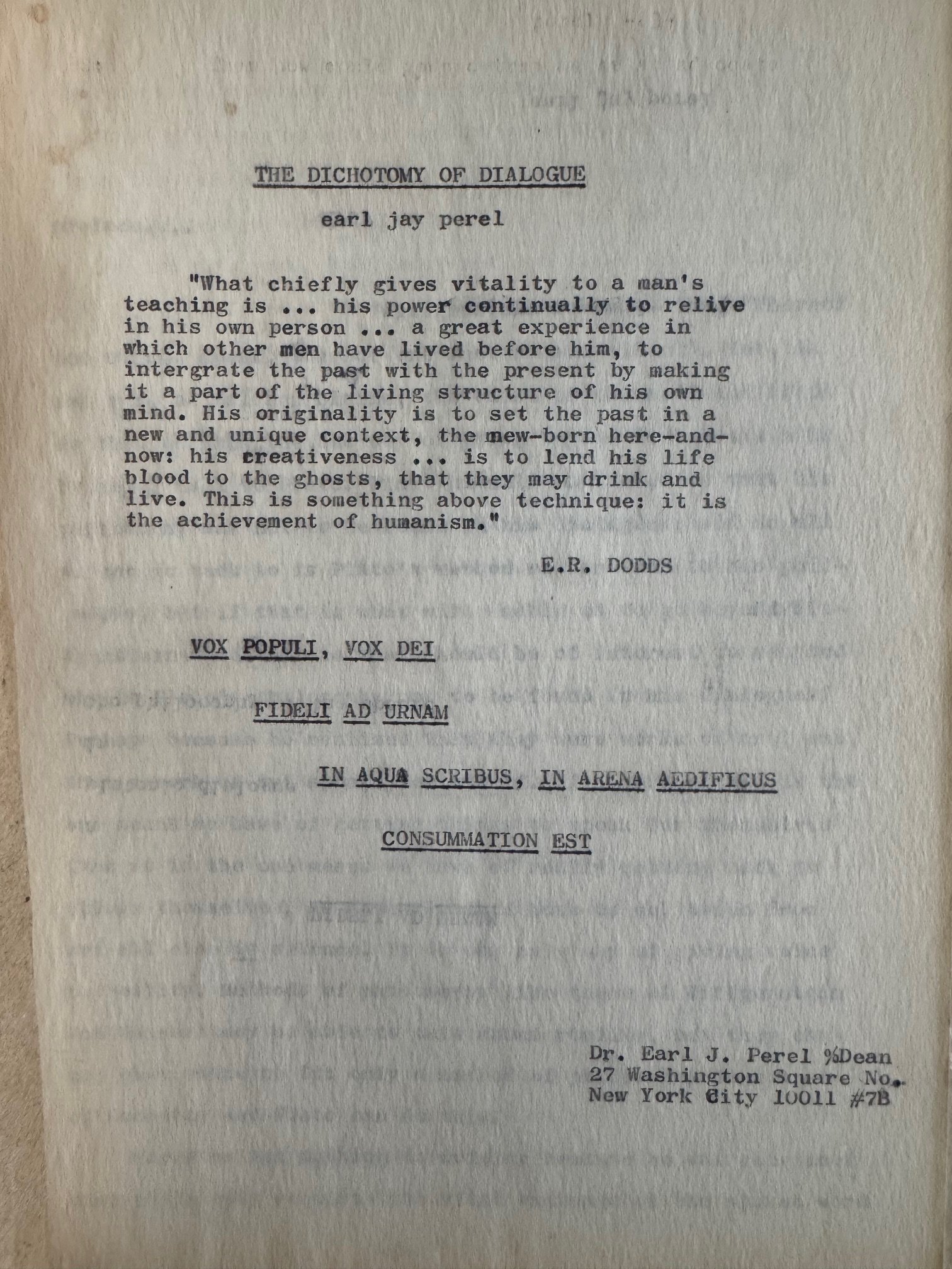 Archive of the late Earl Jay Perel. Perel was a teacher who retired and came to California in 1990. He served in the Marines, who spent his later years writing, mostly poetry and drama. His biographical entry appears on page 555 of Volume II in The Cervantes Encyclopedia by Howard Mancing. Several of his works were published in book form as noted below. His writing also received recognition in contests such as World Order of narrative and Formalist Poets and the Northern Michigan University Albert Panowski Playwriting Contest. He attracted the interest of the BBC, although production timing never seemed right. Earl Jay Perel has been published in The Lyric, The Formalist, Parnassus Literary Journal, The Pegasus Review, The Iconoclast and other journals including "Police Manipulations" in The Villager, September 16, 1976.