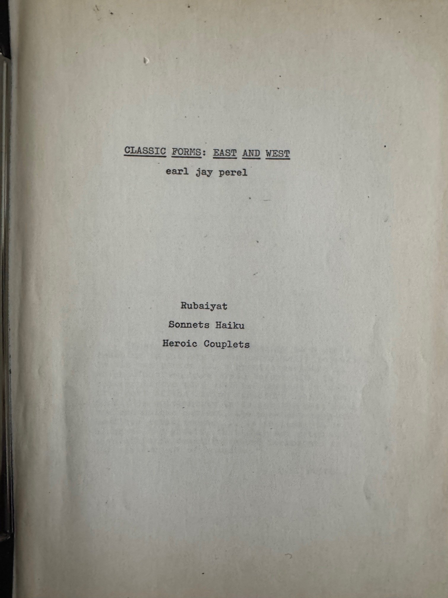 12. Classic Forms: East and Wes t, "acco" bound manuscript containing: "Responding Rubaiyit", "Sonnets Haiku" and "Heroic Couplets" together with "The Legend of Saint Lucy, Patroness of Syracuse-a 9-page poem.