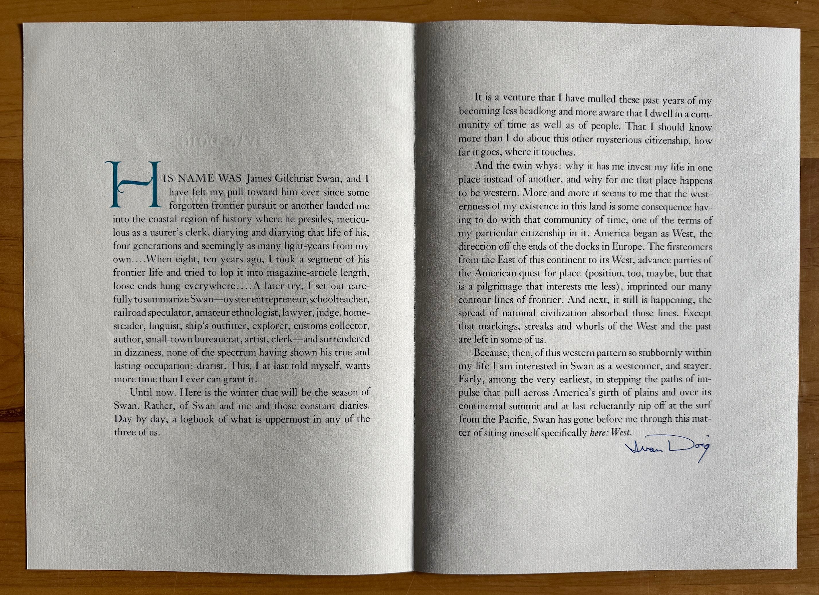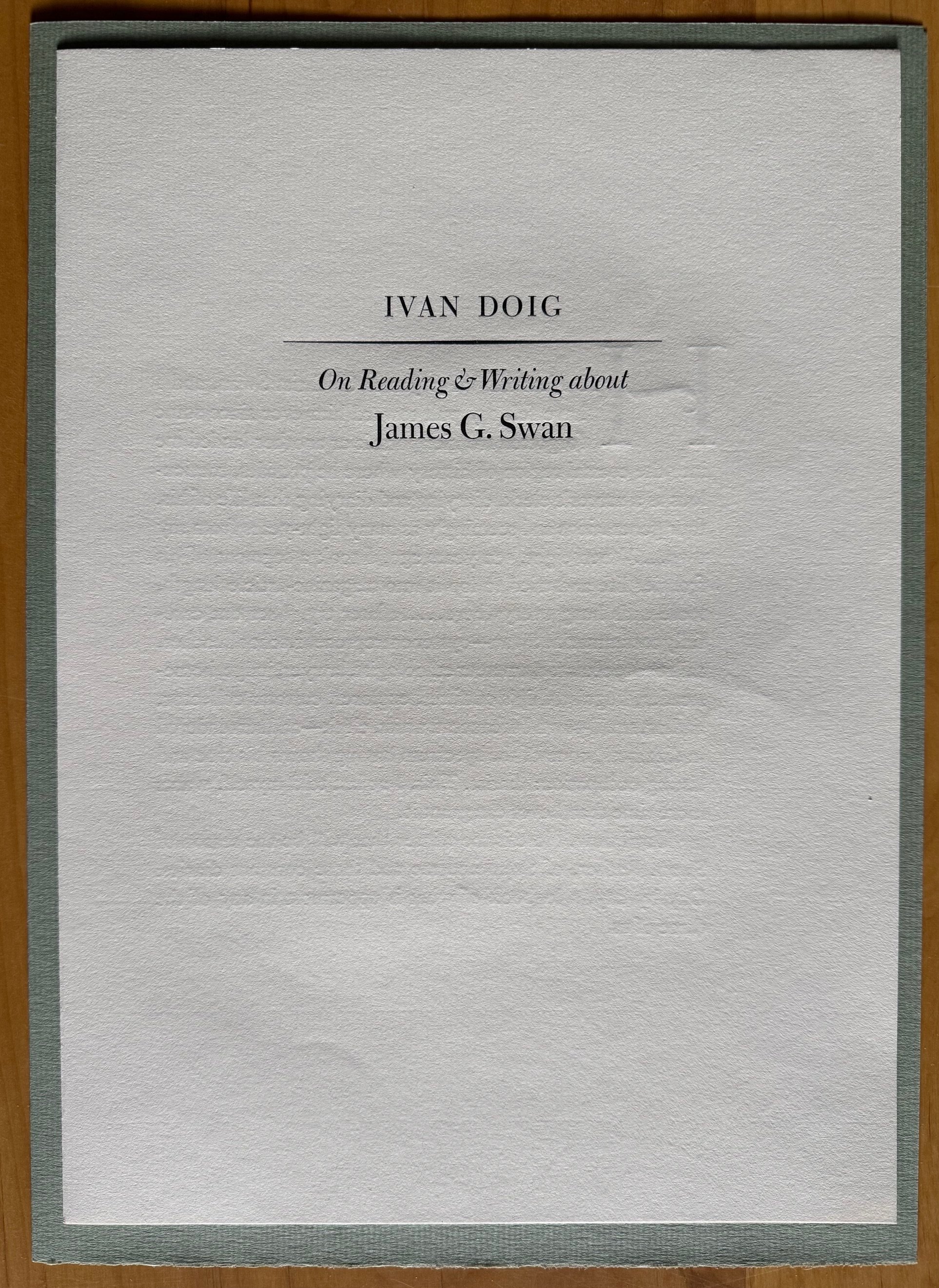 Limited edition of 200 copies printed for the Book Club of Washington, to remember Ivan Doig's address at a Membership Dinner, the College Club, Seattle, 28 April 1983. Folded one-sheet laid in an oversized folded green wrapper. Excerpt from Winter Brothers: A Season at the Edge of America.
