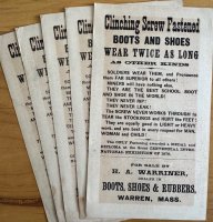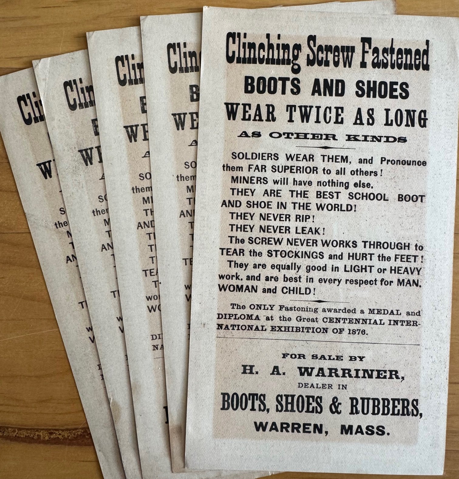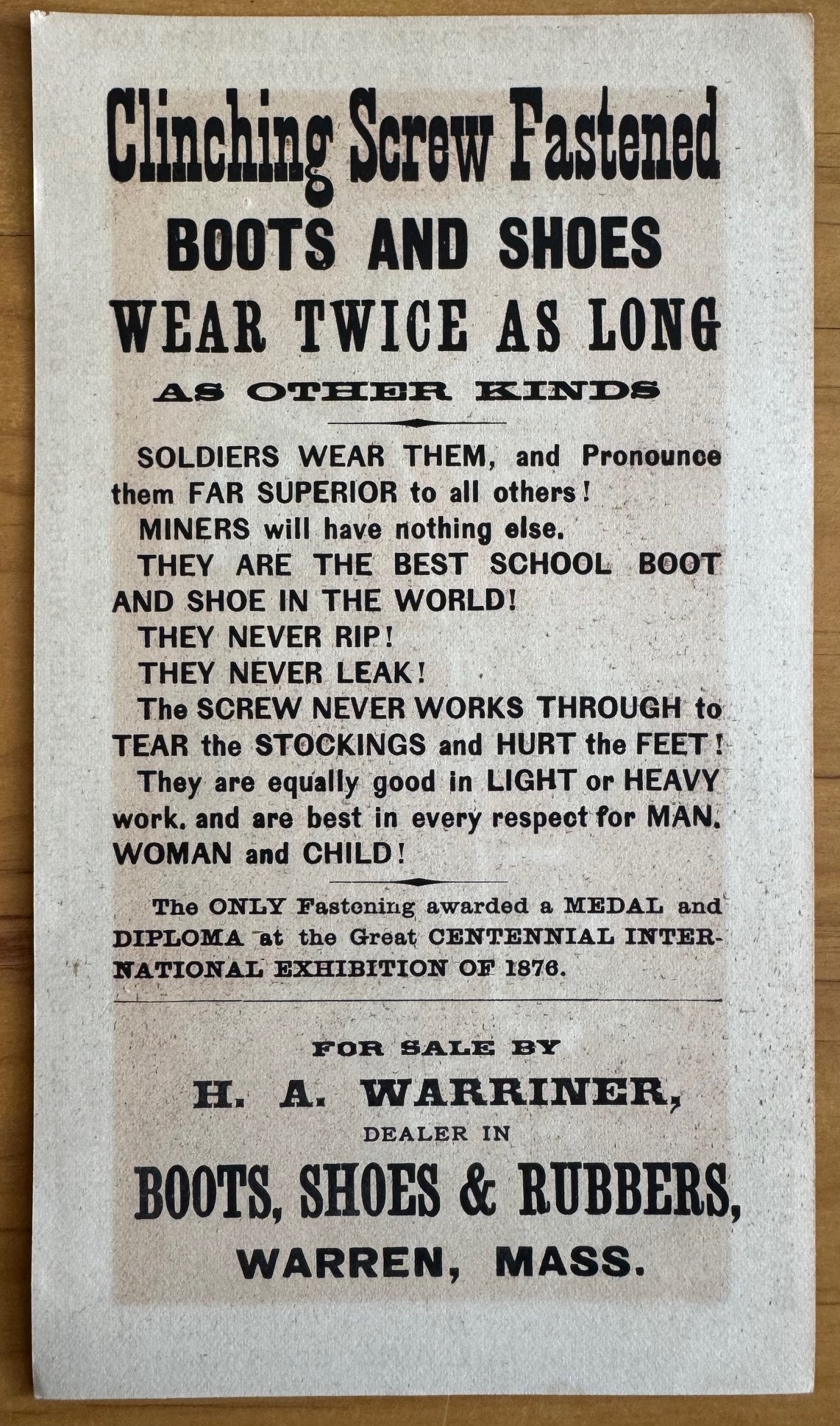 [Trade Card] Clinching Screw Fastened Boots and Shoes--H.A. Warriner, Dealer in Boots, Shoes & Rubbers Warren, Mass