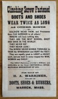 Typical 19th century trade card advertisement extolling the virtues of "Clinching Screw Fastened" shoes. "Soldiers prefer them to all others and miners will have nothing else." The best in every respect for man, woman and child!"