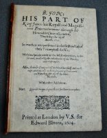 B. Jon: His Part of King James his Royall and Magnificent Entertainement through his Honorable Cittie of London, Thursday the 15. March. 1603. London: V(alentine) S(immes and George Eld) for Edward Blount 1604. Small 4to, 175 x 125mm. (6 7/8 x 4 7/8in.)
