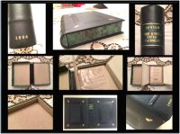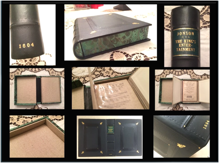 Elaborate clam-shell case by Book Arts of Washington DC, with mocha full vegetable tanned kid goat, hand tooled in 22 karat gold and blind tool, "Cambridge" inspired double borders with decorative spine in 22 karat gold, title on leather label, mounted on spine of clamshell, stamped in 22 karat gold. Chemise in acid free natural Asahi cloth lined with archival soft white superfine stock. Walls of clamshell in marble suggesting stone pattern reminiscent of the seventeenth century. It features in the Book Arts online Gallery.