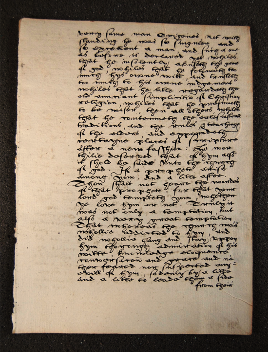 On the other hand, if we maintain that the “h-a” form is unique to Shakespeare, then we are faced with the provocative possibility that this handwritten manuscript is Shakespeare’s. As such, it possesses an almost mystical allure that seems to invite us back in time to the moment of creation. One might imagine that perhaps early in his career, before he established himself as a professional playwright, Shakespeare did odd jobs working as a scribe, and this fragmentary leaf, with its transcription of an obscure theological text, is the only extant example of his work.
