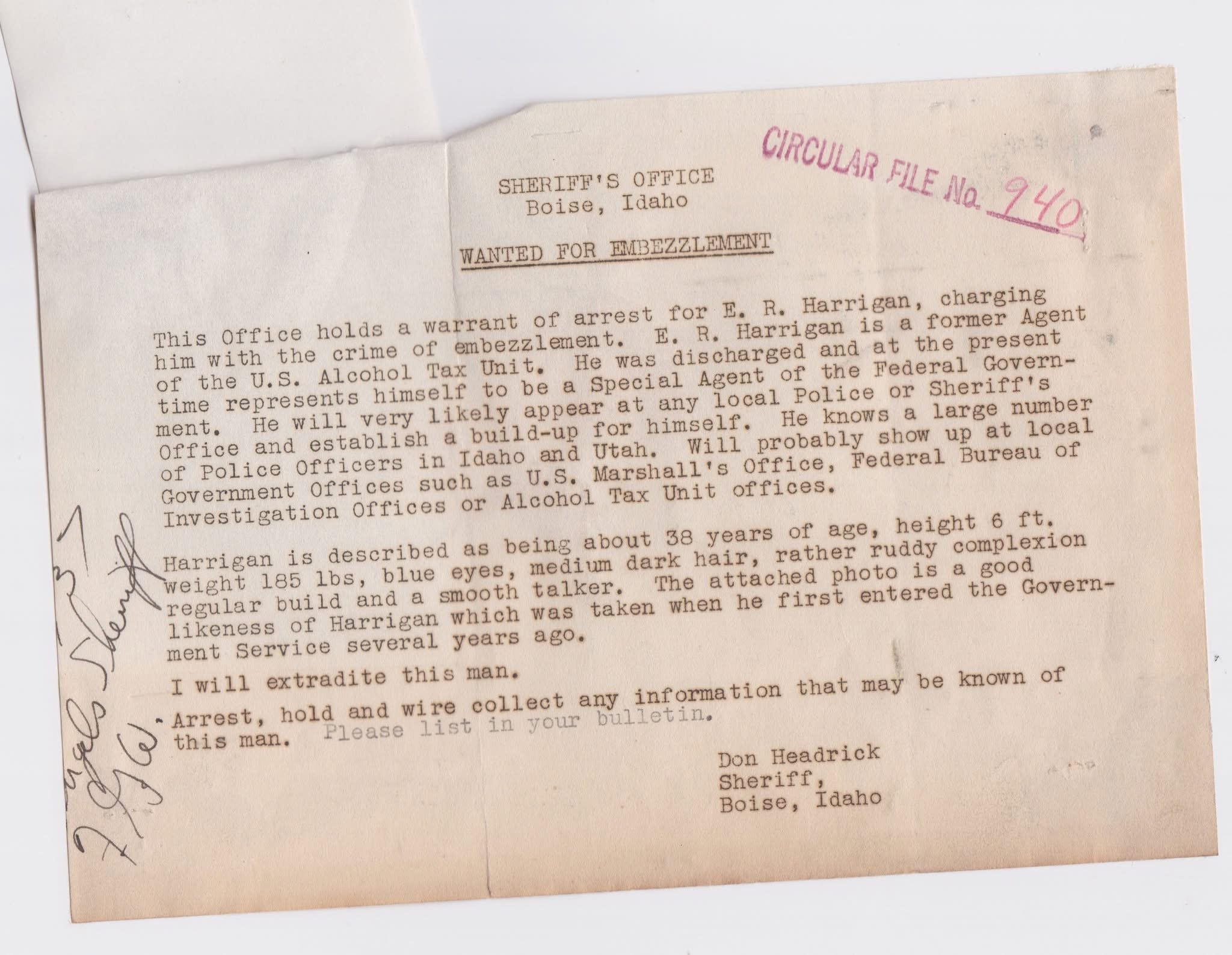 This Office holds a warrant of arrest for E. R. Harrigan, charging him with the crime of embezzlement. E. R. Harrigan is a former Agent of the U.S. Alcohol Tax Unit. He was discharged and at the present time represents himself to be a Special Agent of the Federal Govern- ment. He will very likely appear at any local Police or Sheriff's Office and establish a build-up for himself. He knows a large number of Police Officers in Idaho and Utah. Will probably show up at local Government Offices such as U.S. Marshall's Office, Federal Bureau of Investigation Offices or Alcohol Tax Unit offices.