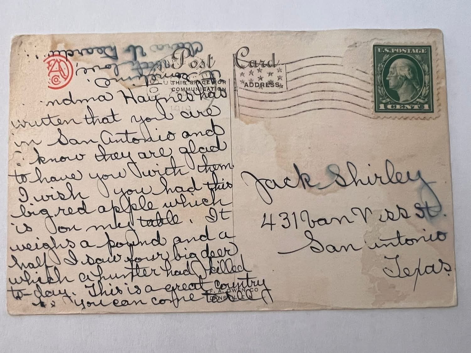 Grandma hayes has written that you are in San Antonio and I know they are glad to have you with them you! I wish you had this big red apple which is for my table. It is weighs a pound and a half. I saw four big dears which a hunter had killed today. This is a great country ...to come see.