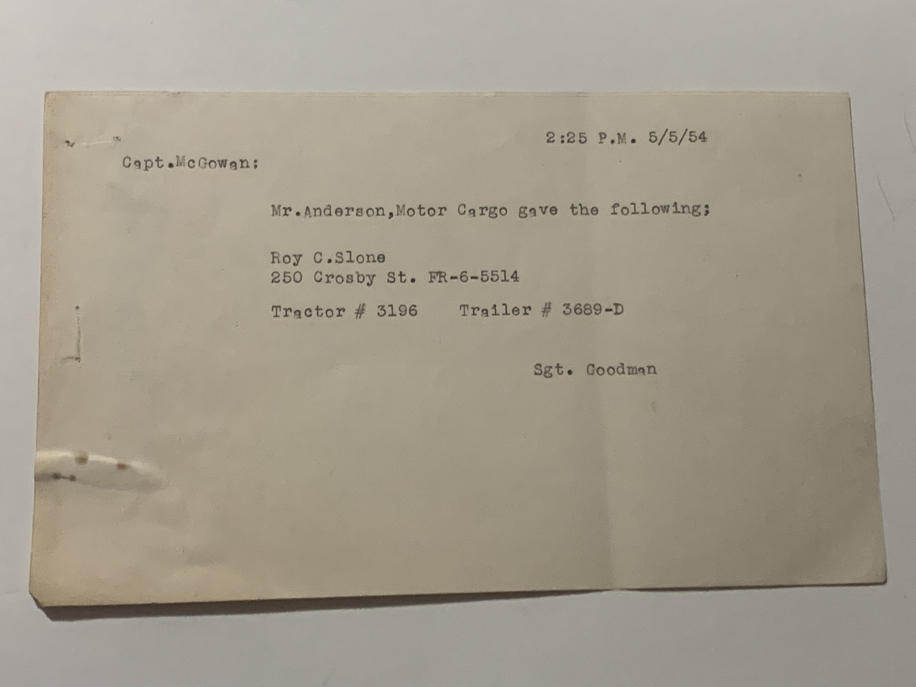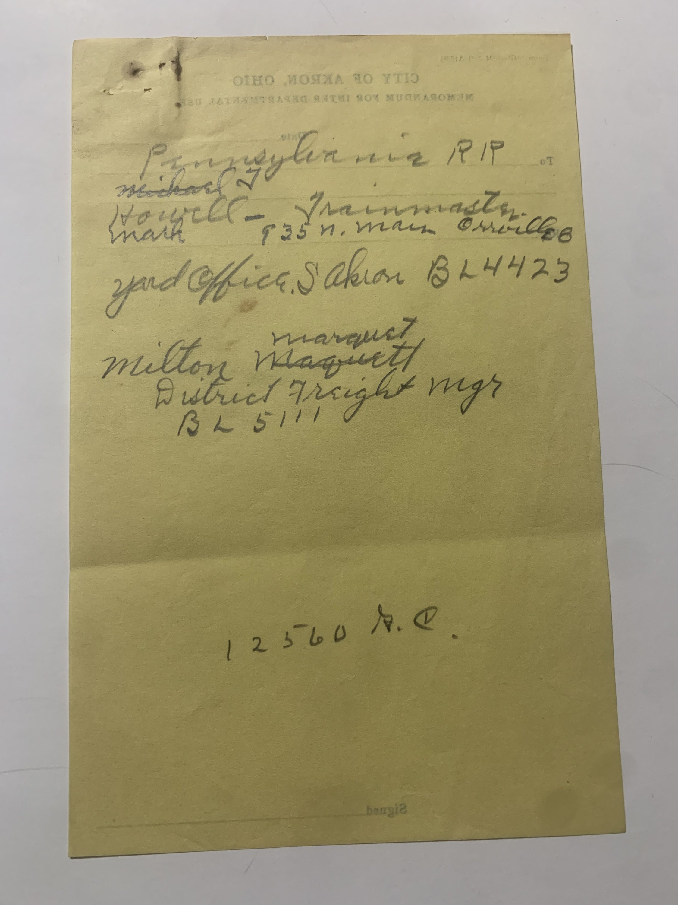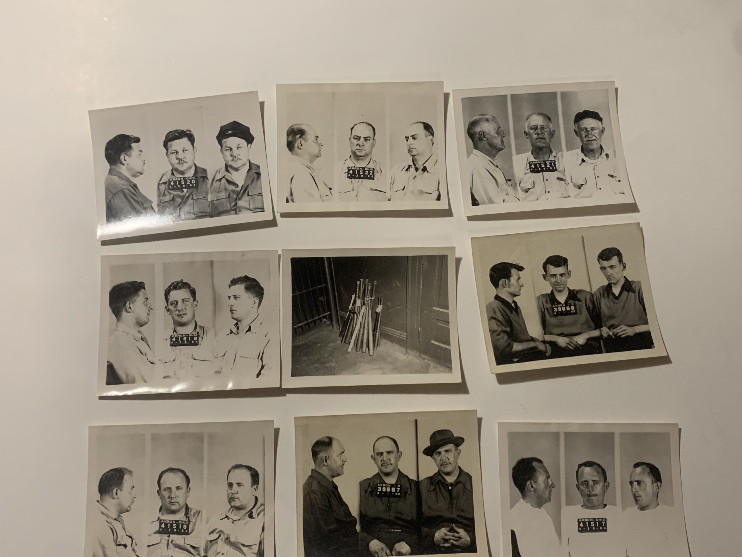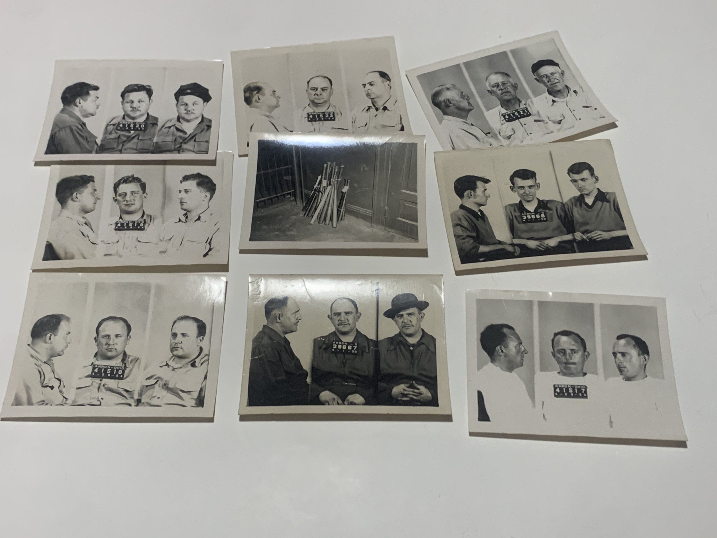 An original police archive documenting the 1954 labor riot in Akron, Ohio, involving Pennsylvania Railroad workers and city authorities. The collection includes 3 typed police reports on yellow and onionskin paper, internal memoranda, and a set of 8 mugshot photographs, each labeled on the reverse with the individual’s name.