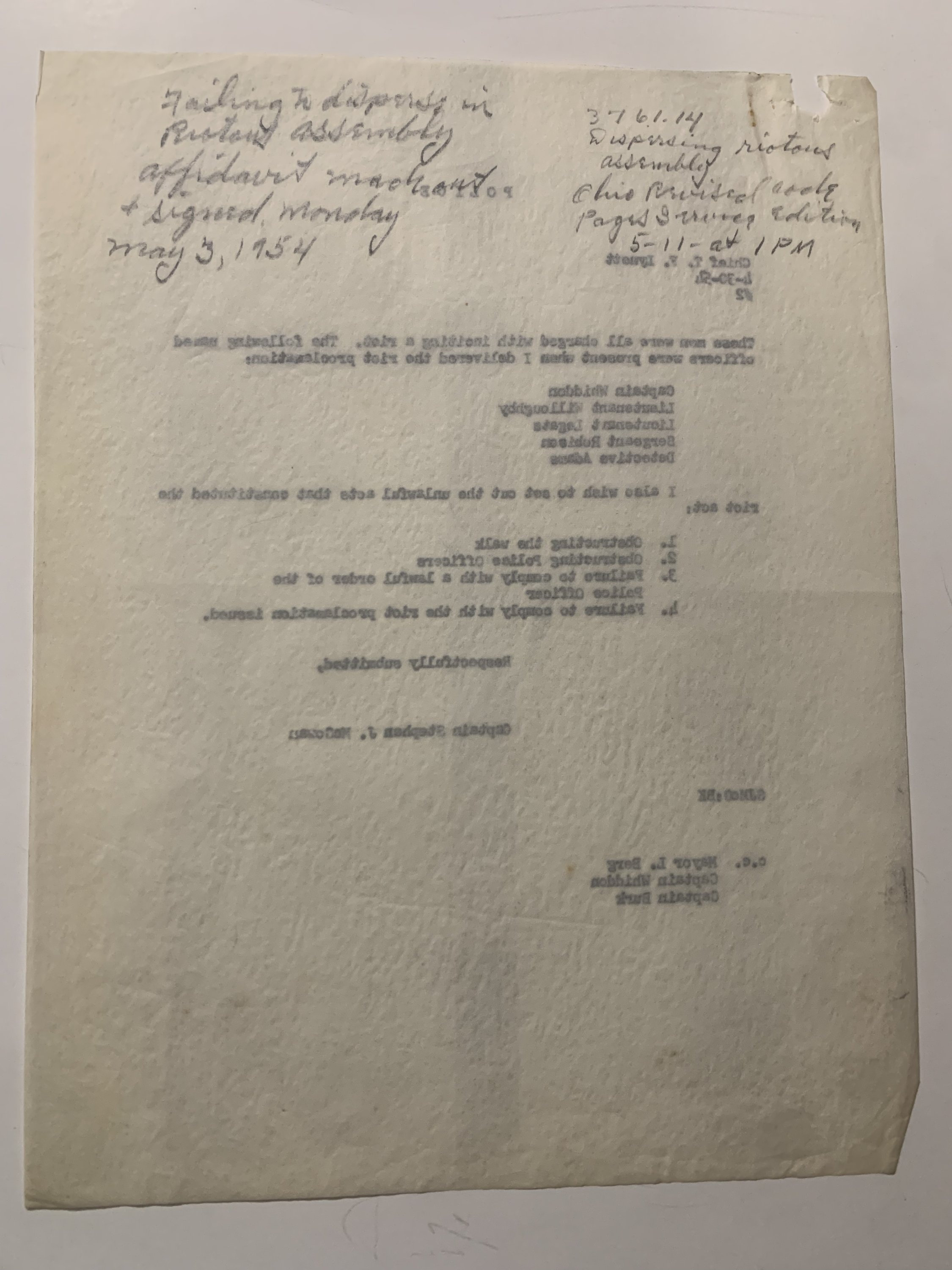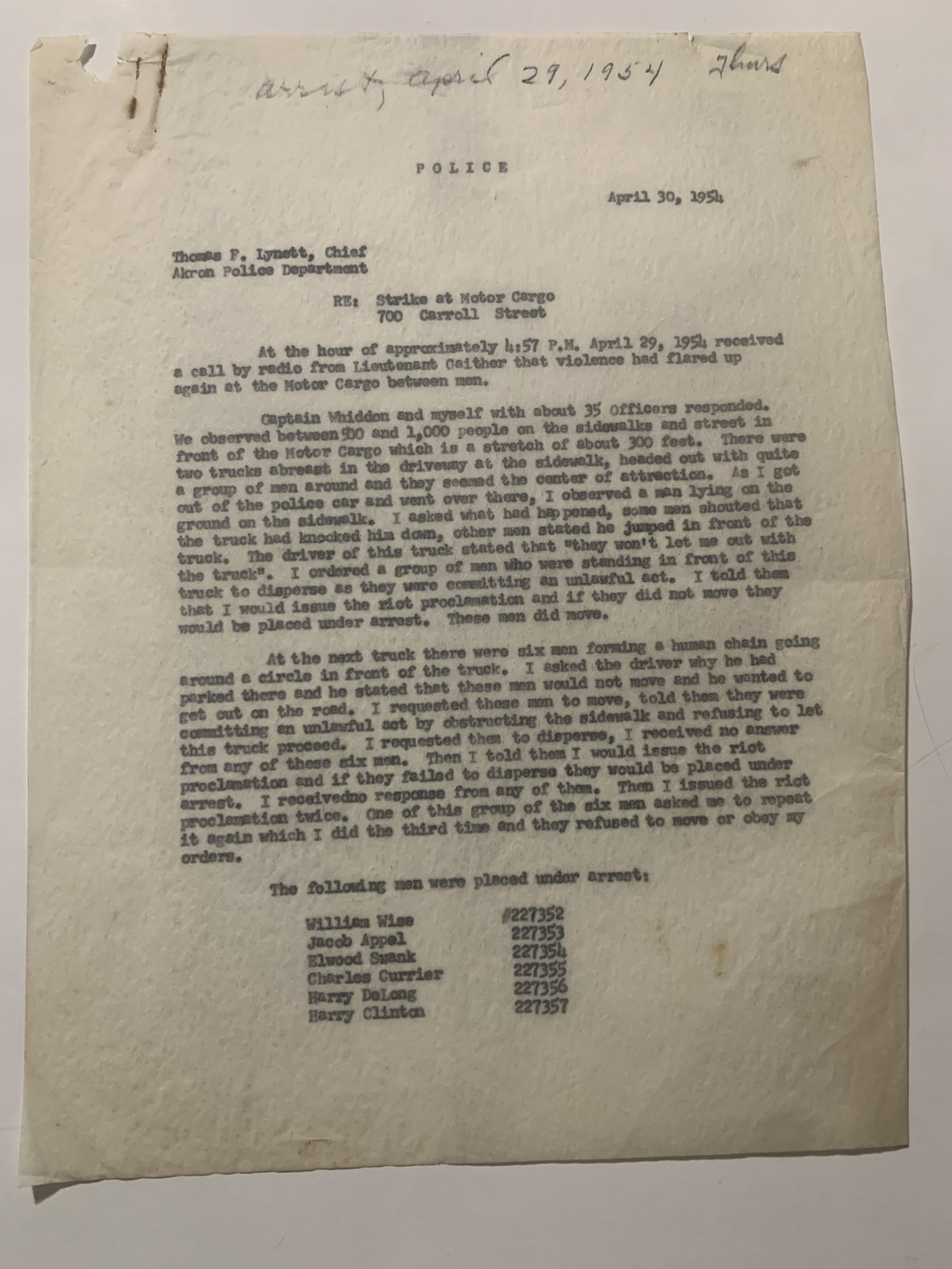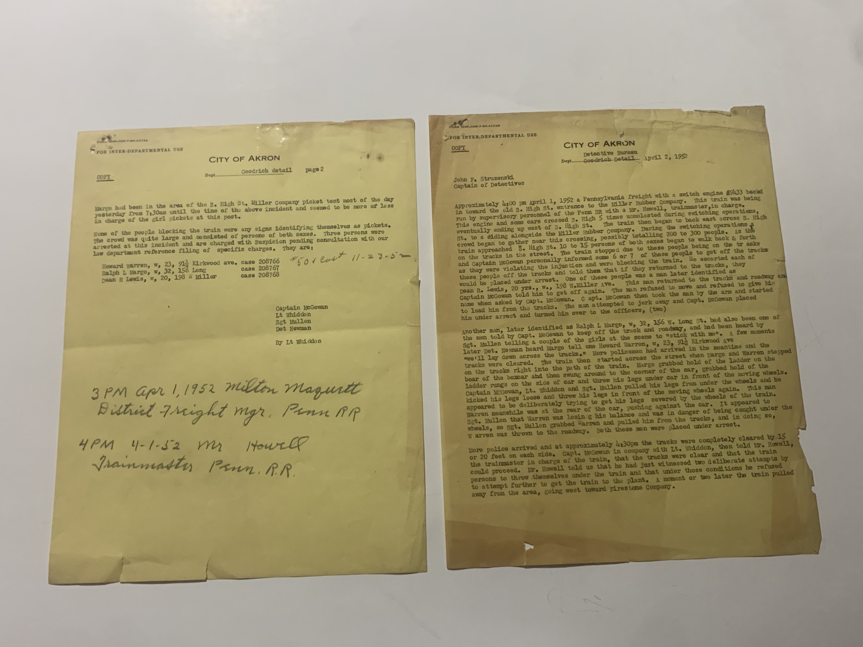 The reports, dated April 1–May 5, 1954, were prepared by Captains Stephen J. McGowan and T.P. Lynett of the City of Akron Police Department. They describe a clash between striking or picketing railroad workers and law enforcement after a Pennsylvania Railroad freight engine was halted near High Street and Kirkwood Avenue. Officers arriving at the scene found the tracks blocked by pickets who refused to disperse. Following several warnings and the formal reading of a “riot proclamation,” arrests were made under charges of inciting a riot, obstructing police officers, and failure to comply with lawful orders.
