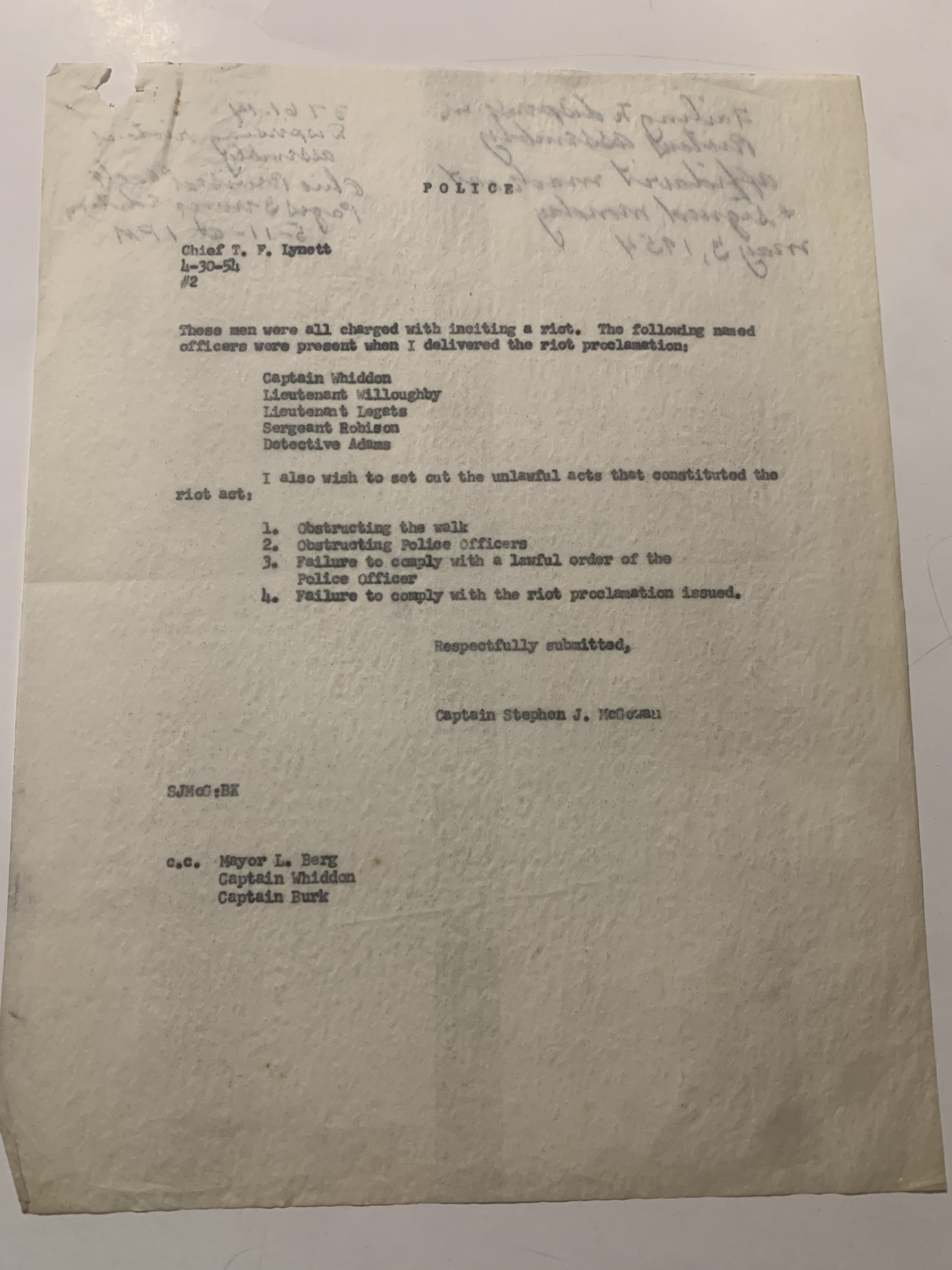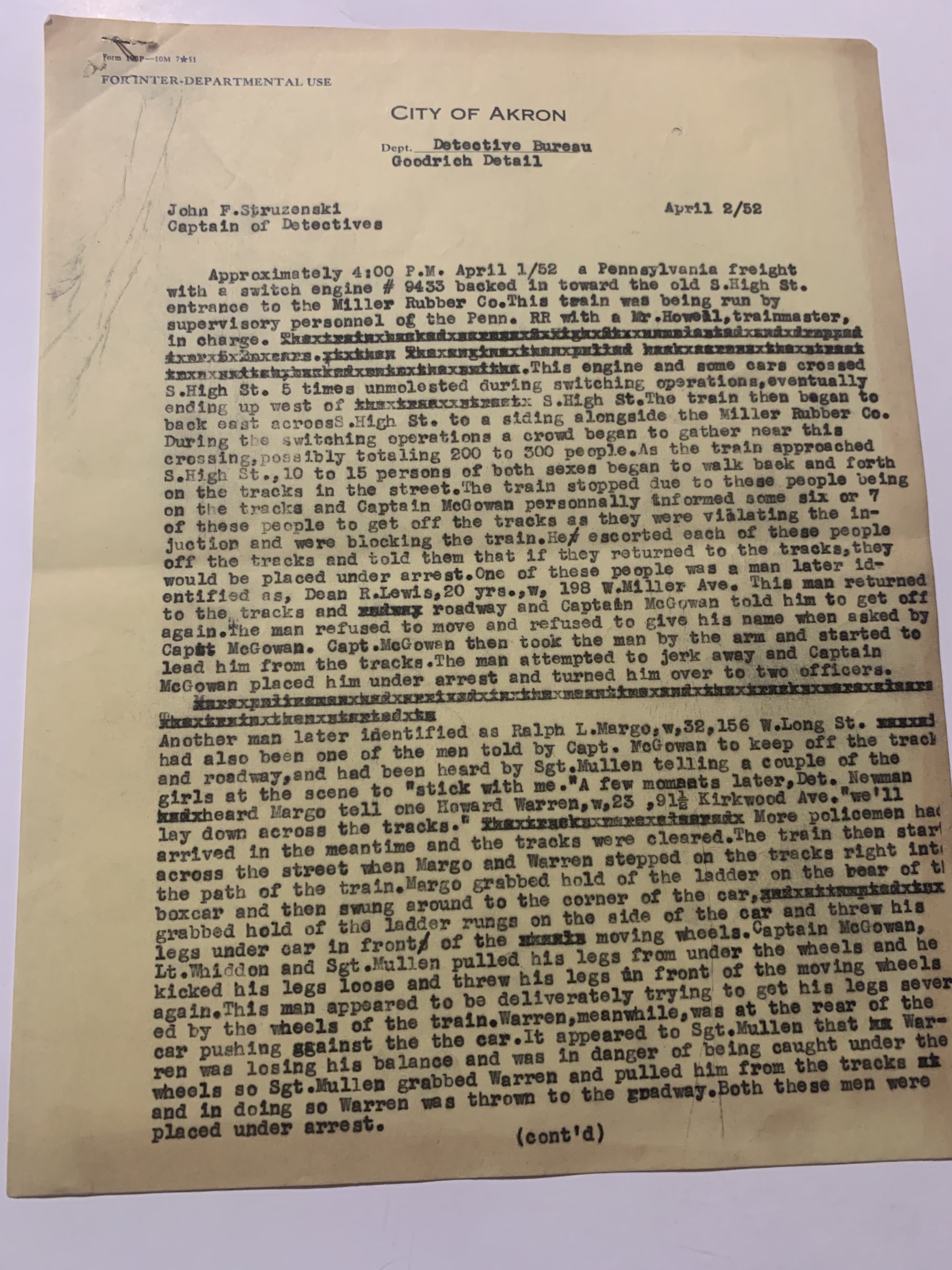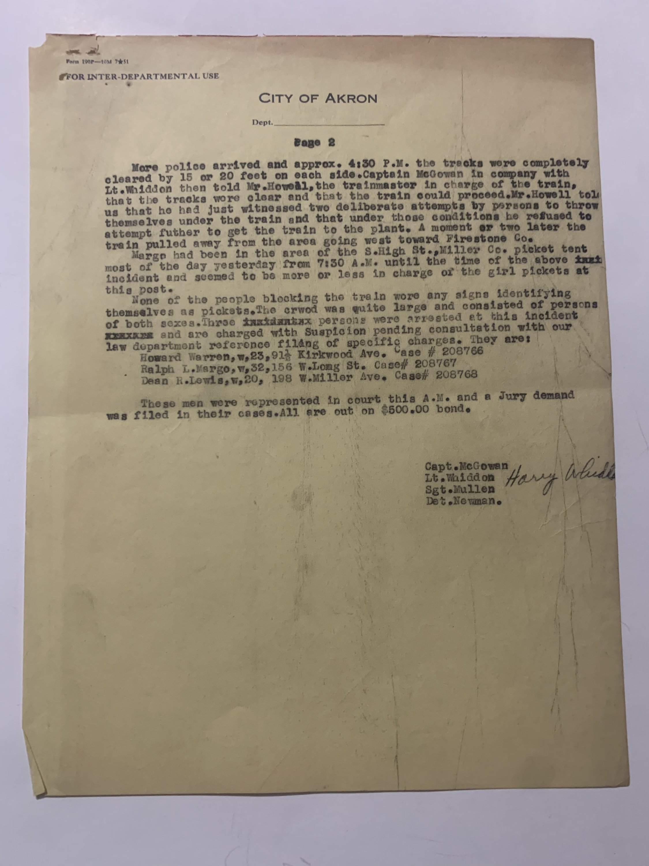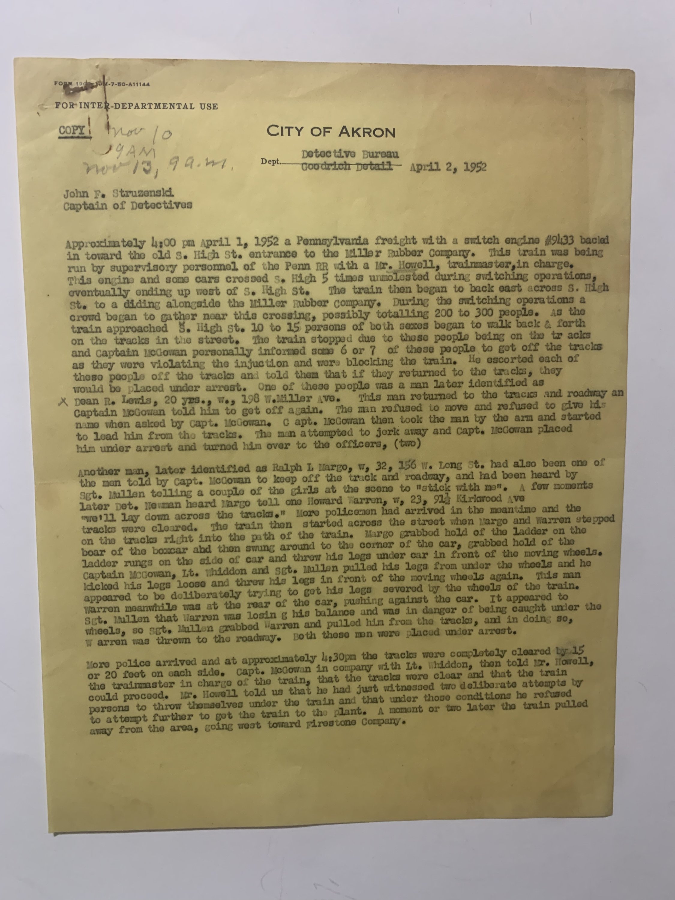The reports, dated April 1–May 5, 1954, were prepared by Captains Stephen J. McGowan and T.P. Lynett of the City of Akron Police Department. They describe a clash between striking or picketing railroad workers and law enforcement after a Pennsylvania Railroad freight engine was halted near High Street and Kirkwood Avenue. Officers arriving at the scene found the tracks blocked by pickets who refused to disperse. Following several warnings and the formal reading of a “riot proclamation,” arrests were made under charges of inciting a riot, obstructing police officers, and failure to comply with lawful orders.