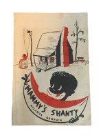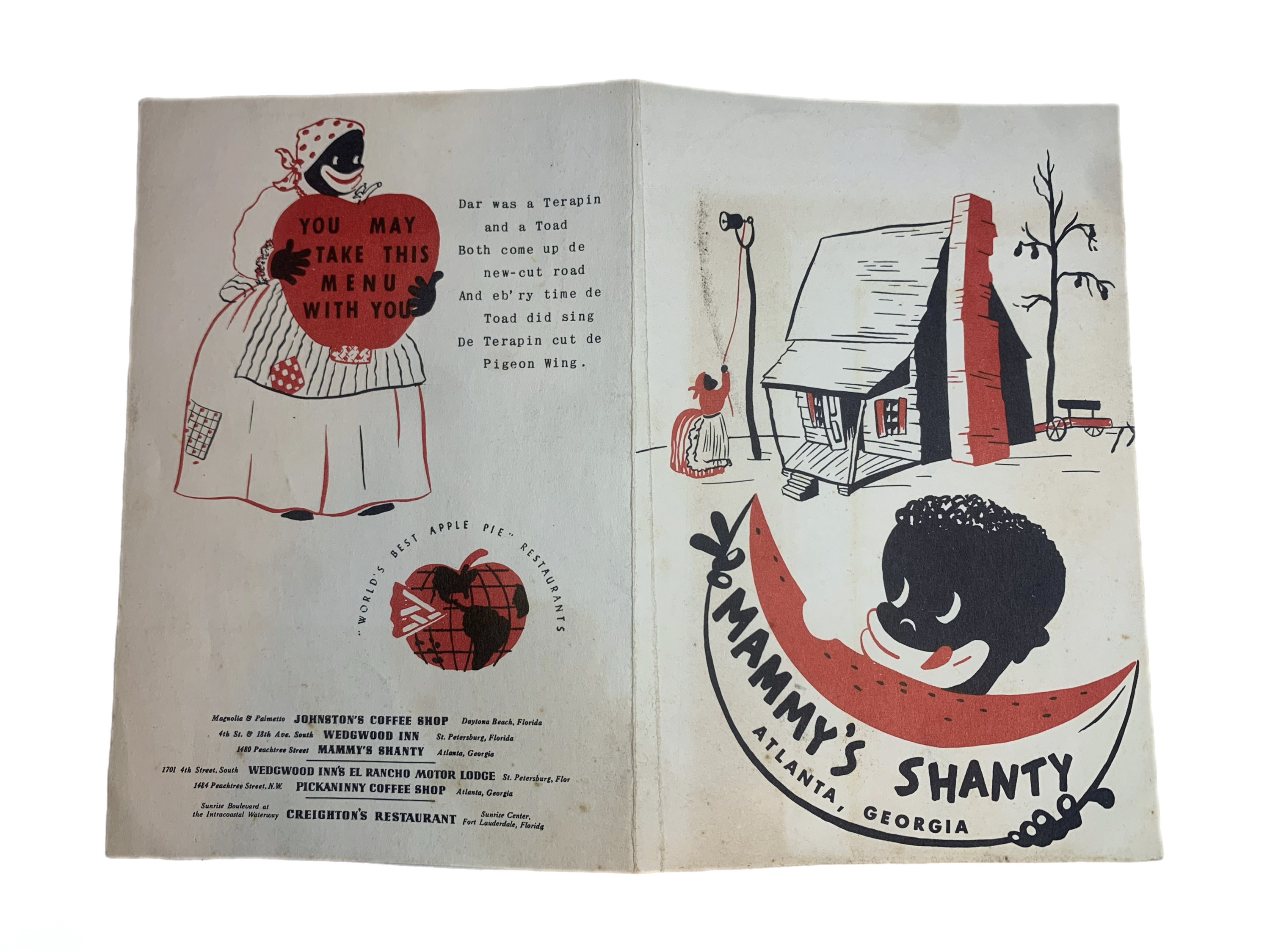 Original printed menu from Mammy’s Shanty, a restaurant in Atlanta, Georgia, dating to the mid-20th century. This artifact is a striking example of segregation-era commercial ephemera, featuring pervasive racist caricatures and dialect text intended to romanticize the “Old South” while commodifying Black stereotypes for white patrons.