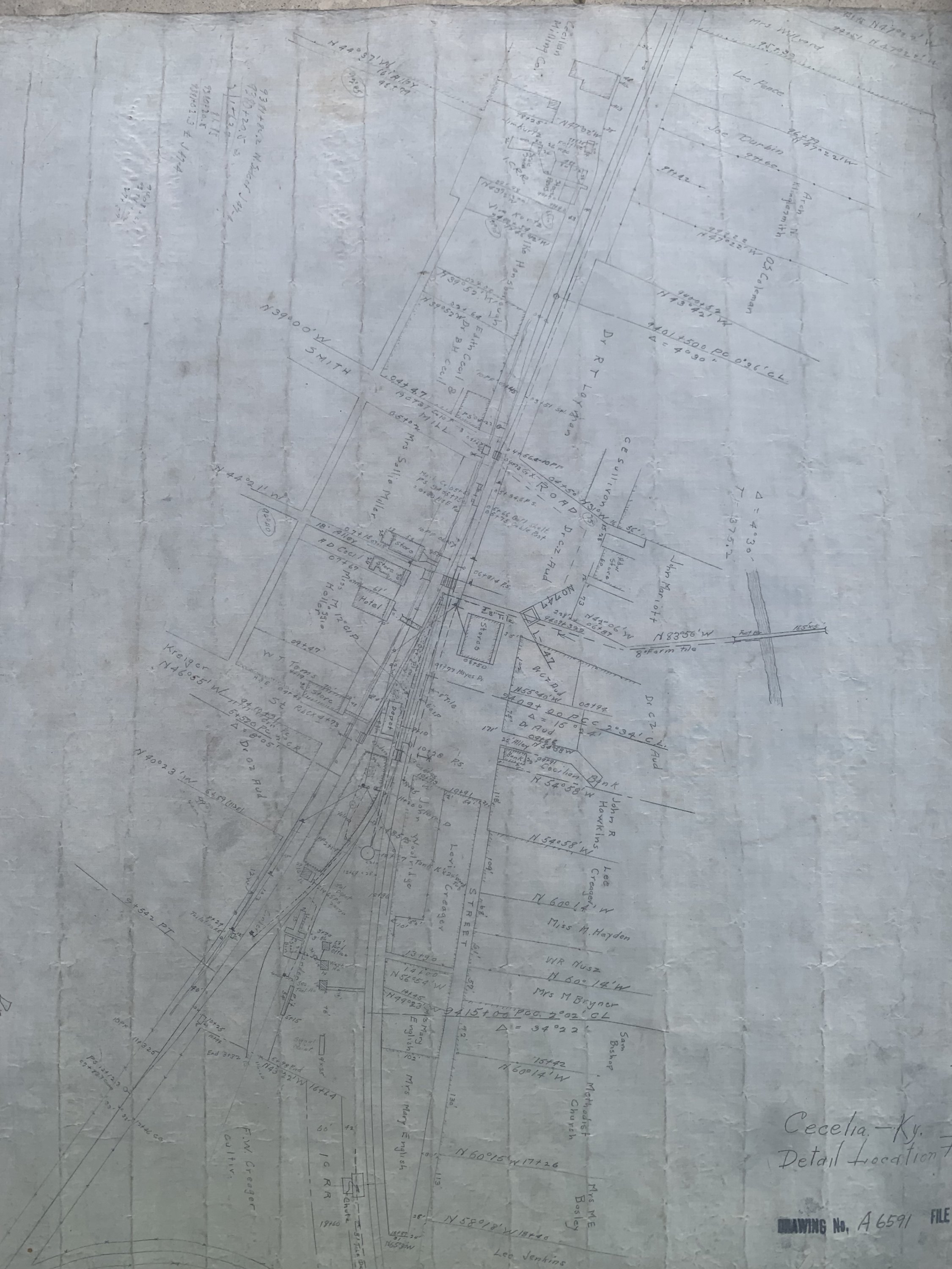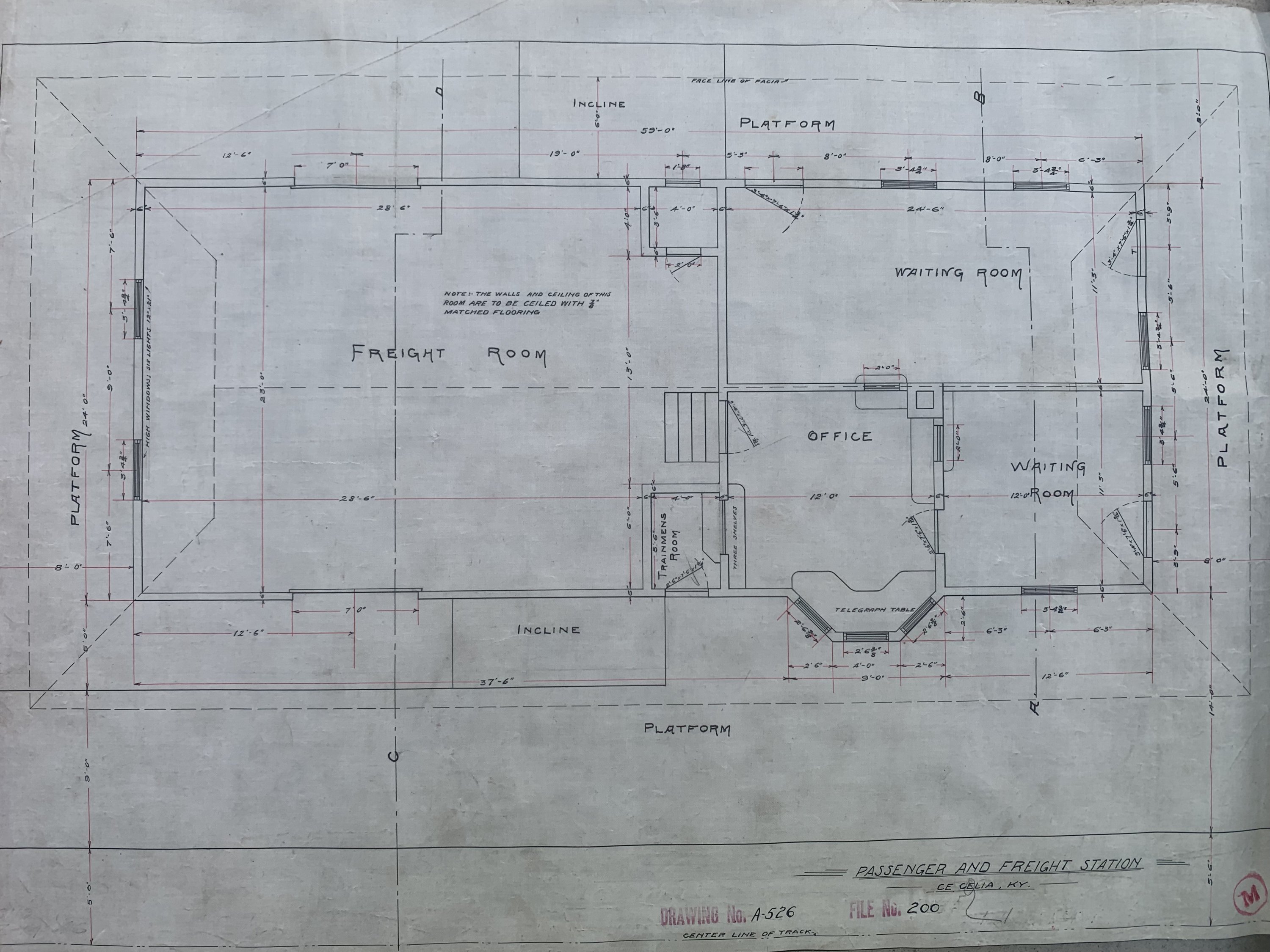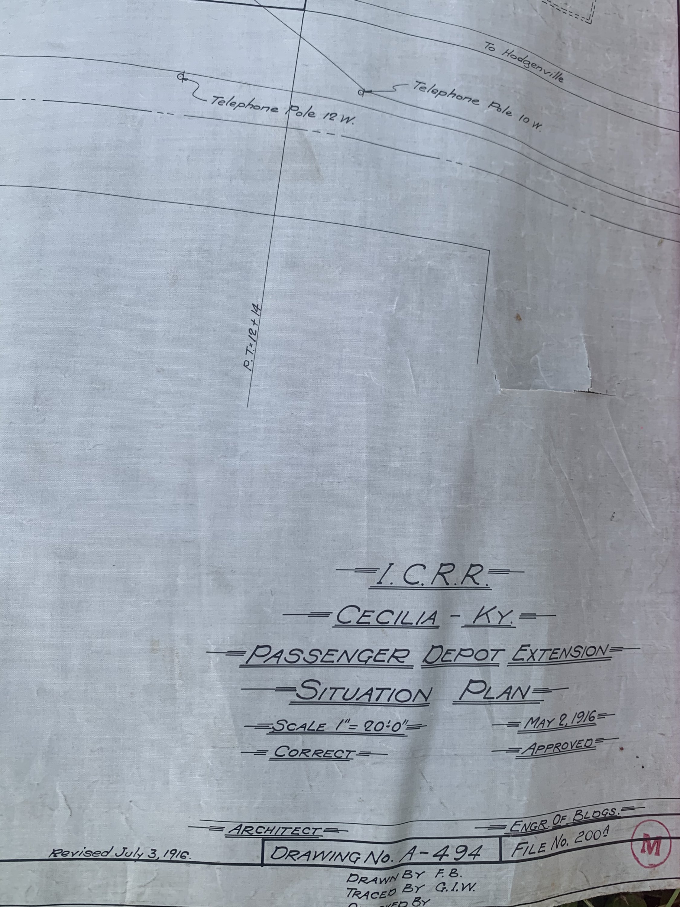 The most striking sheet is the Cecilia, Kentucky Passenger Depot Extension plan (dated May 2, 1916; revised July 3, 1916). The floor plan explicitly labels separate “White Waiting Room” and “Colored Waiting Room,” a powerful example of how segregation was codified into the physical design of public facilities.