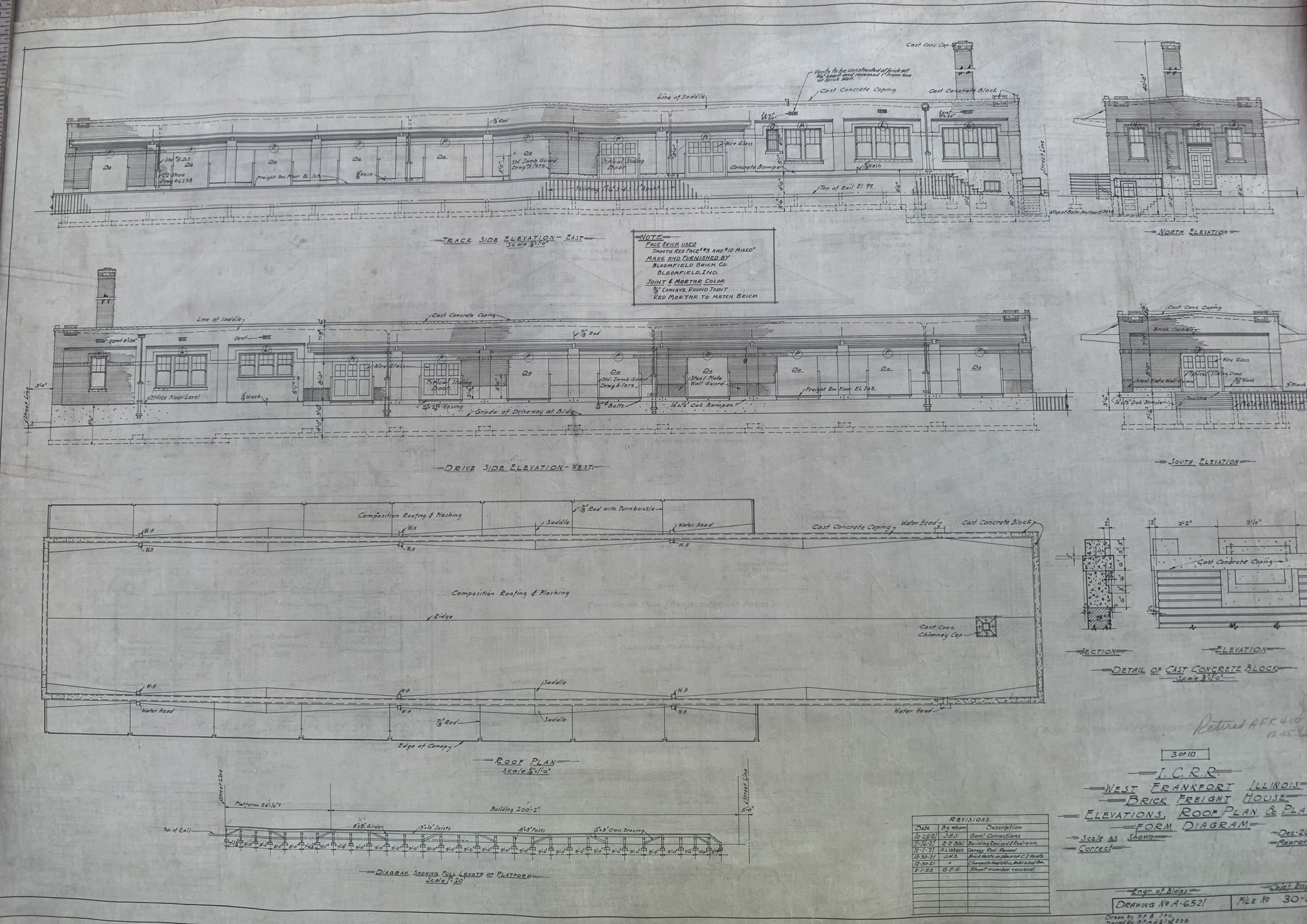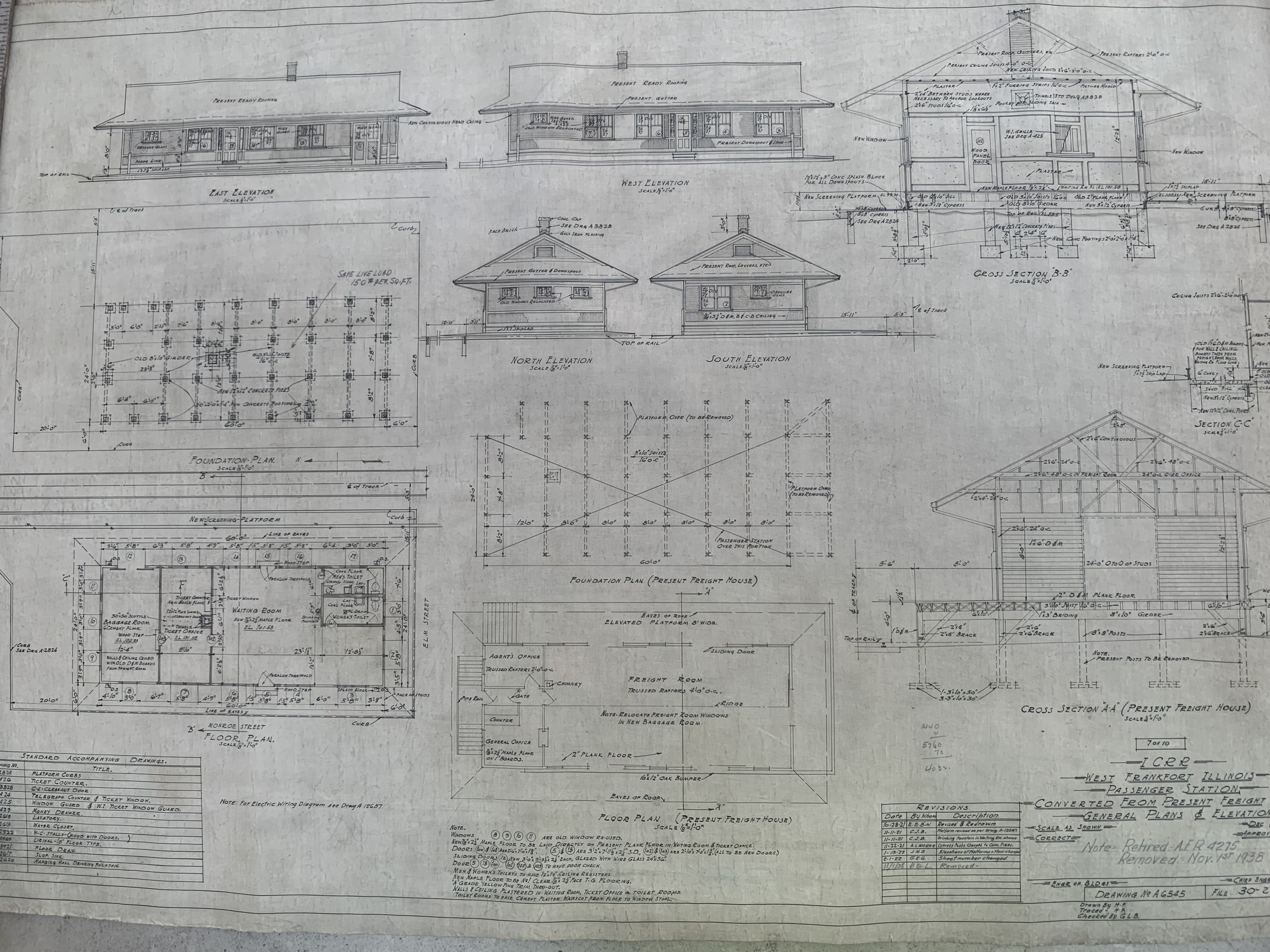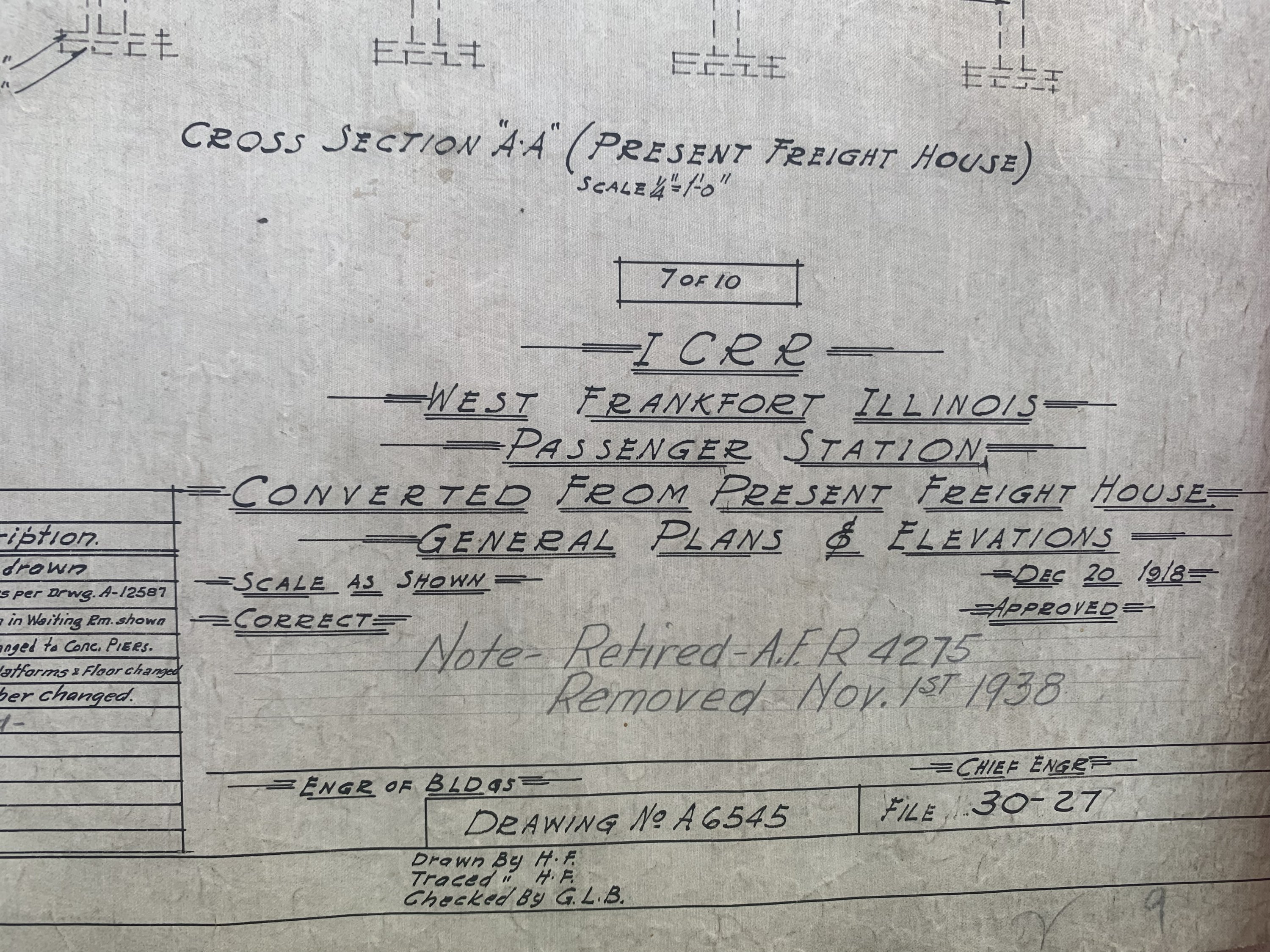 • West Frankfort, Illinois (1918): “Brick Freight House – Elevations, Roof Plan & Plat Form Diagram” and “Passenger Station Converted from Present Freight House – General Plans & Elevations,” both officially approved and later marked with retirement notations (1938 and 1966).