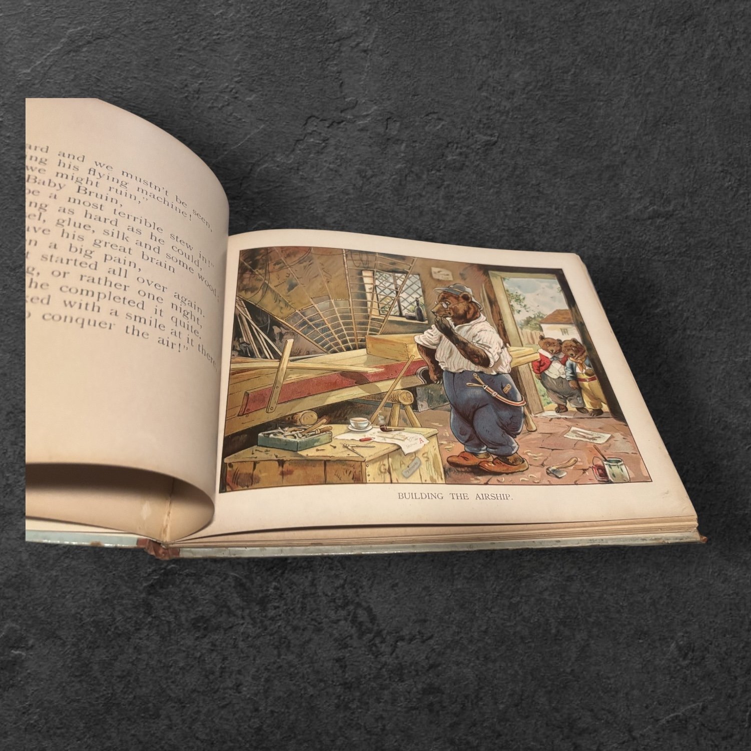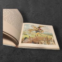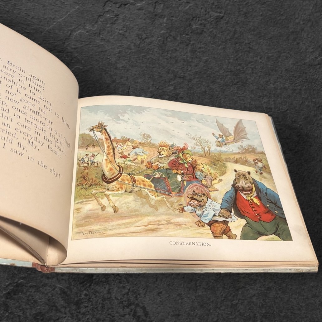 Cloth backed color pictorial boards with some edge wear and a little soiling, especially in rear cover. Eight full colorplates and lots of black and white drawings for this quite inventive and inventive and interesting work centered around very early airships. Thompson has given us images of many of the early experiments in air travel for his will characters to enjoy. The animals are his usual rambunctious and energetic selves and they seem to have great fun tearing up their world. The ability to fly just gave them more opportunity to cause havoc.