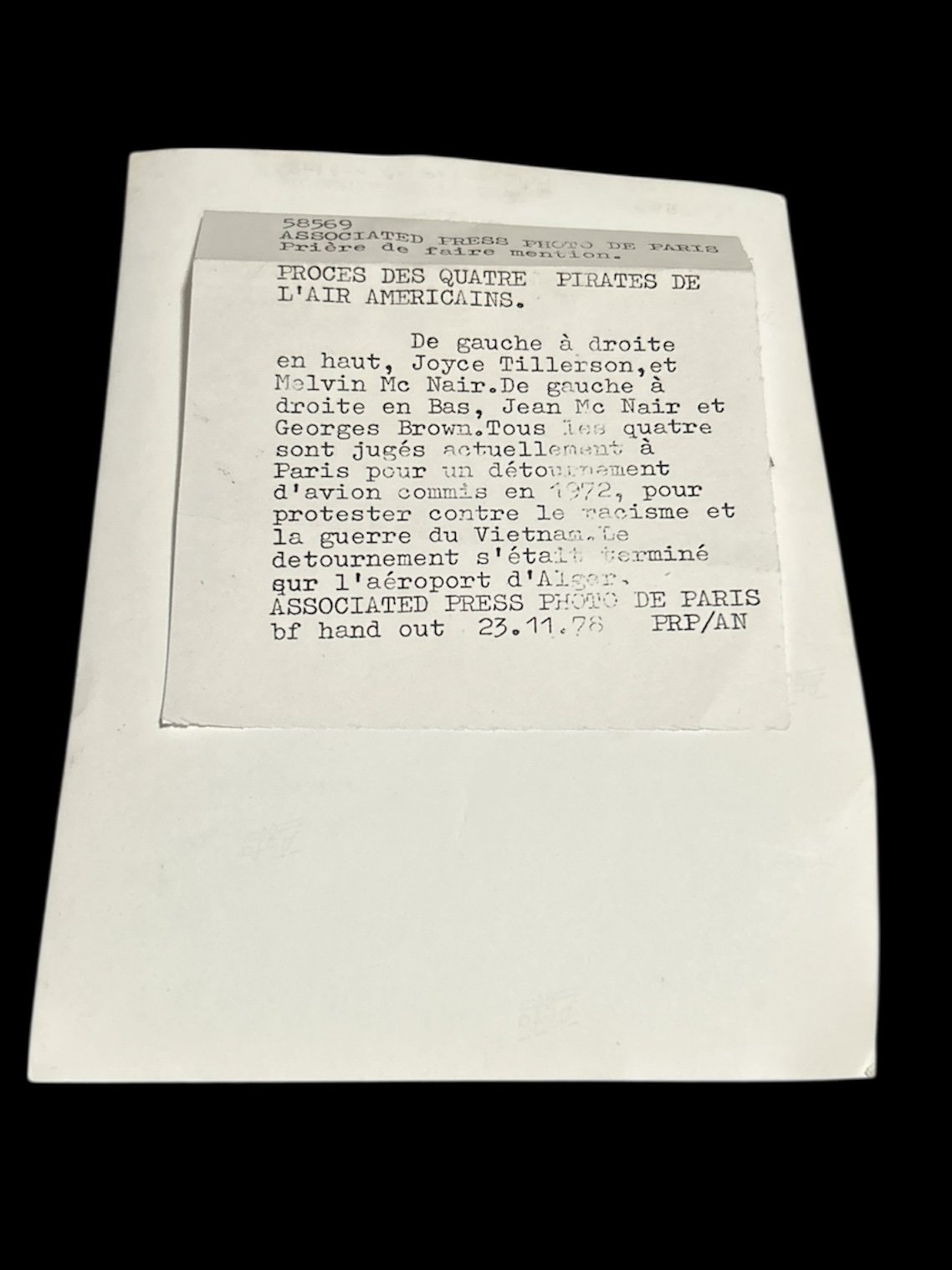 De gauche à droite en haut, Joyce Tillerson,et Melvin Mc Nair. De gauche à droite en Bas, Jean Mc Nair et Georges Brown. Tous les quatre sont jugés actuellement à Paris pour un détournament d'avion commis en 1972, pour protester contre le racisme et la guerre du Vietnam. Le detournement s'étaltt terminé şur l'aéroport d'Alger. ASSOCIATED PRESS PHOTO DE PARIS