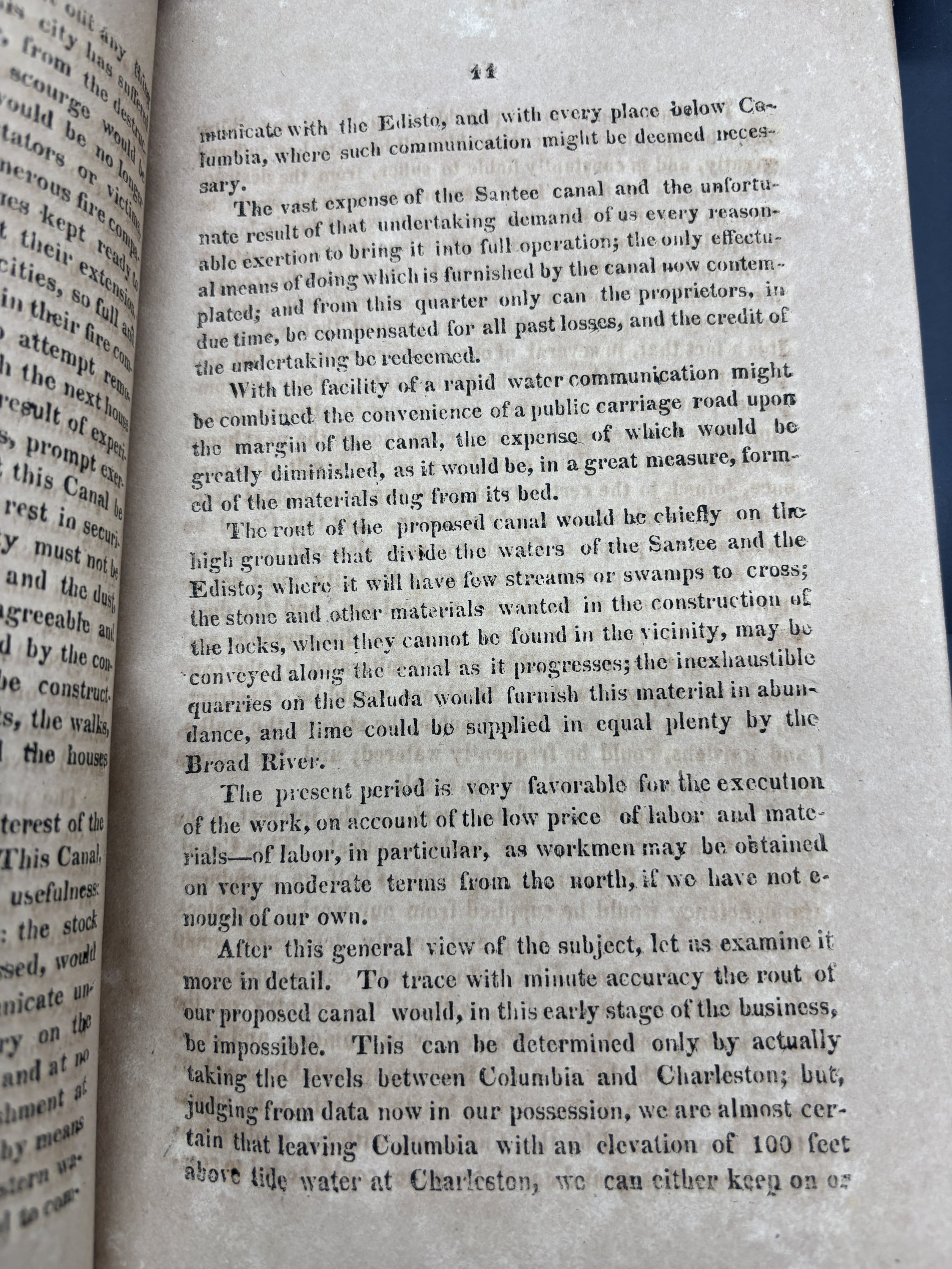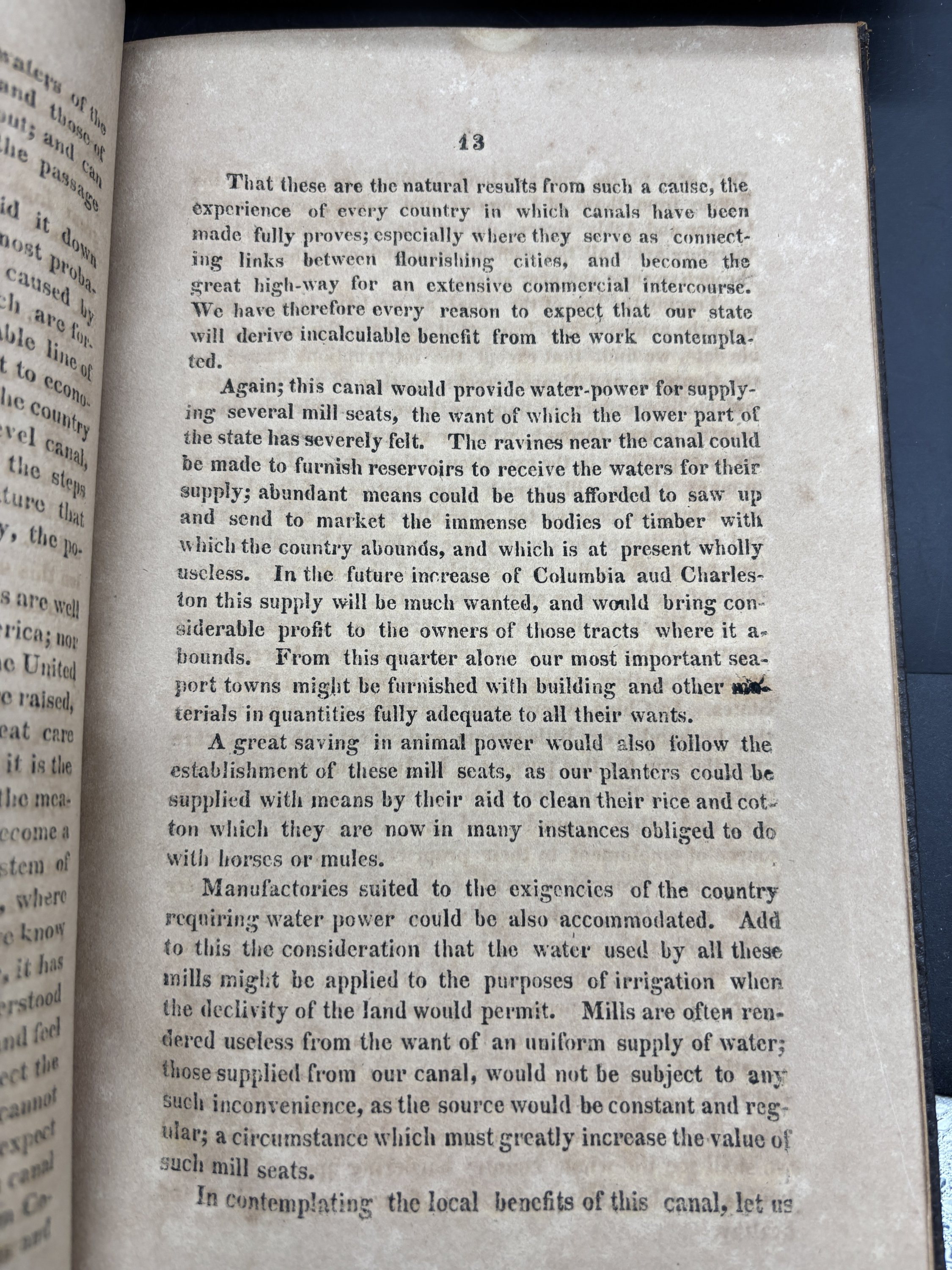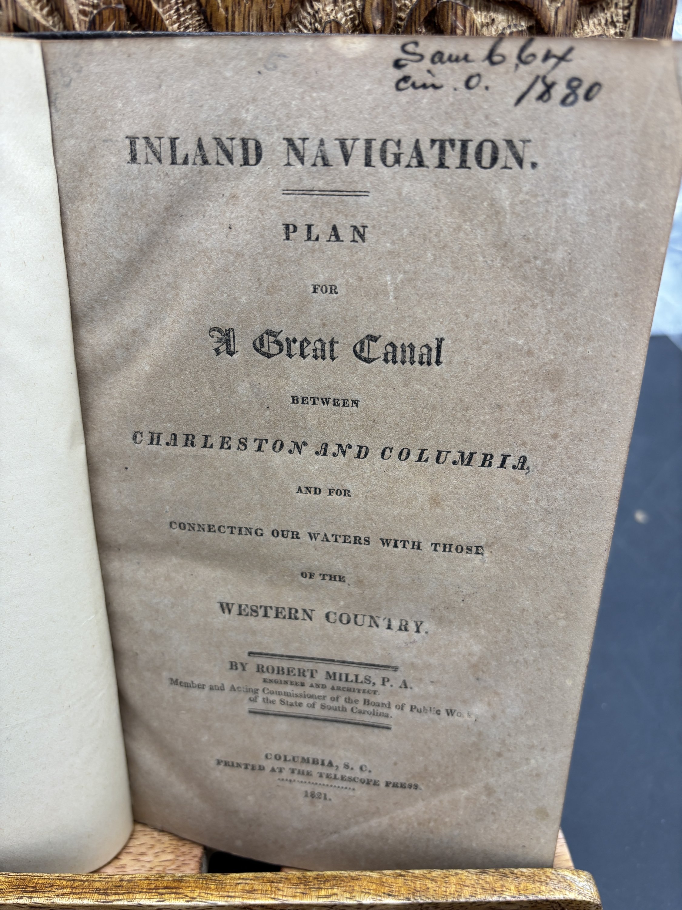 Inland Navigation. Plan for a Great Canal between Charleston and Columbia, and for connecting our waters with those of the Western Country by Robert Mills Engineer and Architect. flexible leather cover. Published in Columbia, South Carolina by the Telescope Press in 1821. It was owned and is inscribed by Samuel Cox of Cincinnati. Guaranteed original and in good condition.
