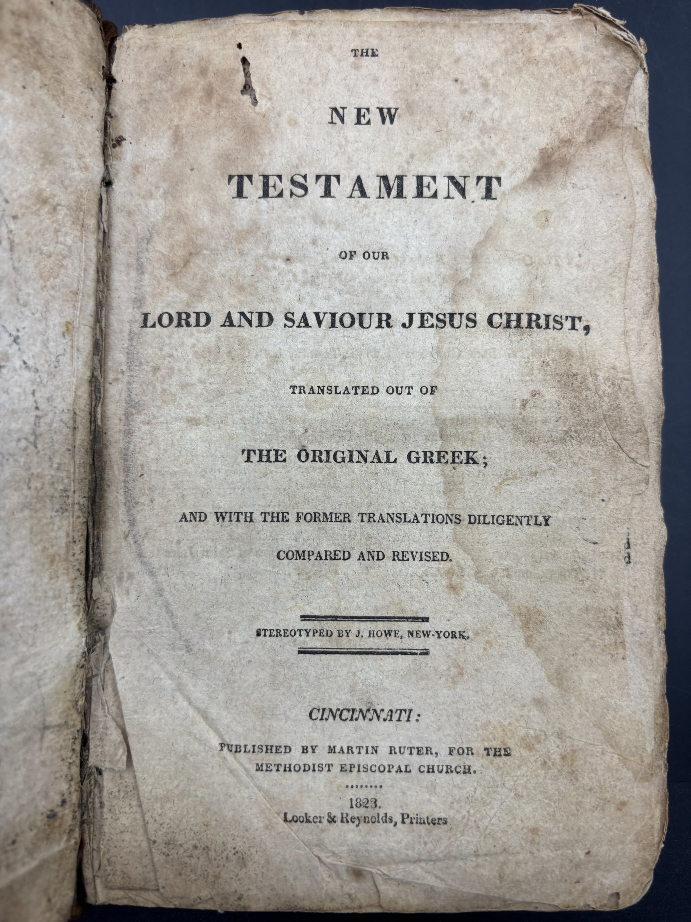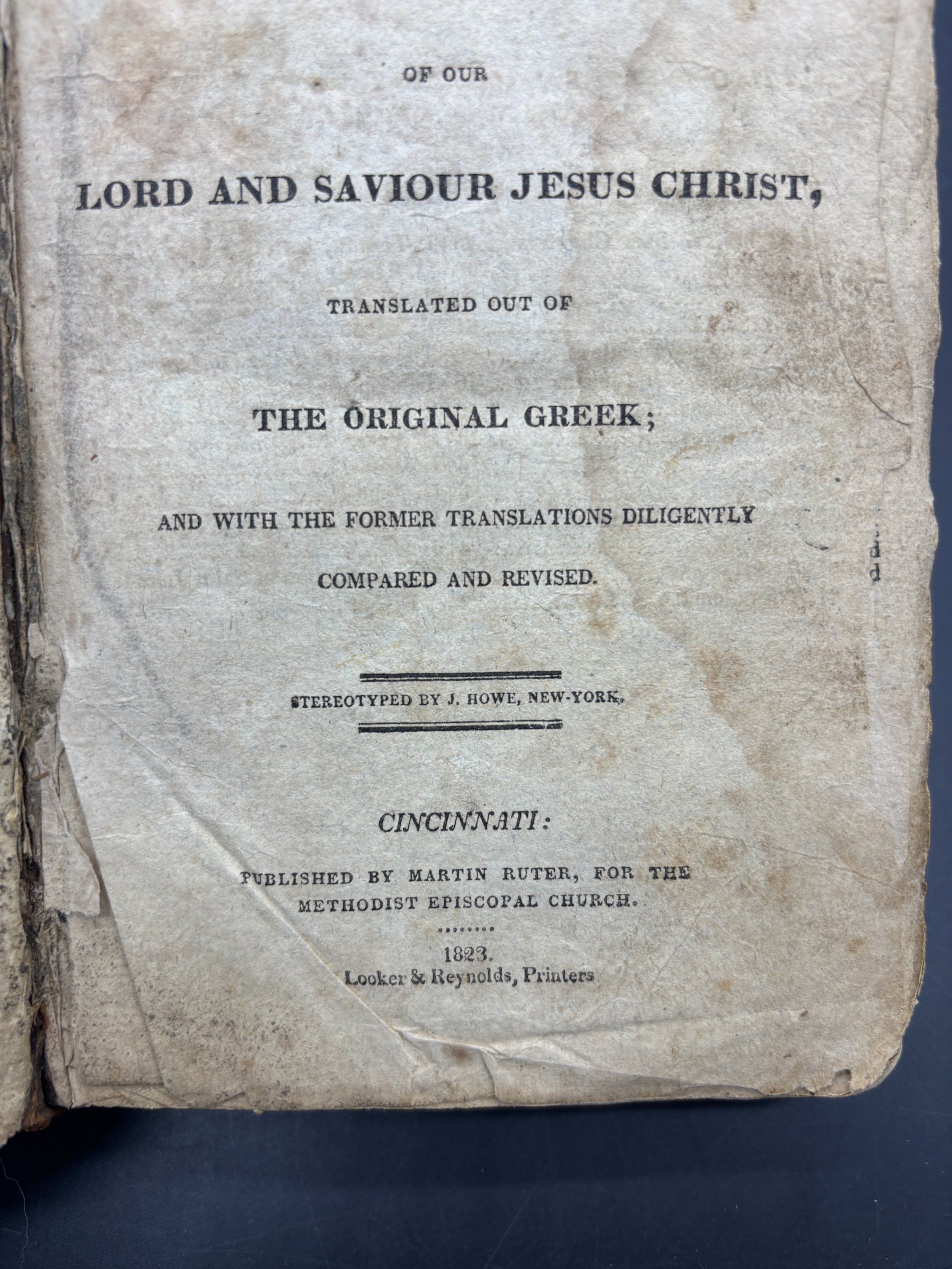 A very early printing of the New Testament in Ohio. It was published by Martin Ruter in Cincinnati in 1823. It is guaranteed original.