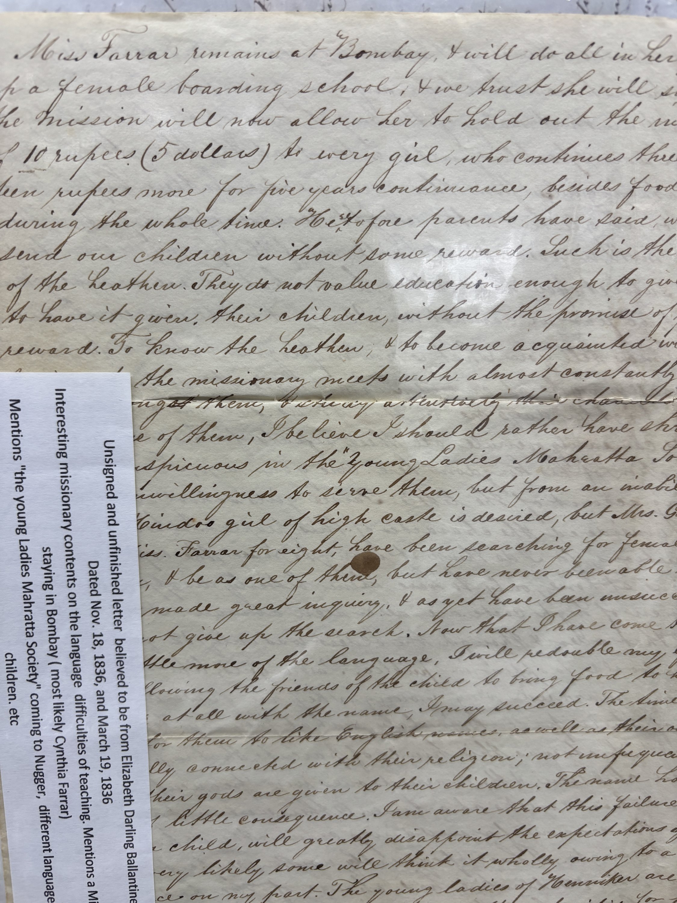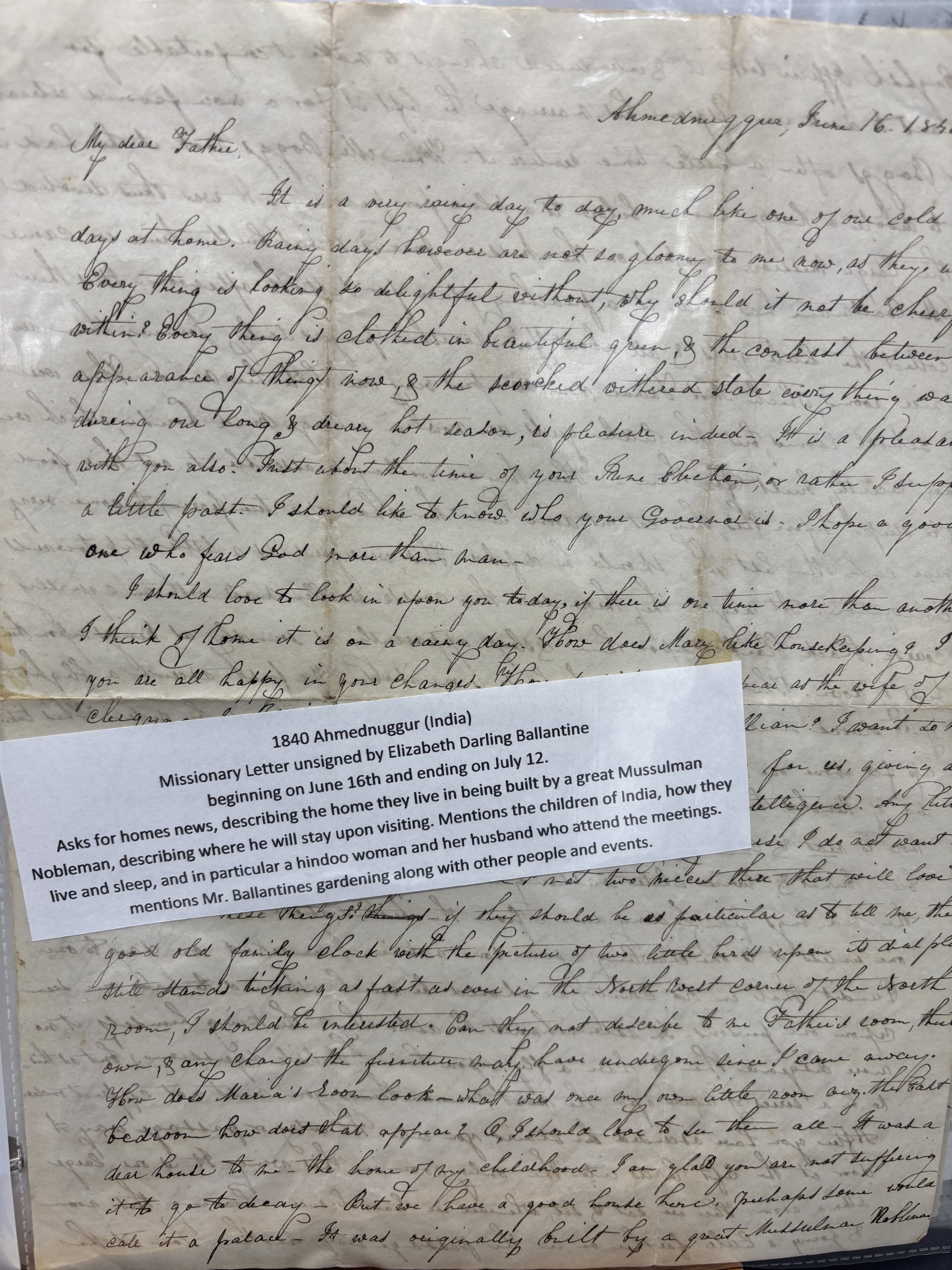 A wonderful archive of letters related to missionary and educator Elizabeth Darling Ballantine. It includes 40 letters from the early to mid-1800s. Ballantine was a student of Mary Lyon's at Mount Holyoke graduated in the 1830s. She served as a missionary in India from 1835 to 1870 and operated a girls boarding school, she introduced education innovations in India. There are 10 letters from her as a missionary. There are 17 letters written from friends and family about local and family matters in Amherst, Massachusetts. There are 13 items related to her father, Joshua Darling. There is great content throughout. It is guaranteed original and in good condition.