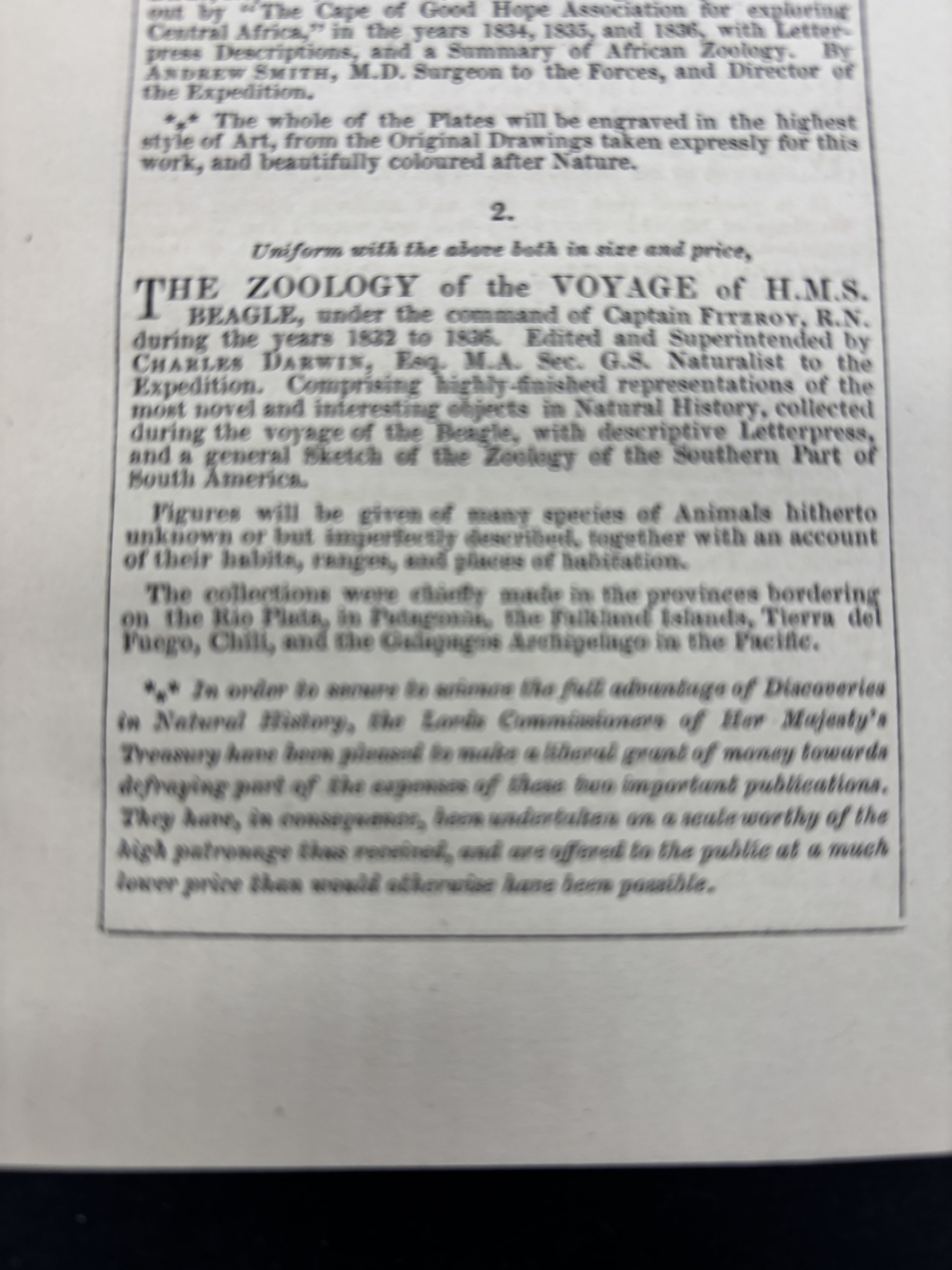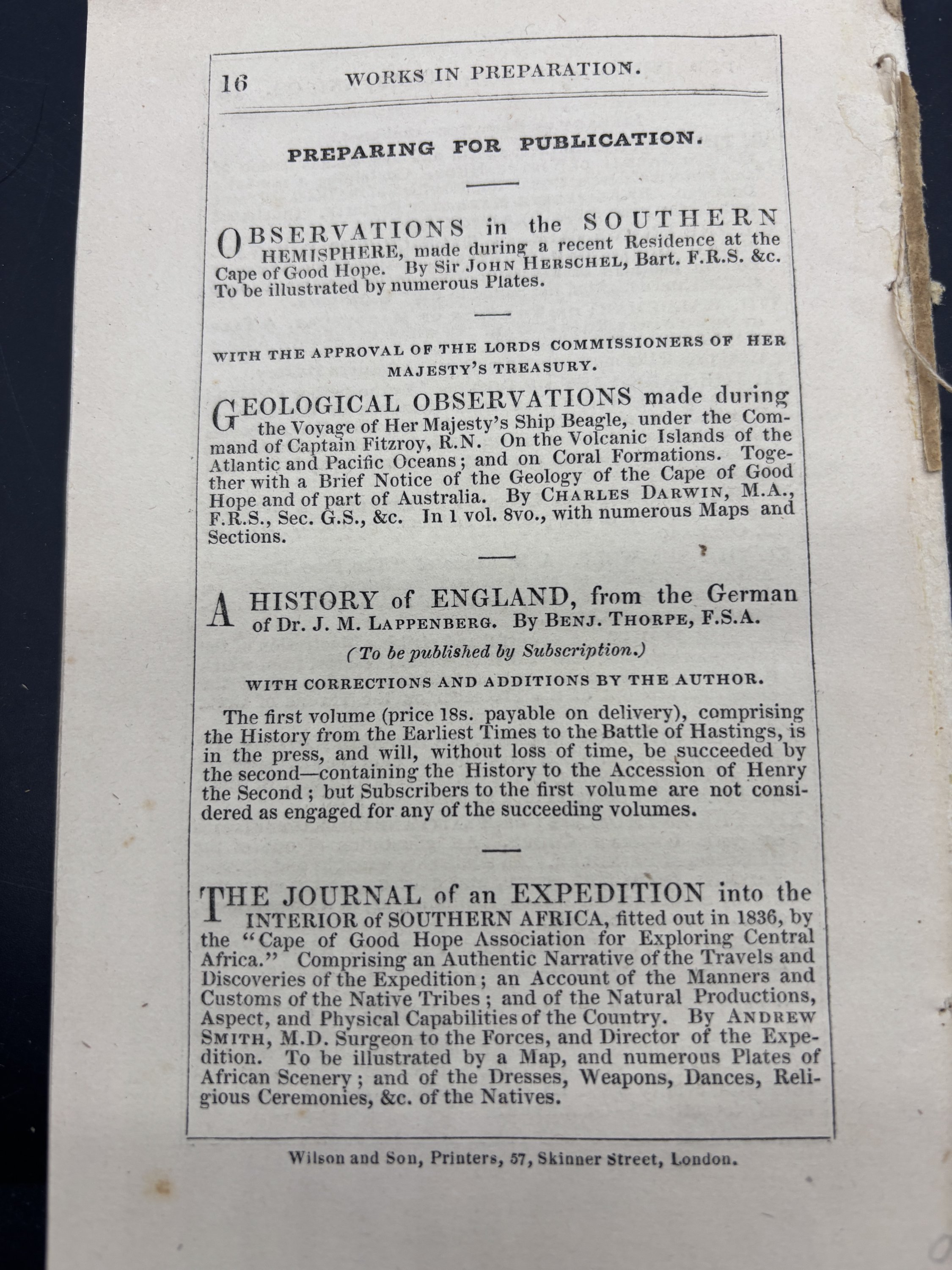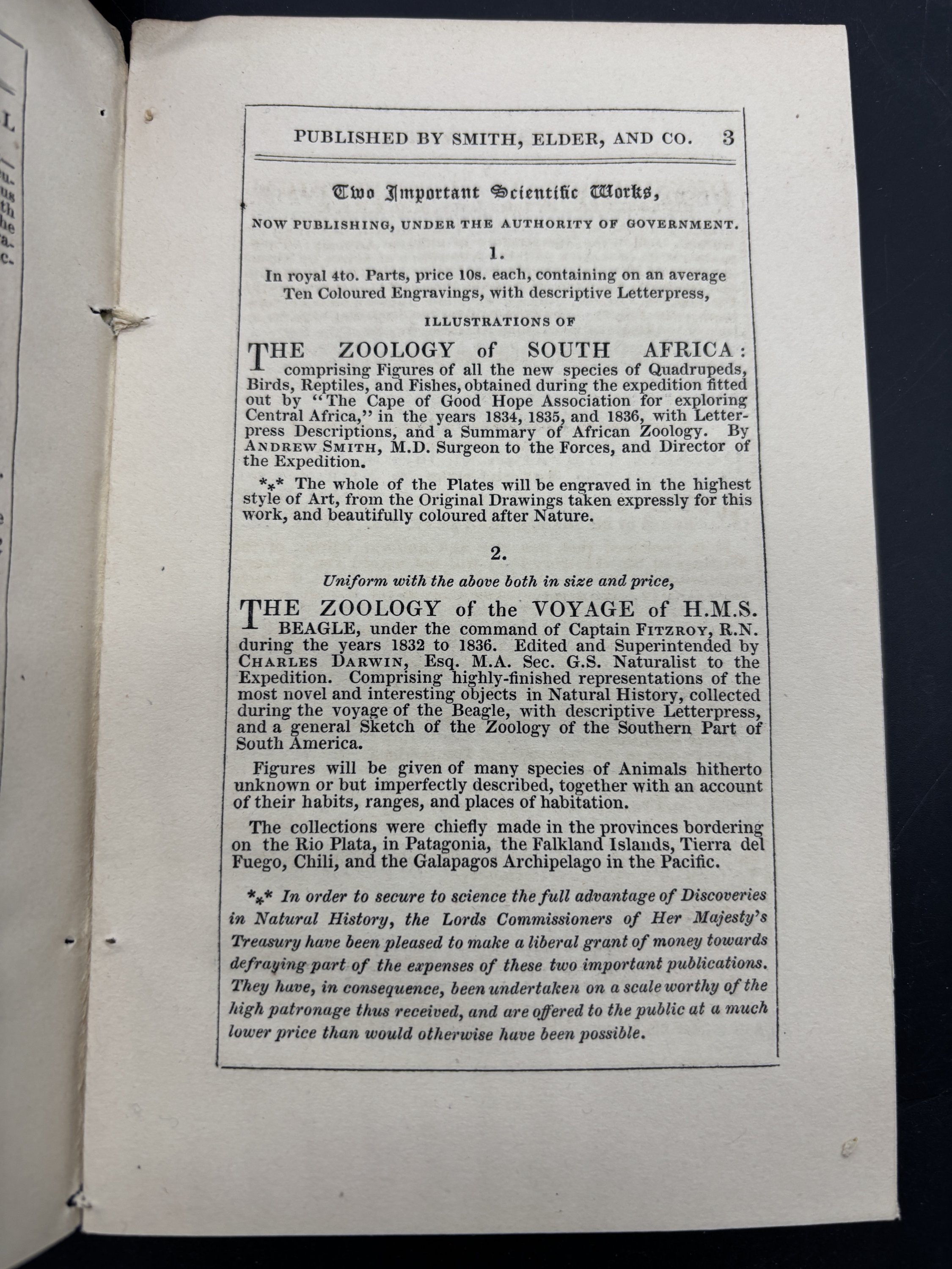 Scarce 16 page catalog for Interesting Works Recently Published by Smith, Elder, and Co in Cornell. It is from May of 1839 and is advertising the monumental and important work, The Zoology of the Voyage of HMS Beagle by Charles Darwin. It also includes the History of Upper and Lower California and many other works. It is guaranteed original and in good condition.
