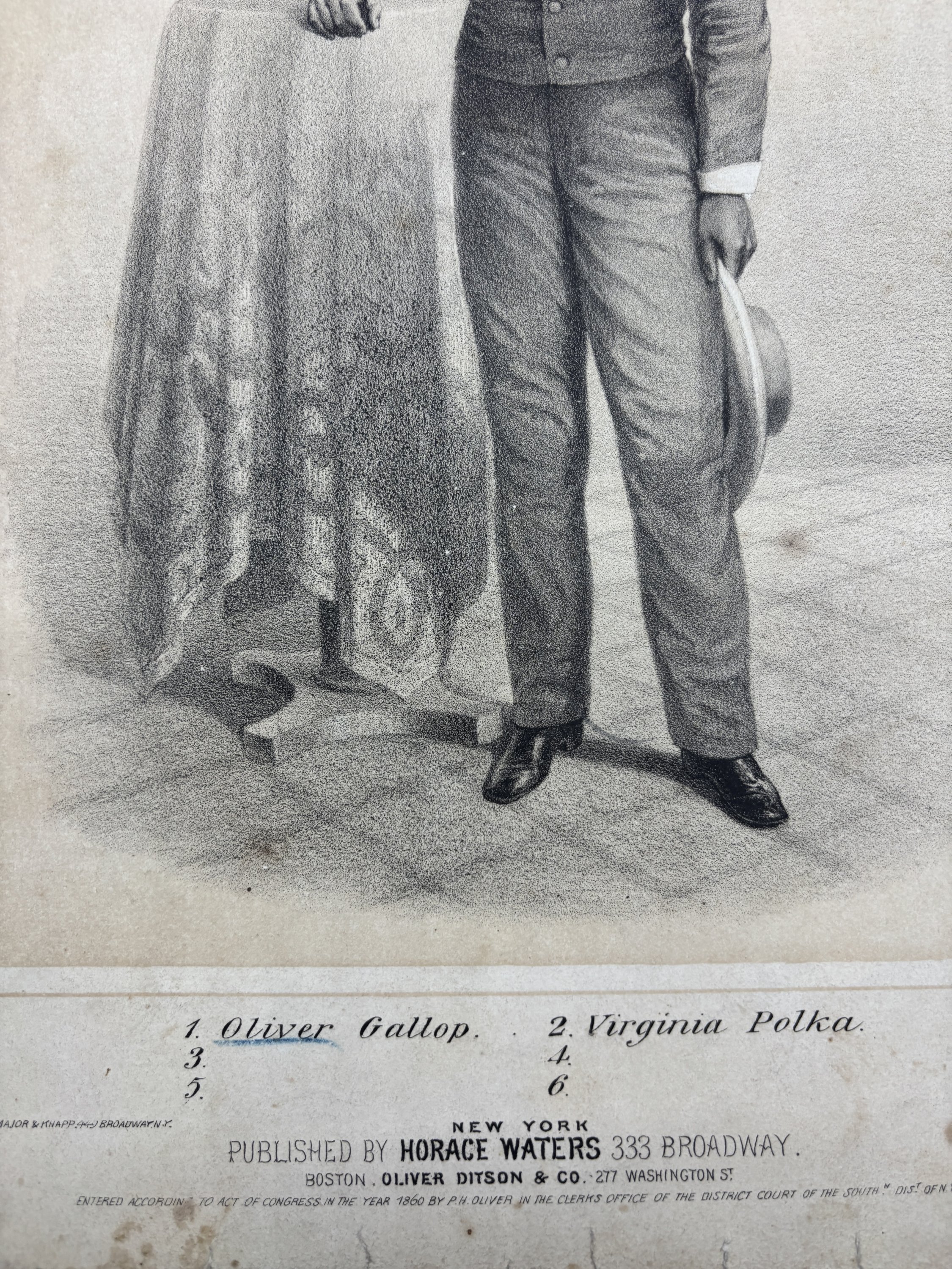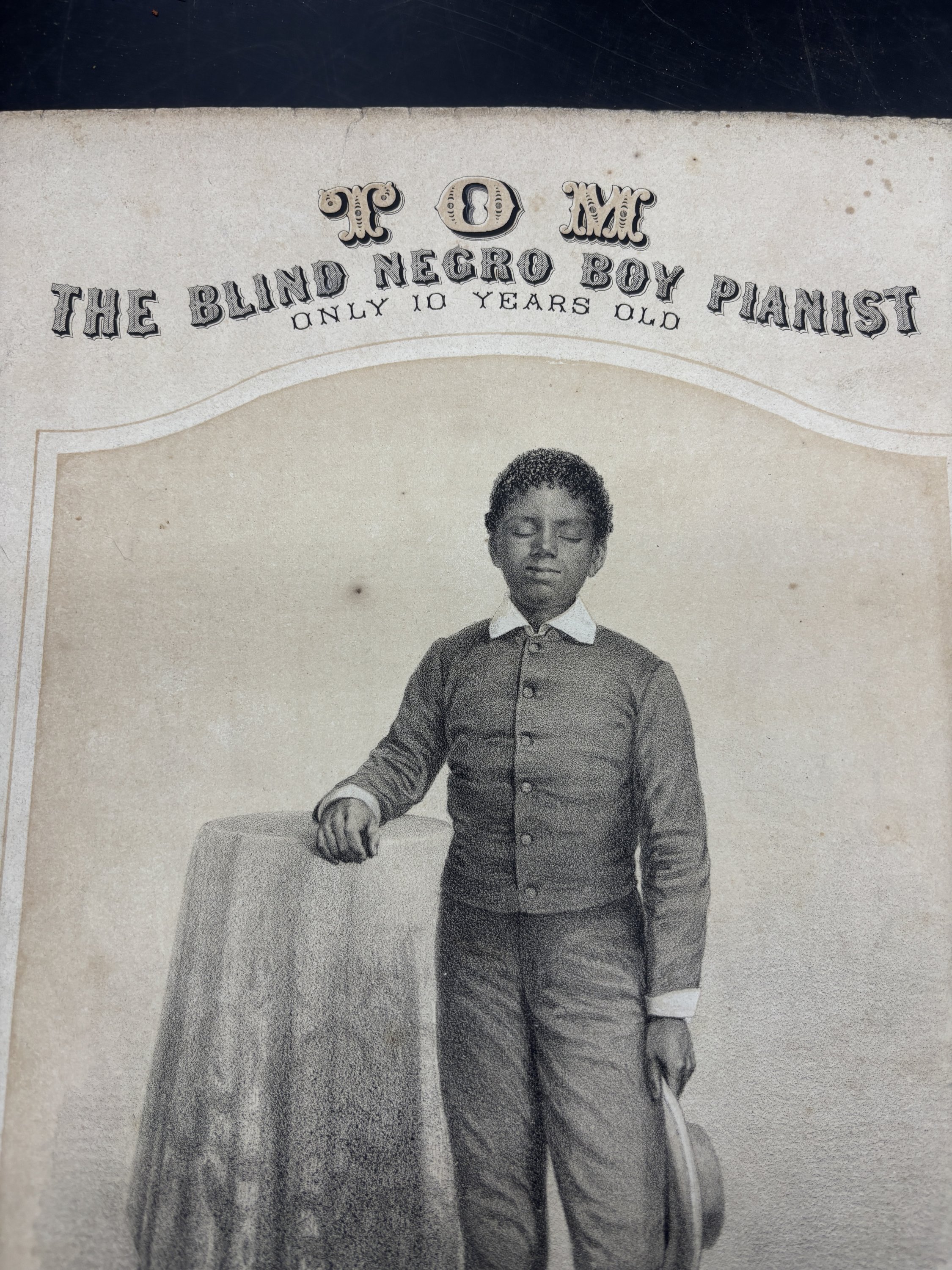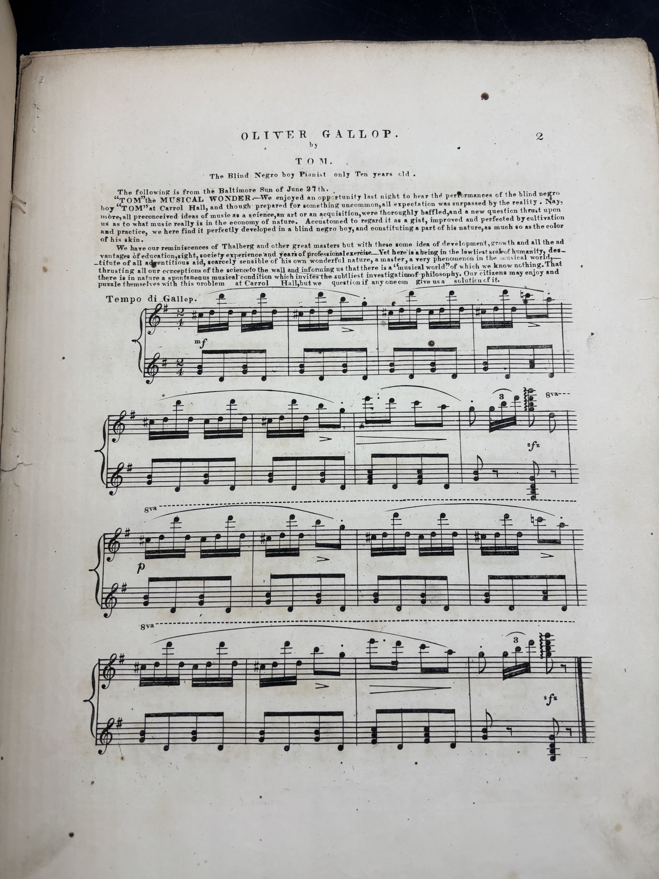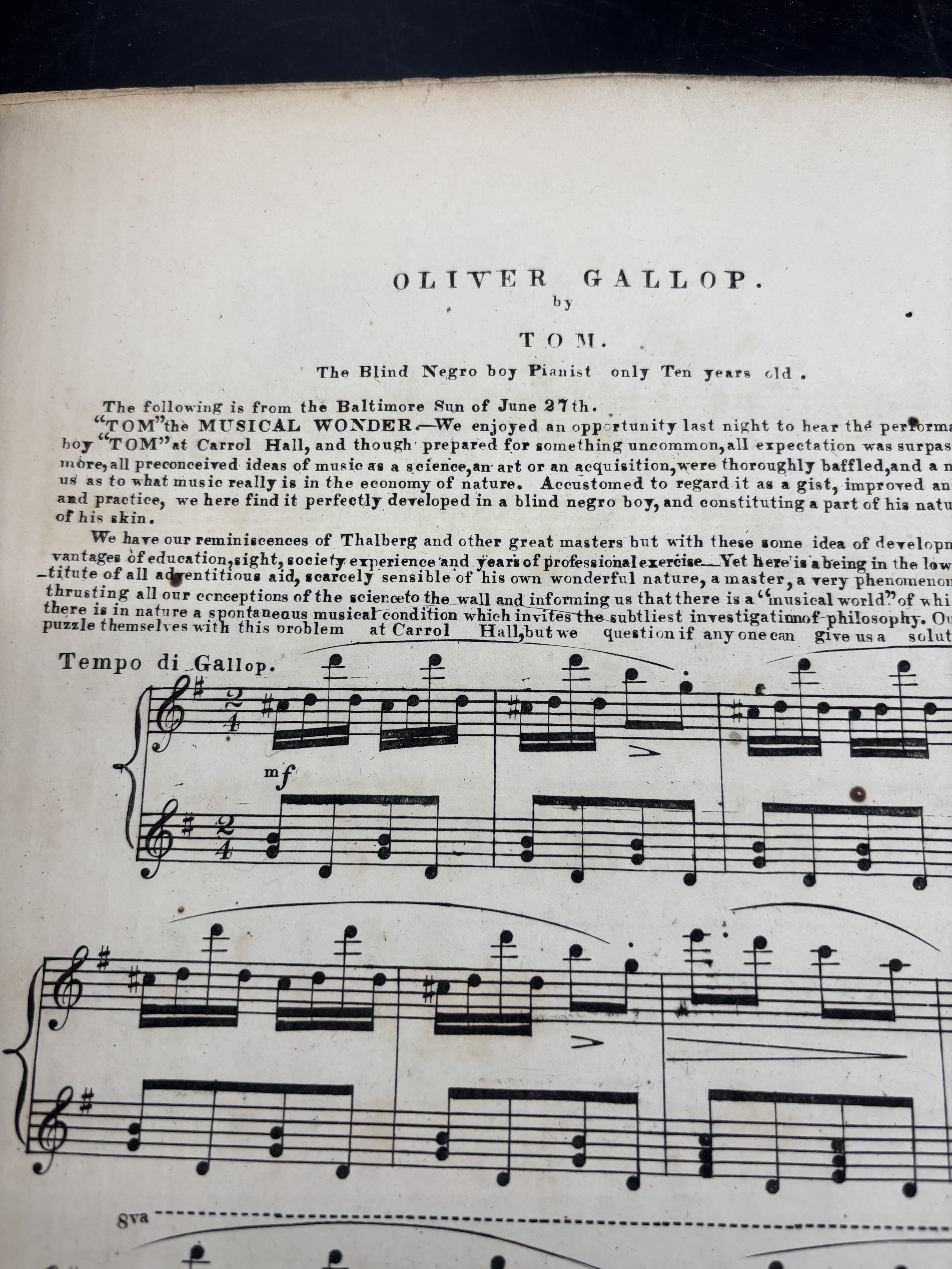 A wonderful scarce piece of sheet music featuring an illustrated cover of "Tom The Blind Negro Pianist". It was published in 1860 in New York and this is for the piece, "Oliver Gallop". Blind Tom, born a slave in Columbus GA was a piano virtuoso. It is guaranteed original and in good condition.