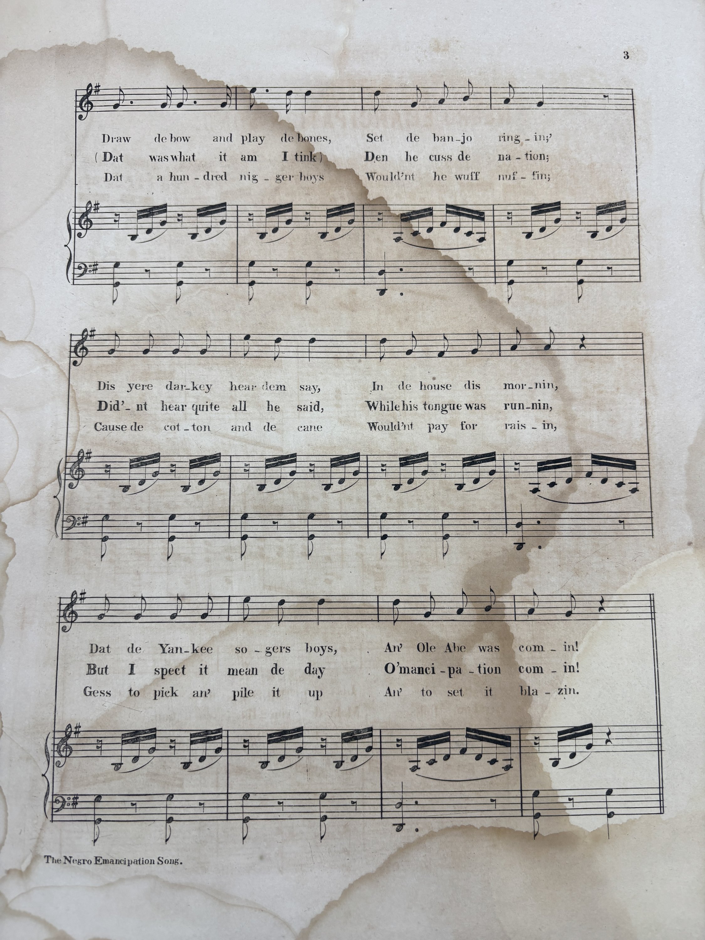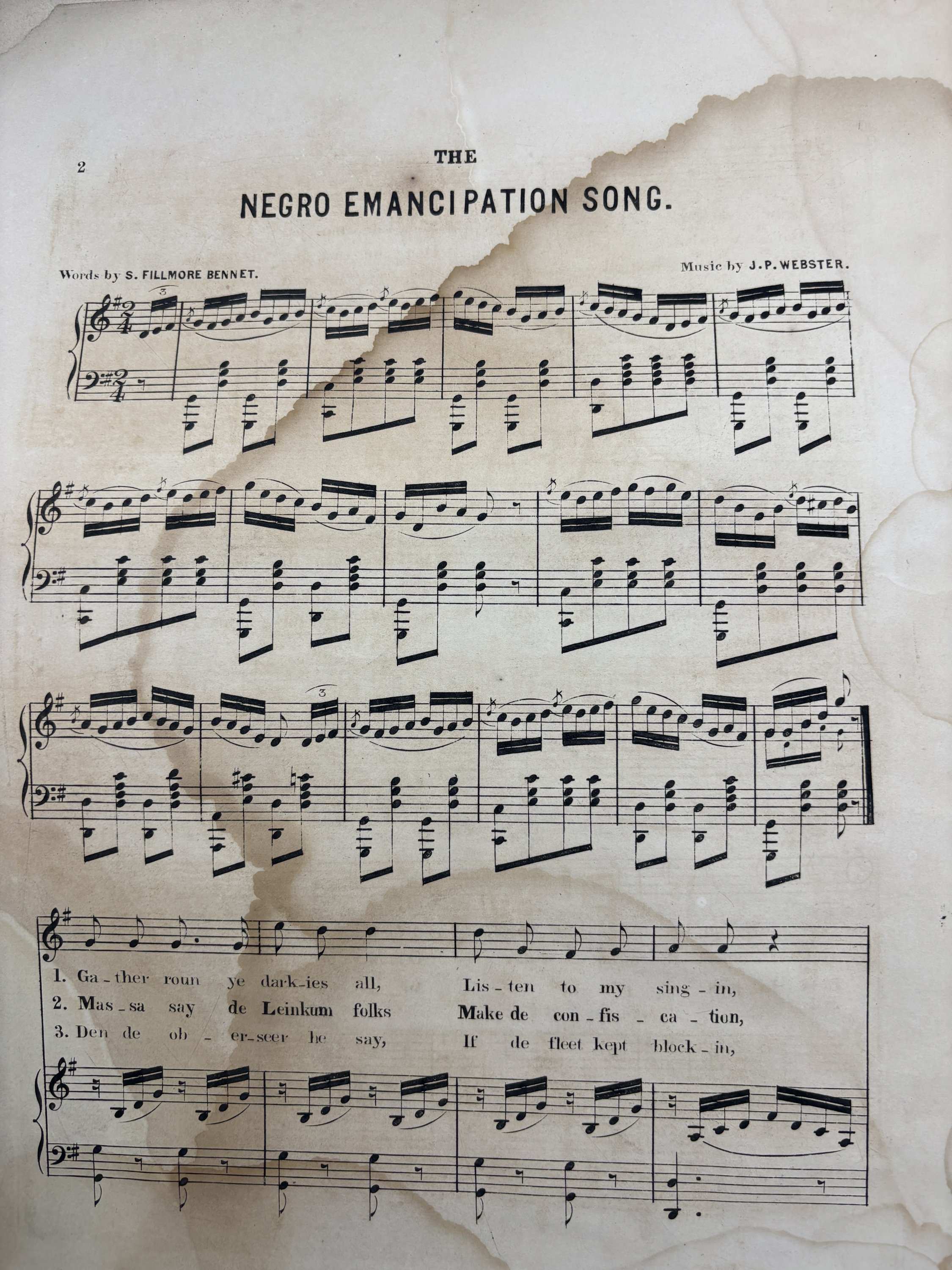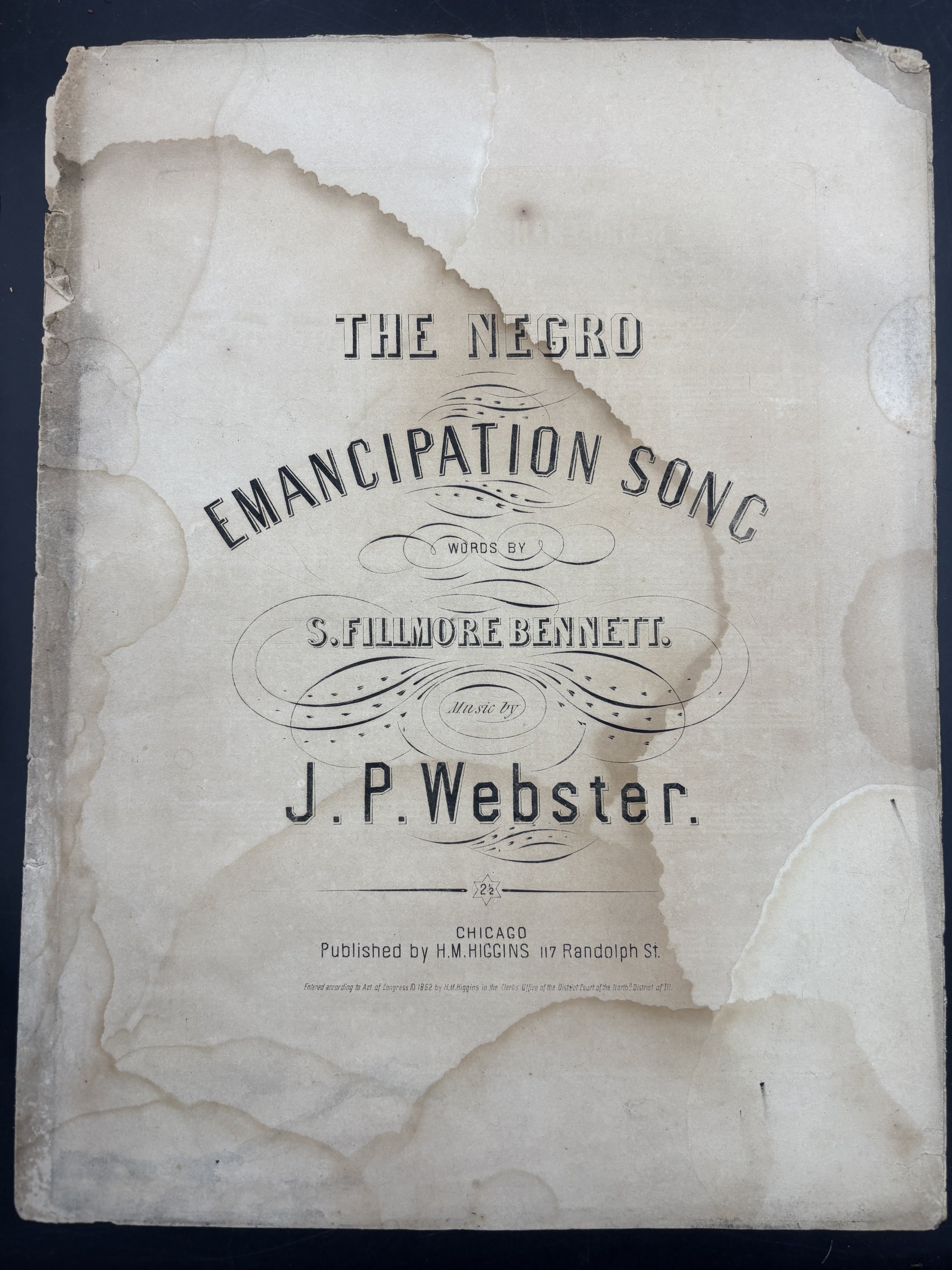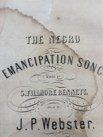 This is a very scarce piece of African-American music history. It is entitled The Negro Emancipation Song by J.P. Webster and Fillmore Bennett. It was published in 1862 in Chicago and is guaranteed original.