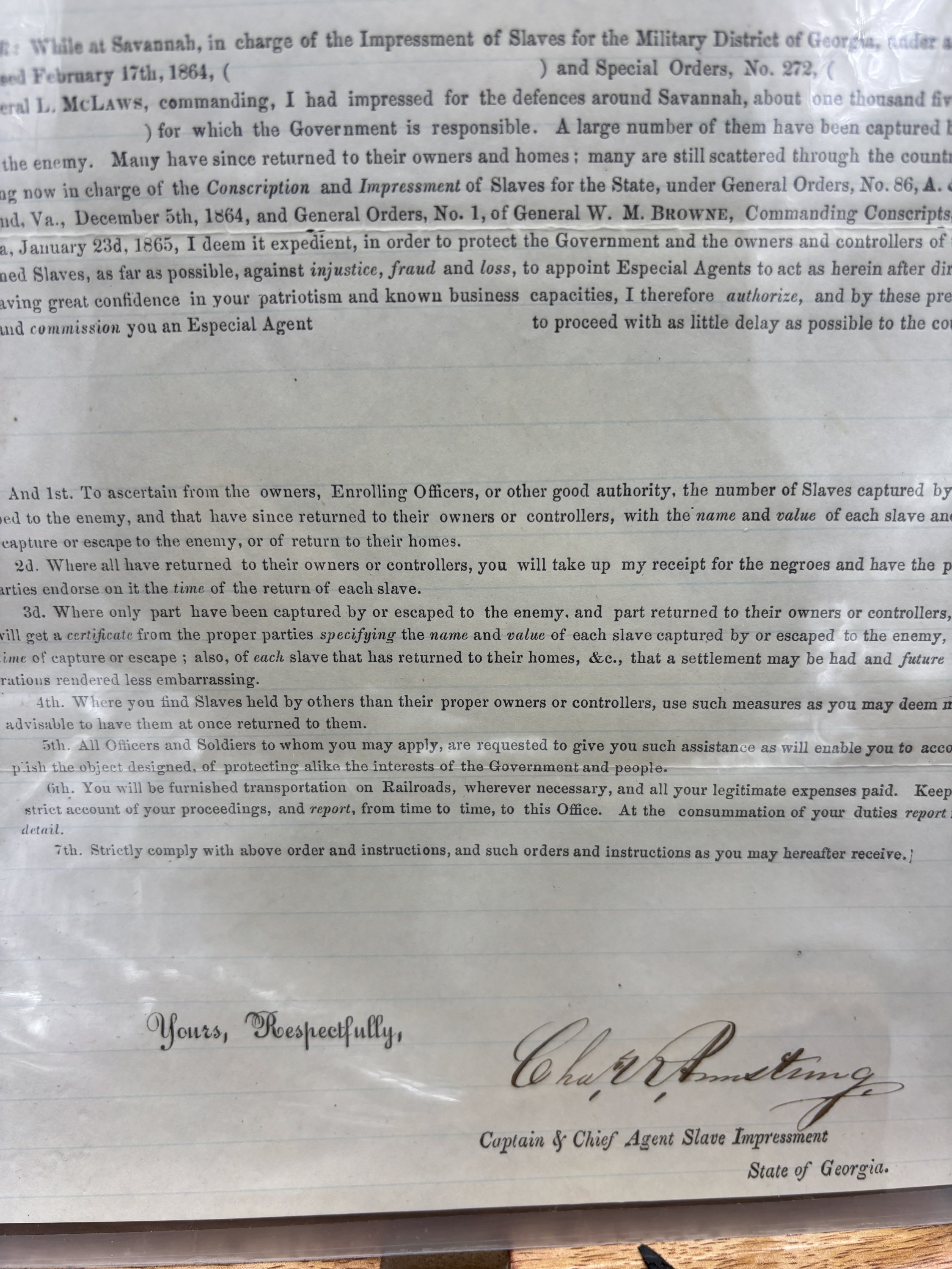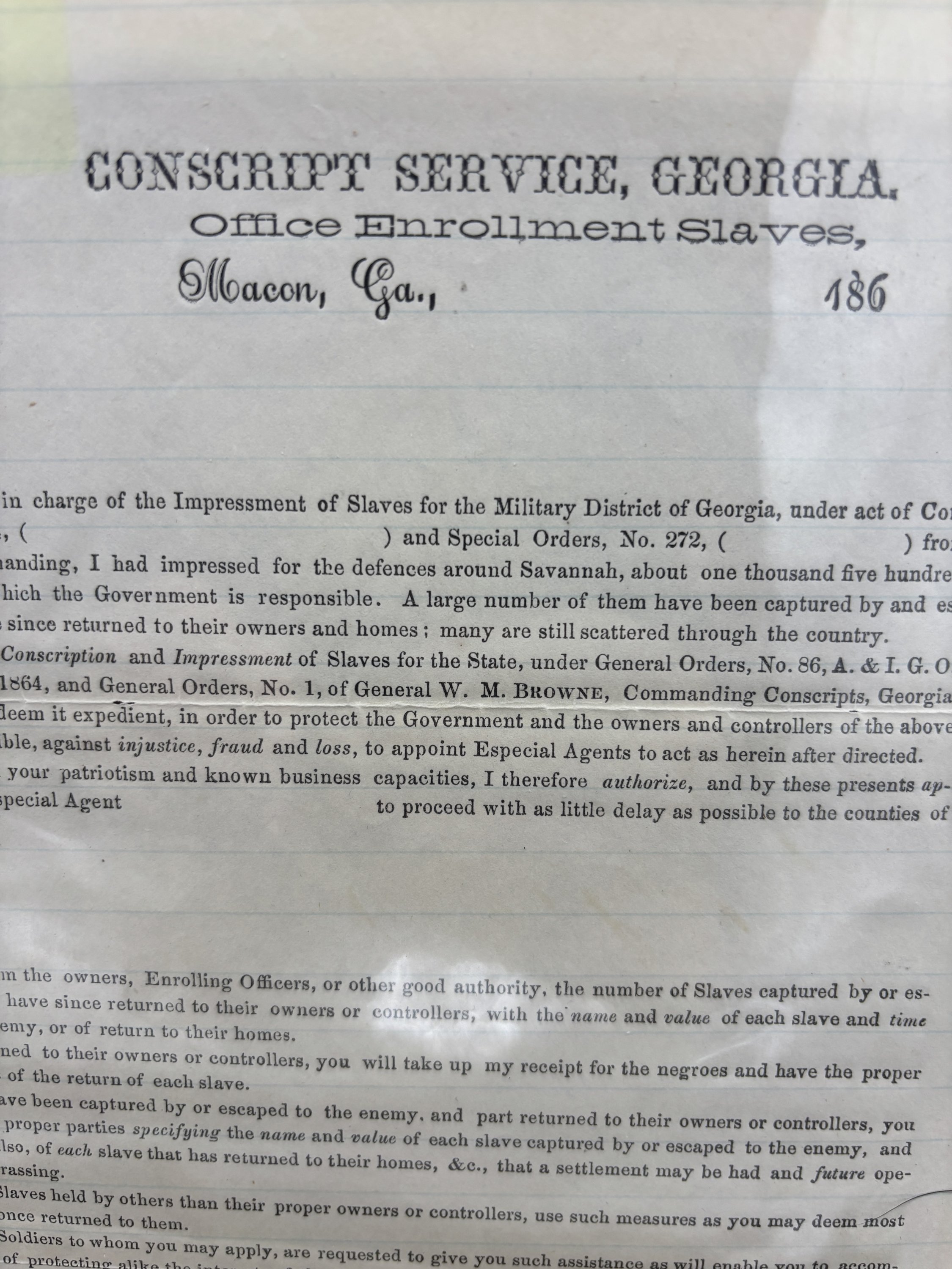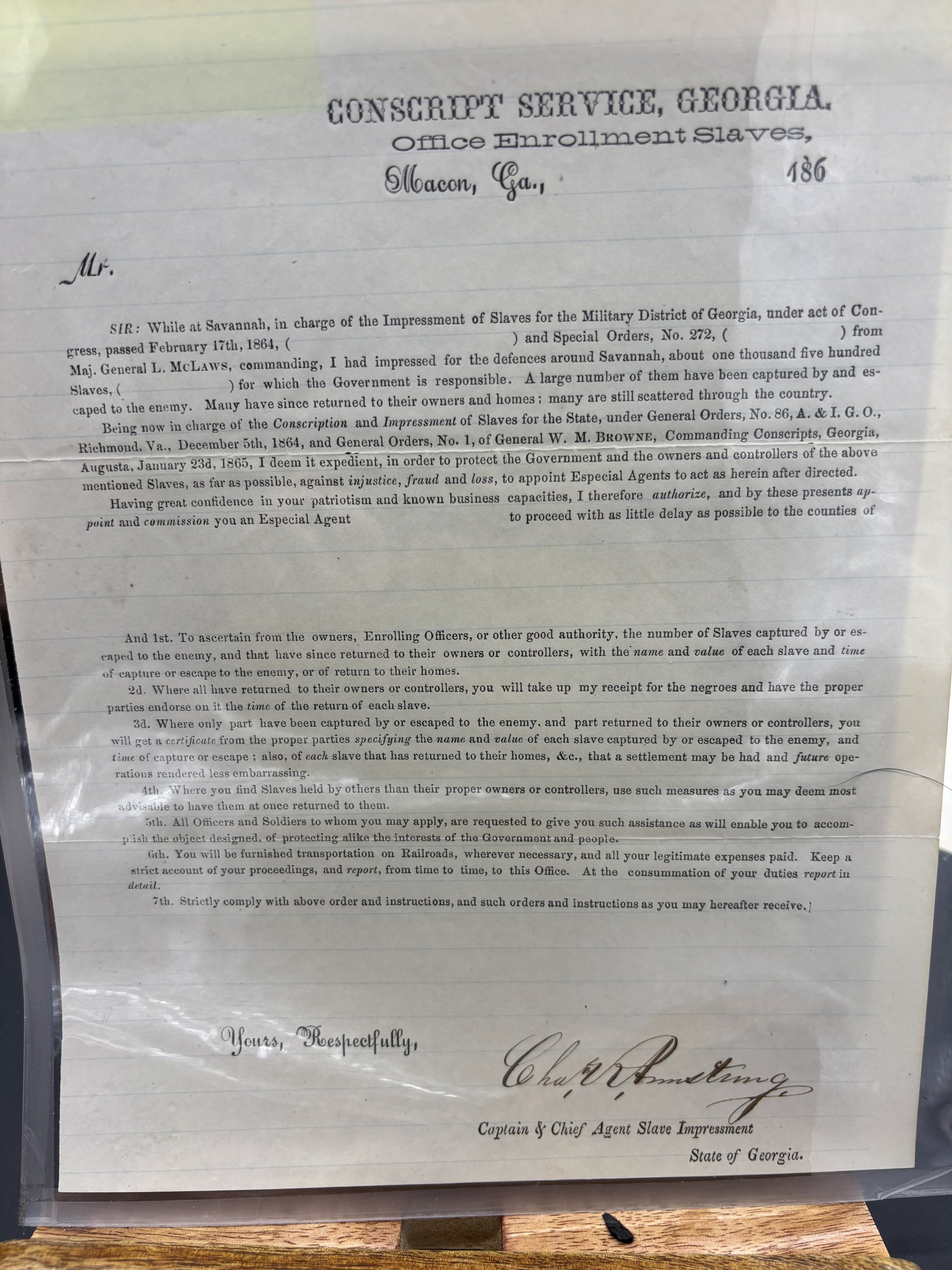 A scarce broadside from the Office of Enrollment Slaves, Conscript Service from Macon County, Georgia from 1864. It is a broadside detailing the Confederate Slave Impressment Authorization to enlist slaves to fight for the Confederate army during the Civil War. It is guaranteed original and in good condition.