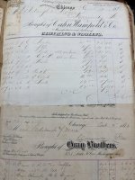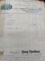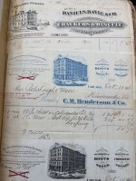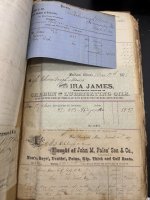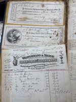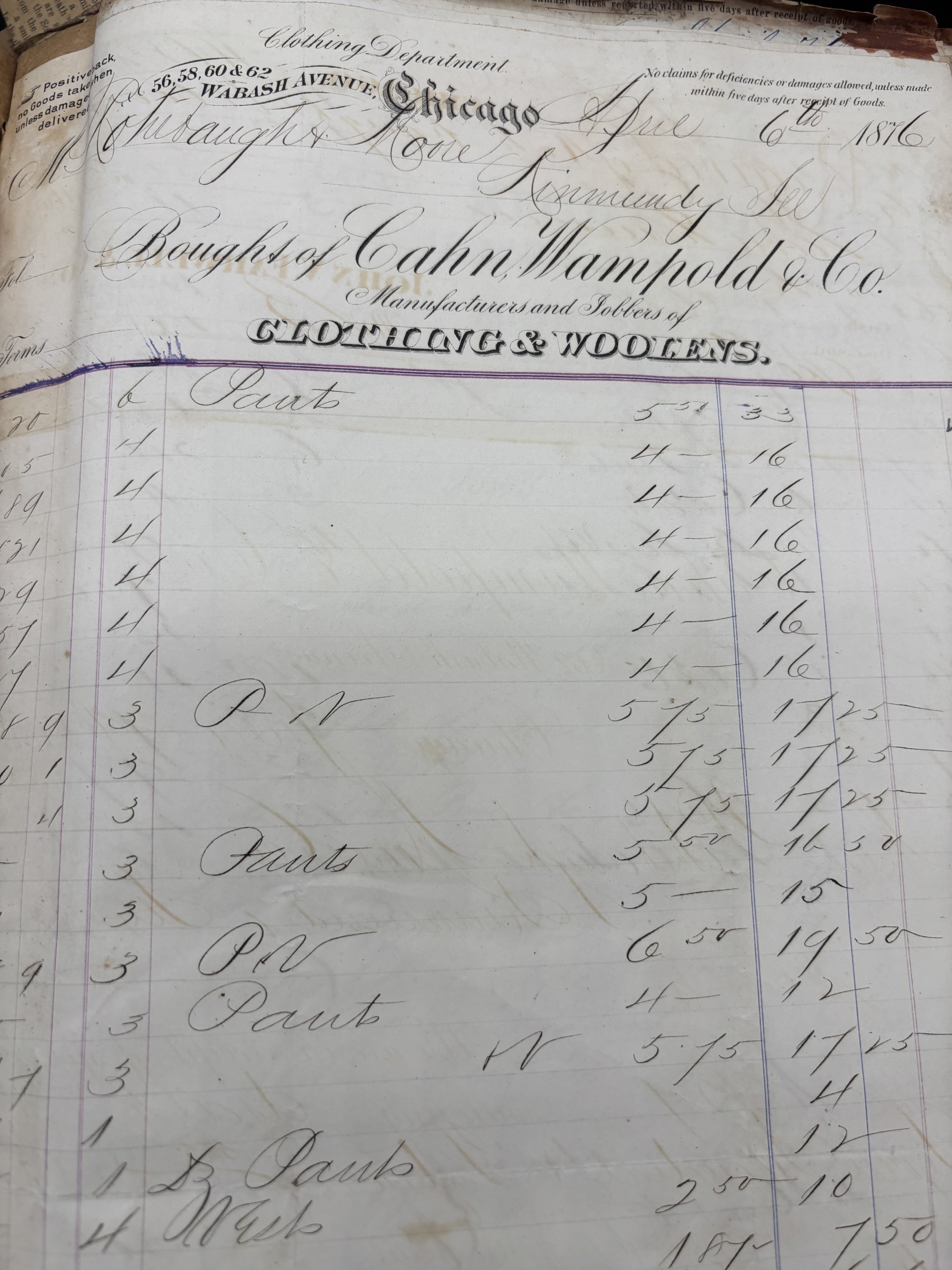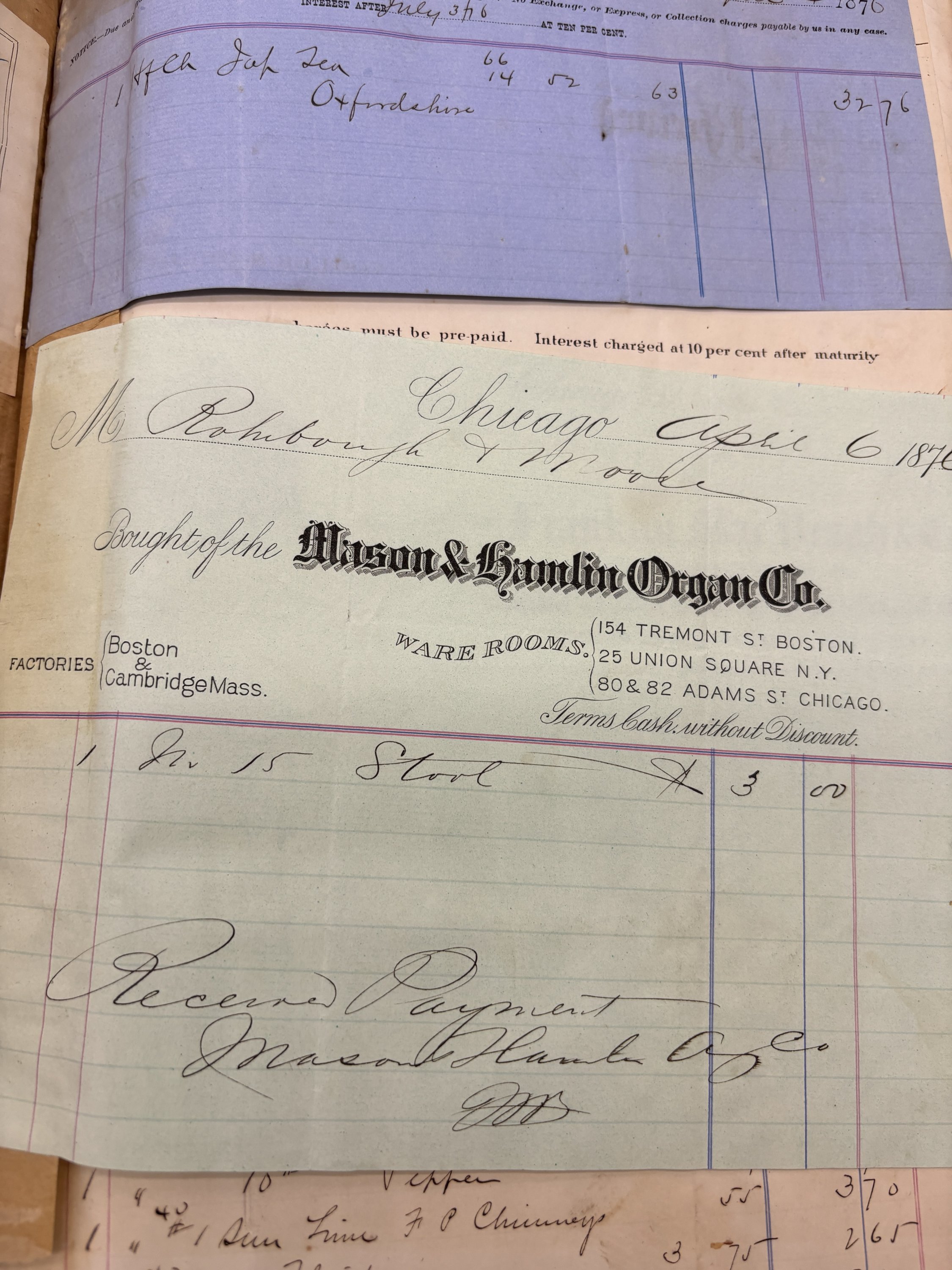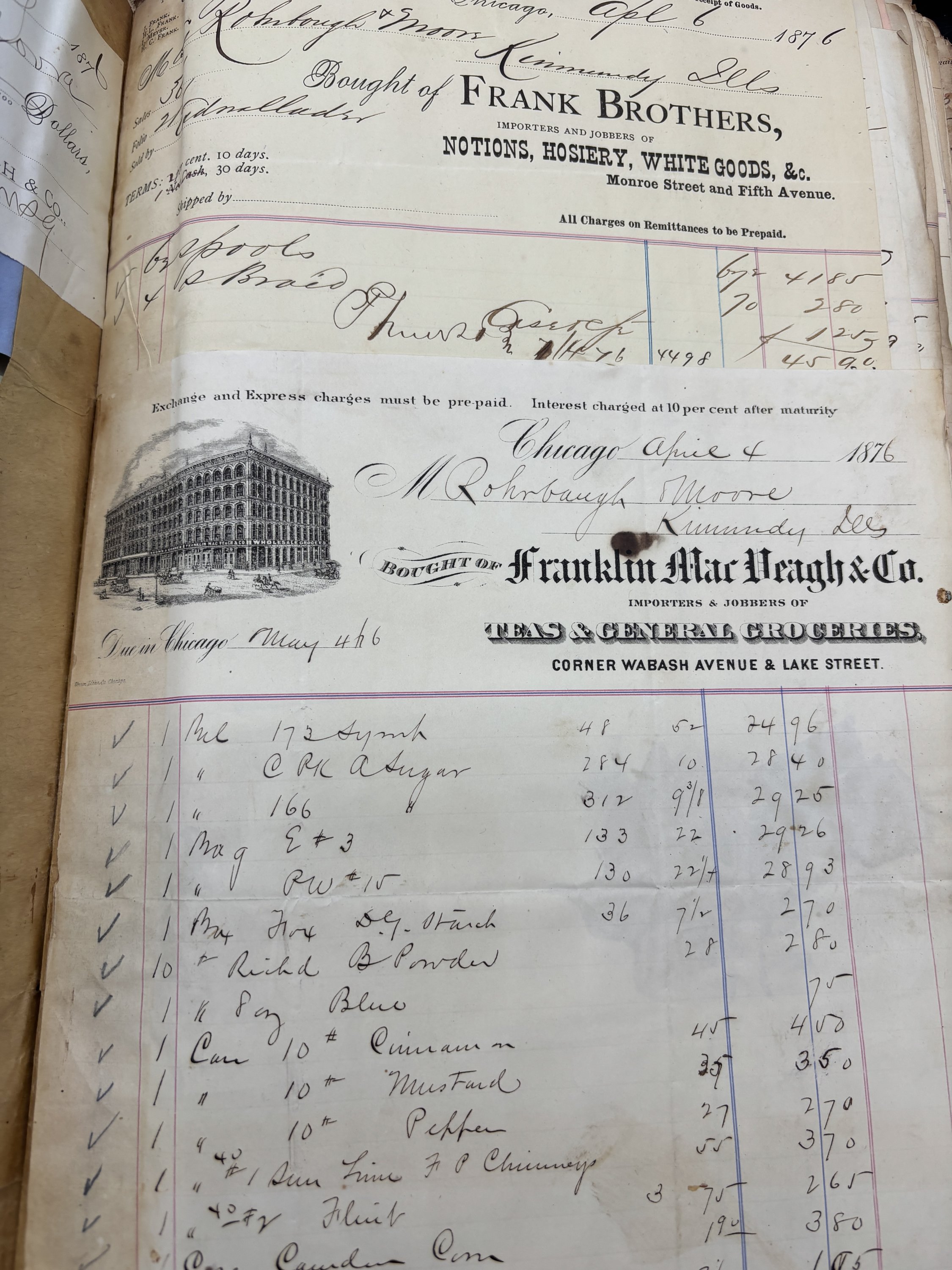 A very large scrapbook featuring over 1000 invoices from primarily Chicago businesses from 1873 to 1876. They are for the company Rohrbough and Moore and are from many different businesses including auction companies, shoe companies, clothing companies, and many more. Many of these companies were important in the rebuilding of Chicago after the Great Fire of 1871. An interesting collection.