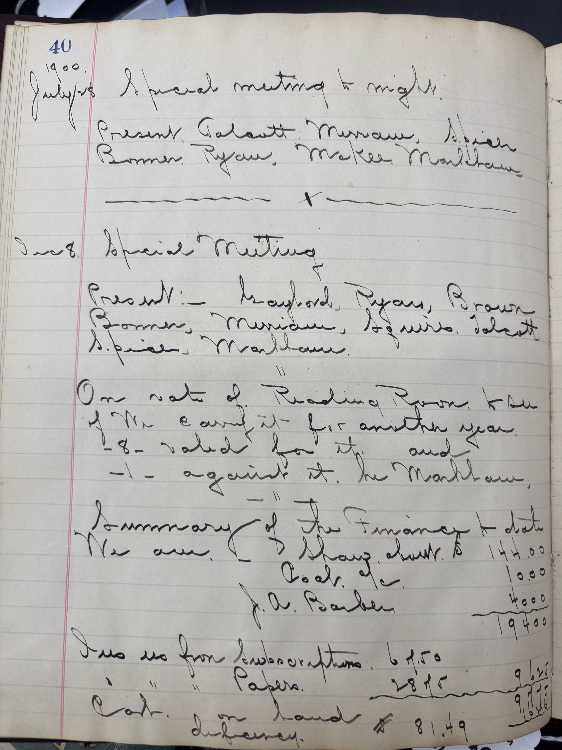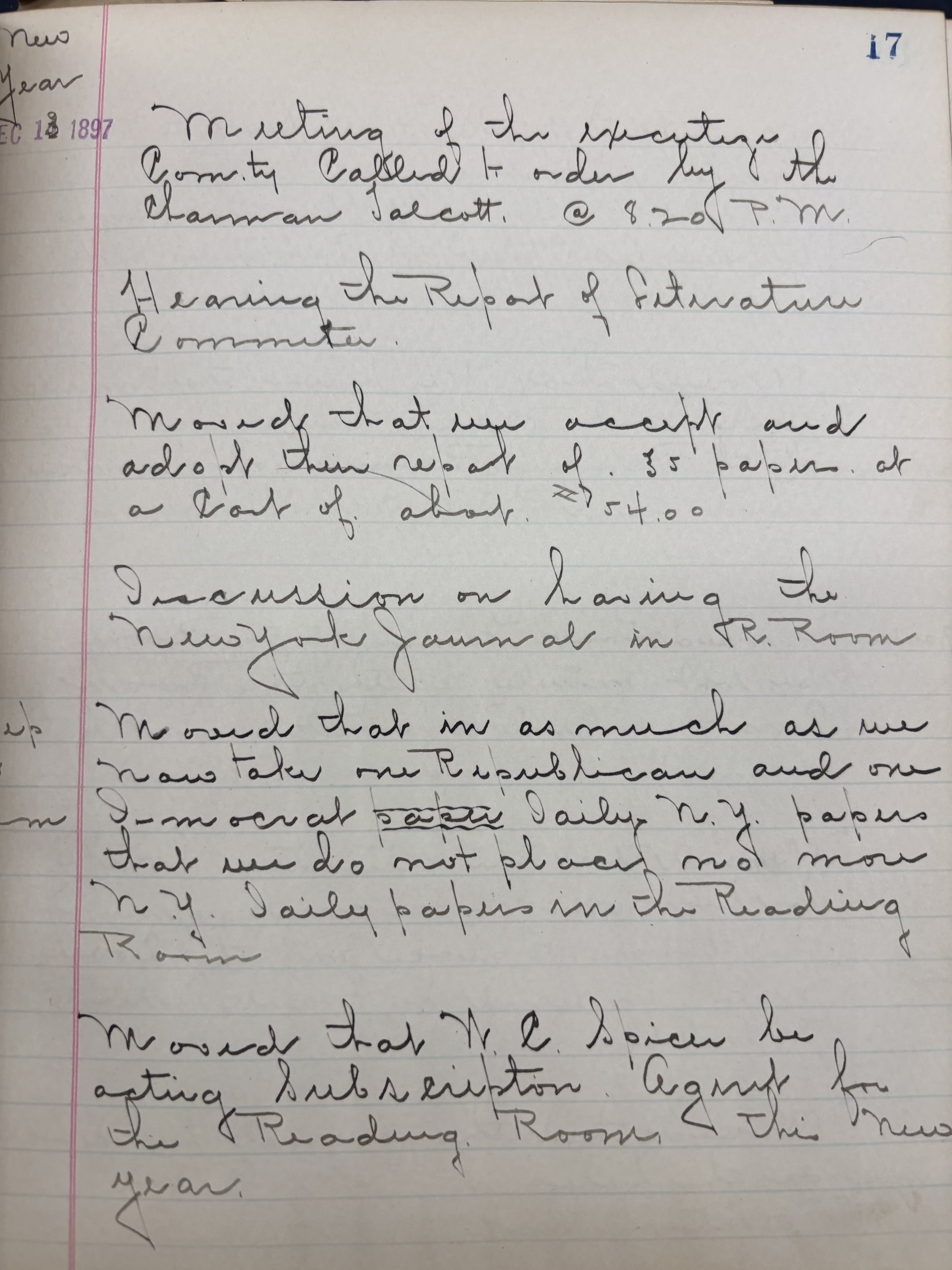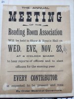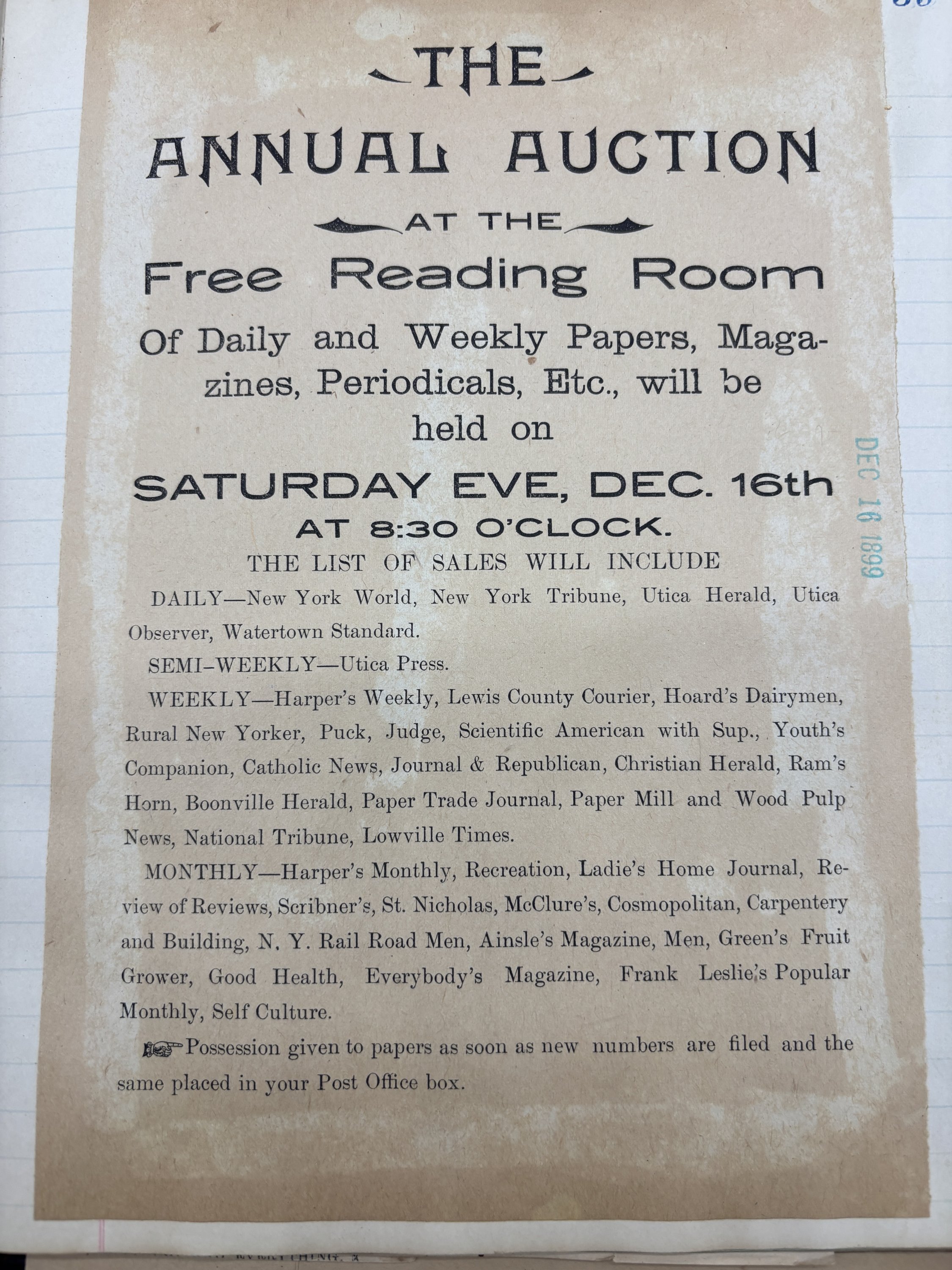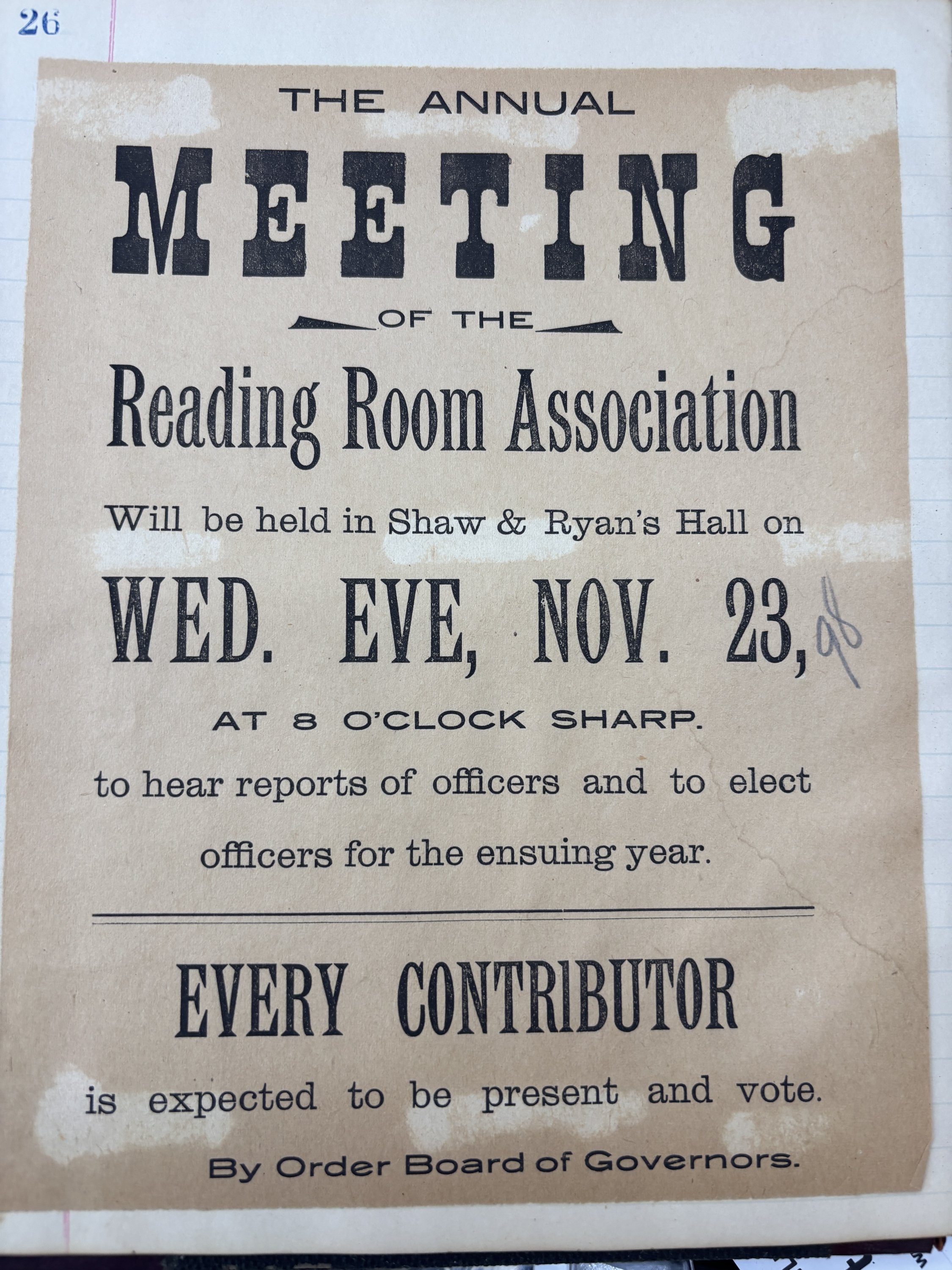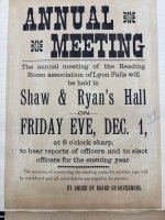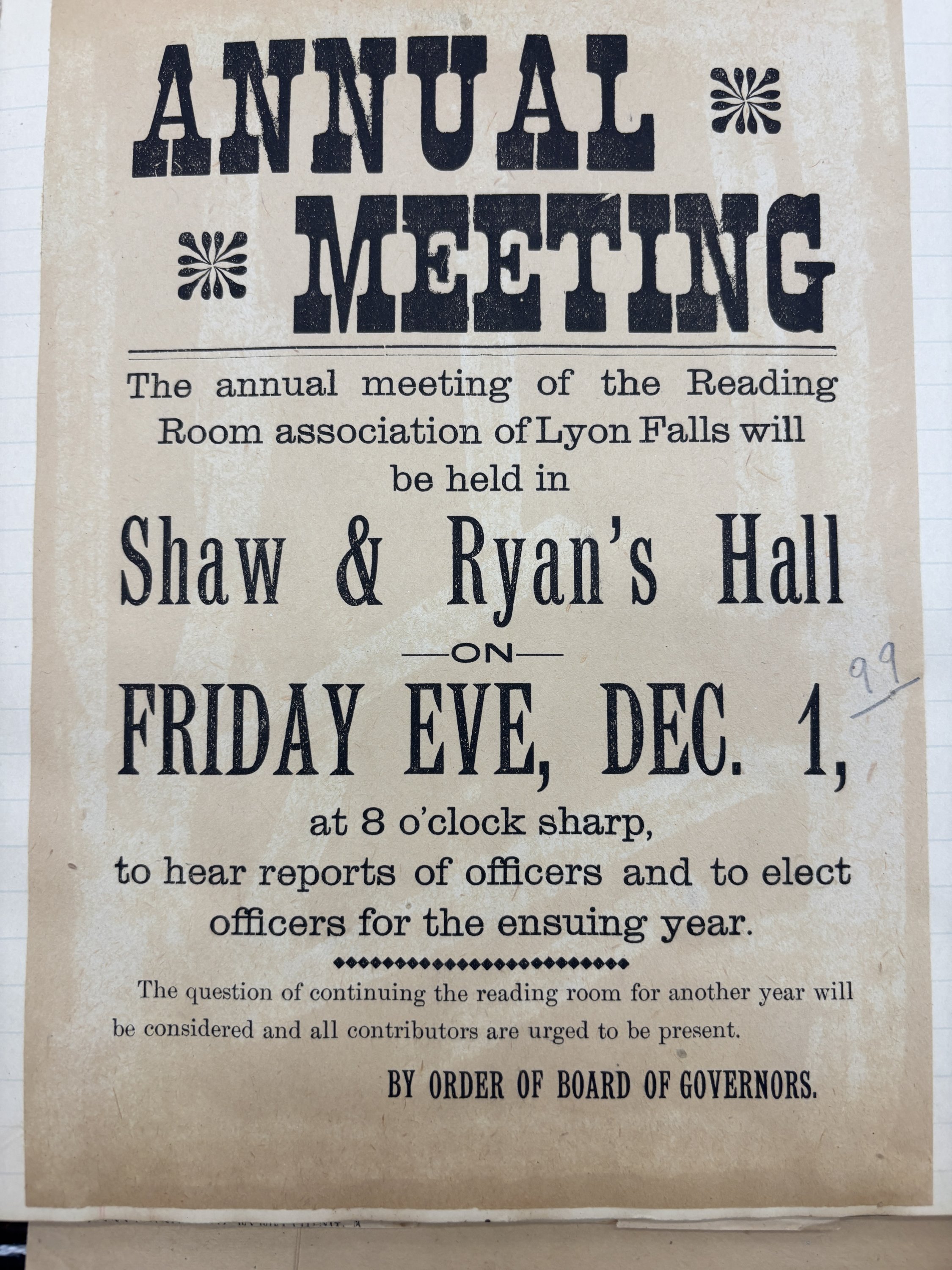 This is a wonderful 1890s manuscript minute book for the Lyon Falls Free Reading Room New York. It includes a number of broadsides for various meetings along with other ephemera. It is guaranteed original.