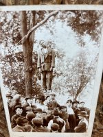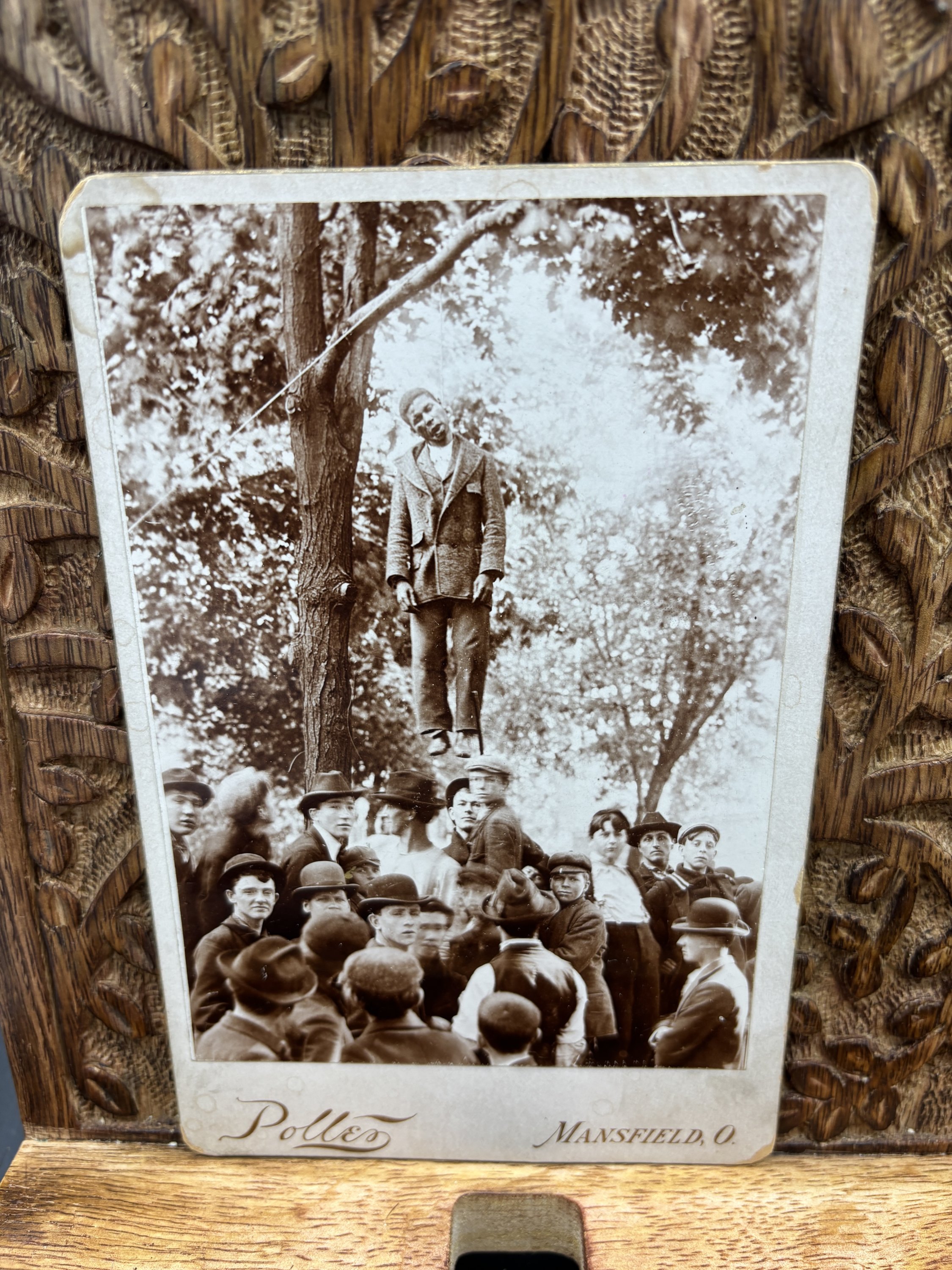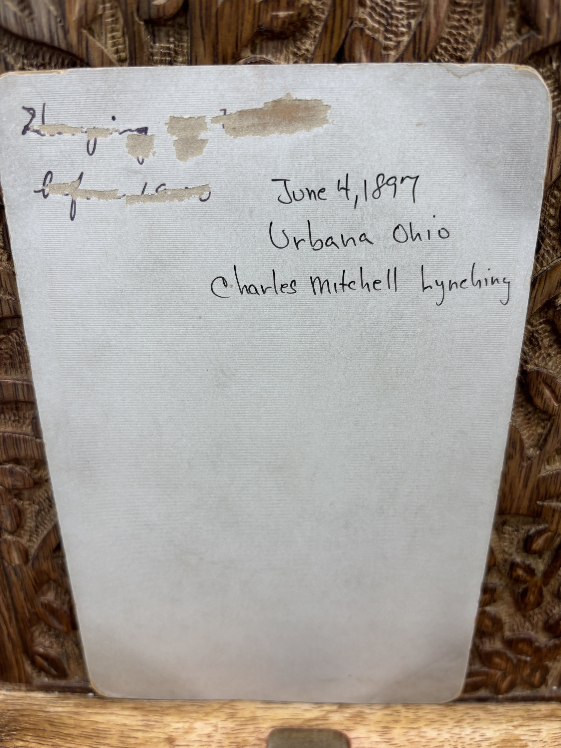 A sad and unfortunate piece of history being a cabinet card photograph of a lynching that took place in 1897. It is identified as Charles Mitchell, an African-American man from Mansfield, Ohio who was accused of assaulting a white woman. It is guaranteed original.