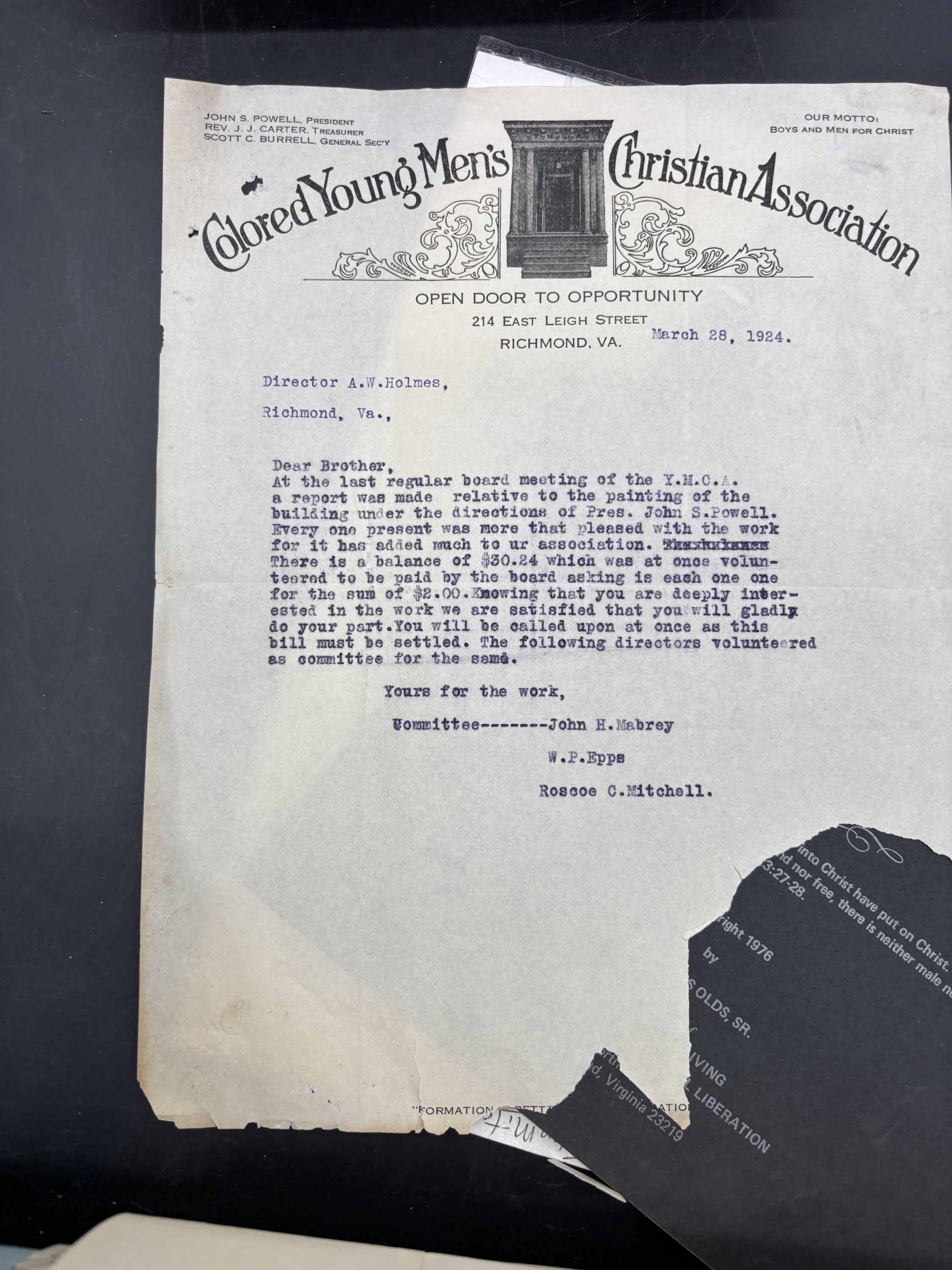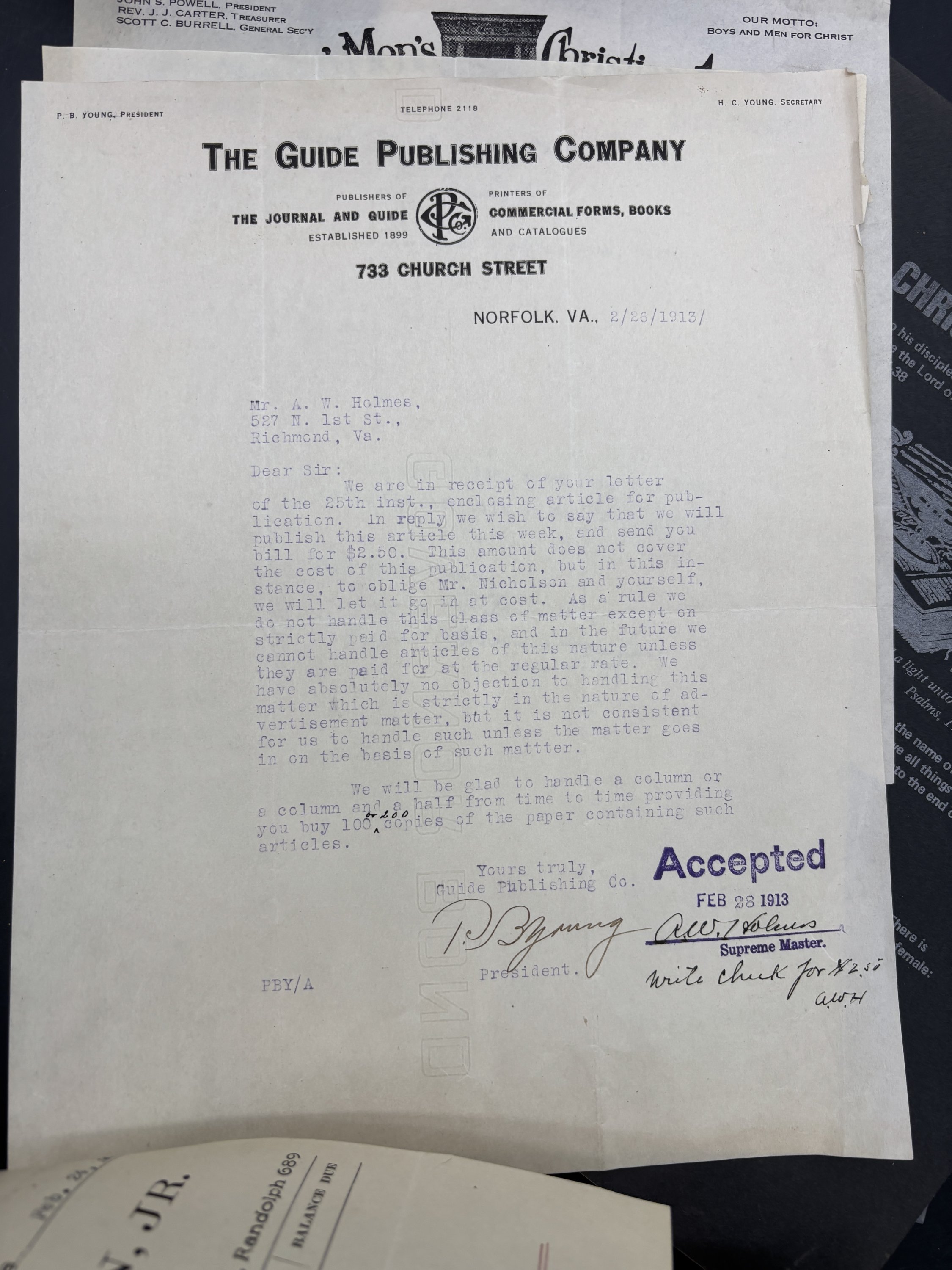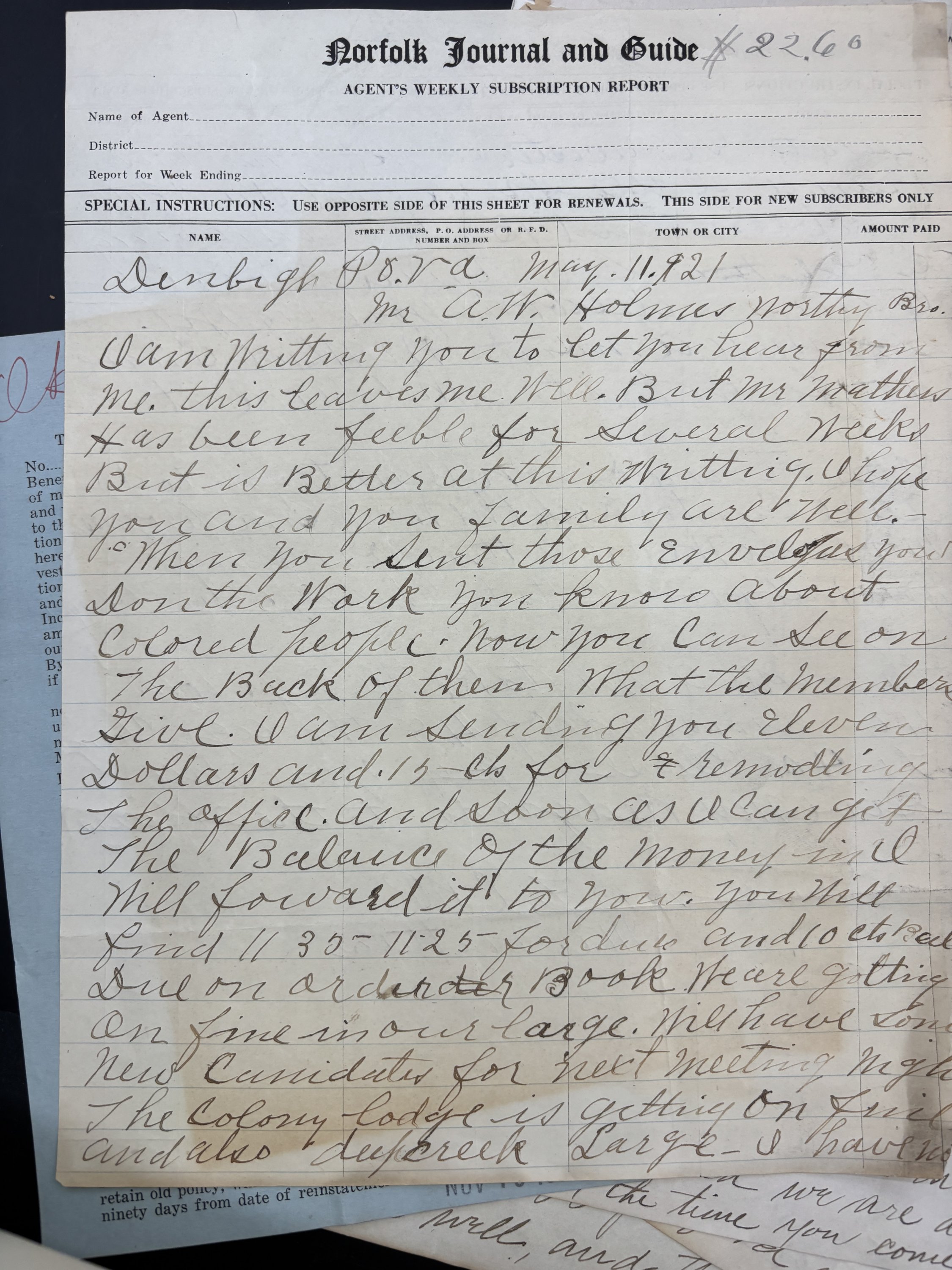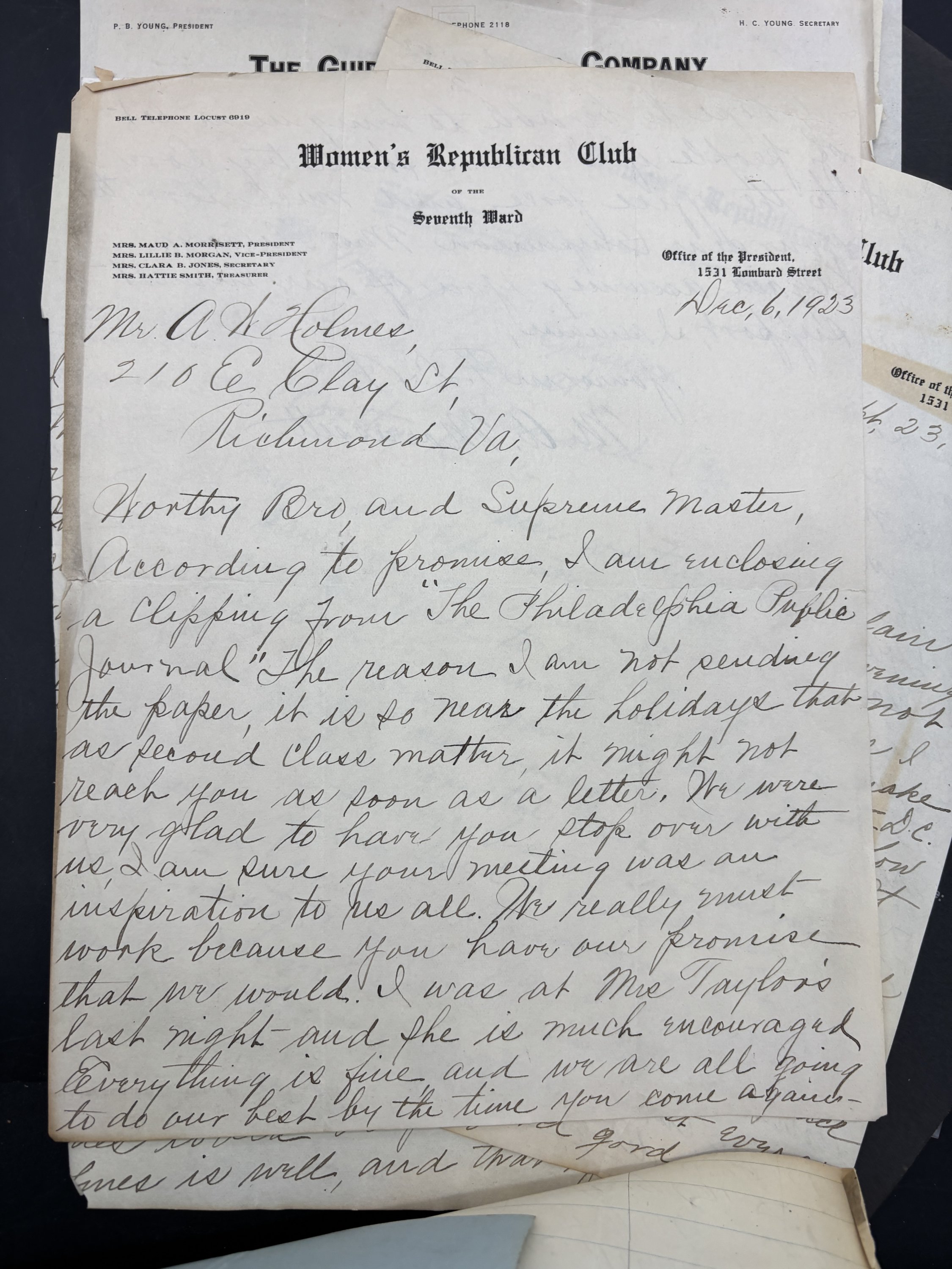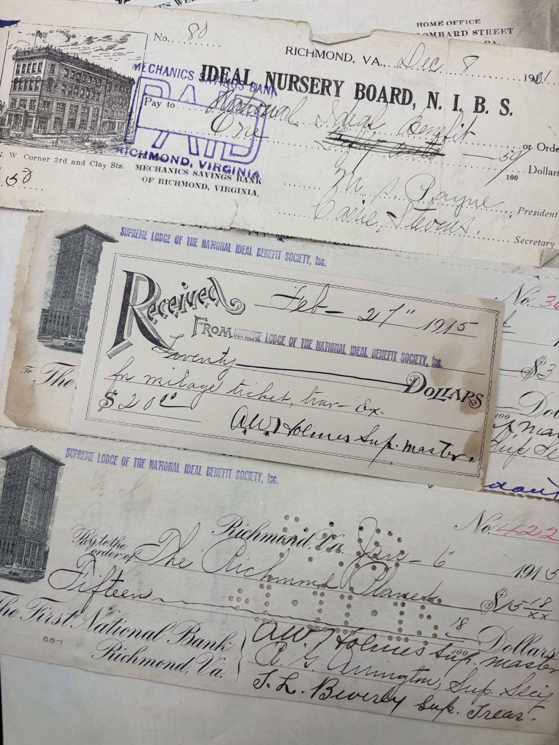 An archive of 27 letters, books, and documents from the 1920s from the National Ideal Benefit Society, an African-American organization in Richmond, Virginia. There are letters from the Norfolk Journal and Guide, the Women's Republican Club in Richmond, the Guide Publishing, the Colored YMCA, and other African-American organizations with interesting content.