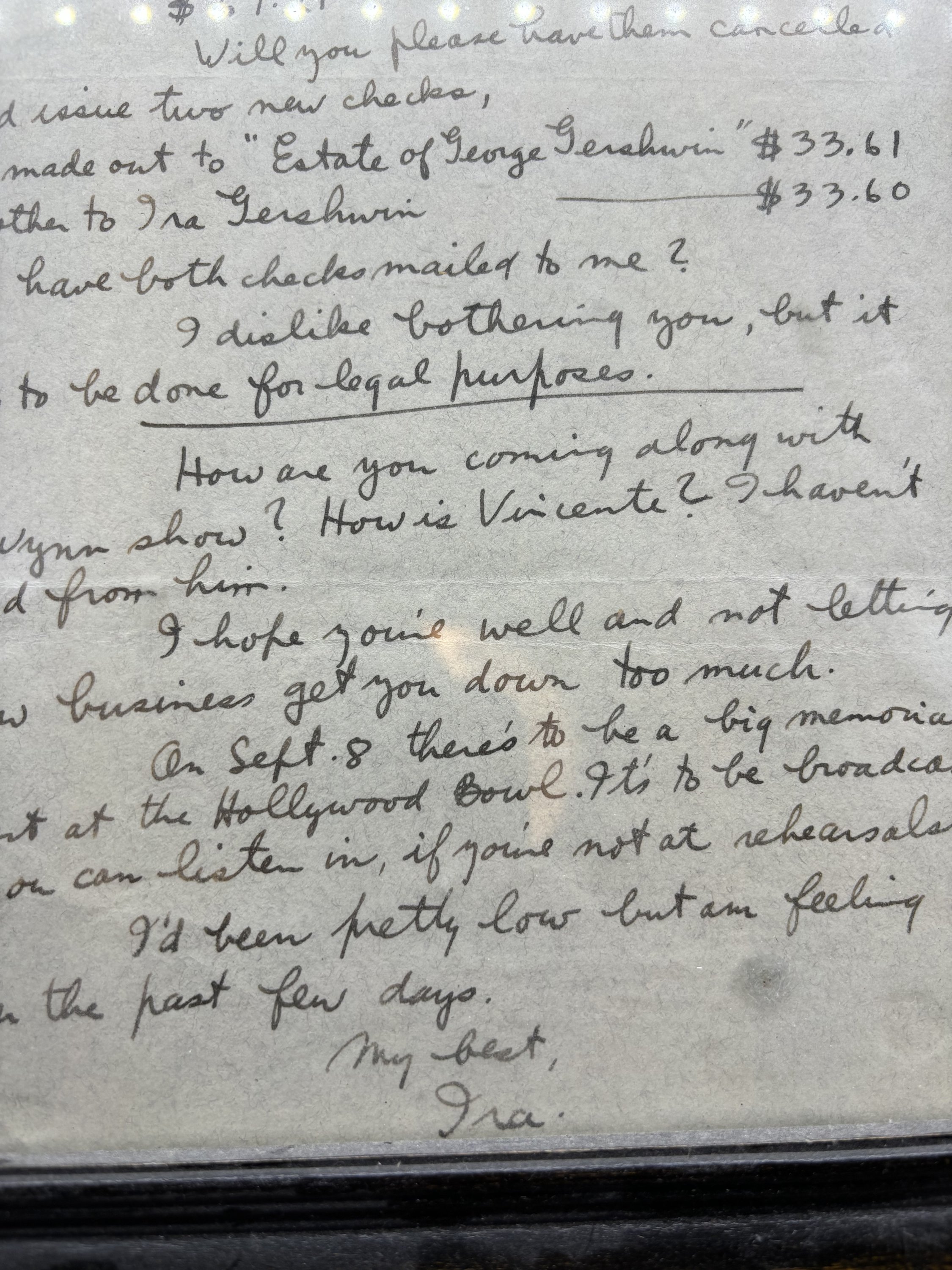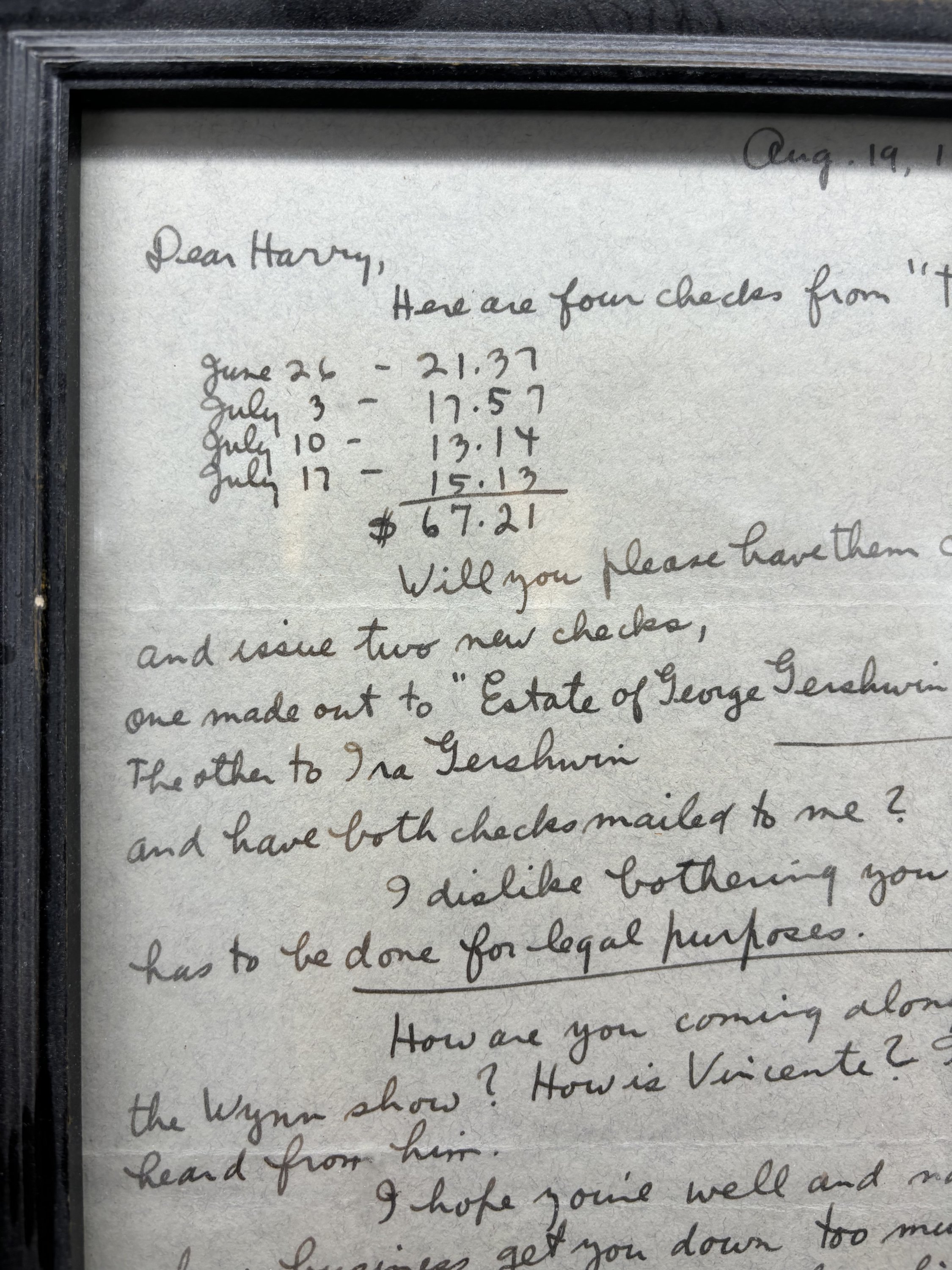 “Dear Harry, Here are four checks from The Show is on….Will you please have them cancelled and issue two new checks, one made out to Estate of George Gershwin and the other to Ira Gershwin and have both checks mailed to me?…How are you coming along with the Wynn show? How is Vincente? I haven’t heard from him. I hope you’re well and not letting show business get you down too much. On September 8th there’s to be a big memorial concert at the Hollywood Bowl. It’s to be broadcast so you can listen in if you’re not at rehearsals. I’d been pretty low but am feeling better the past few days. My best, Ira”